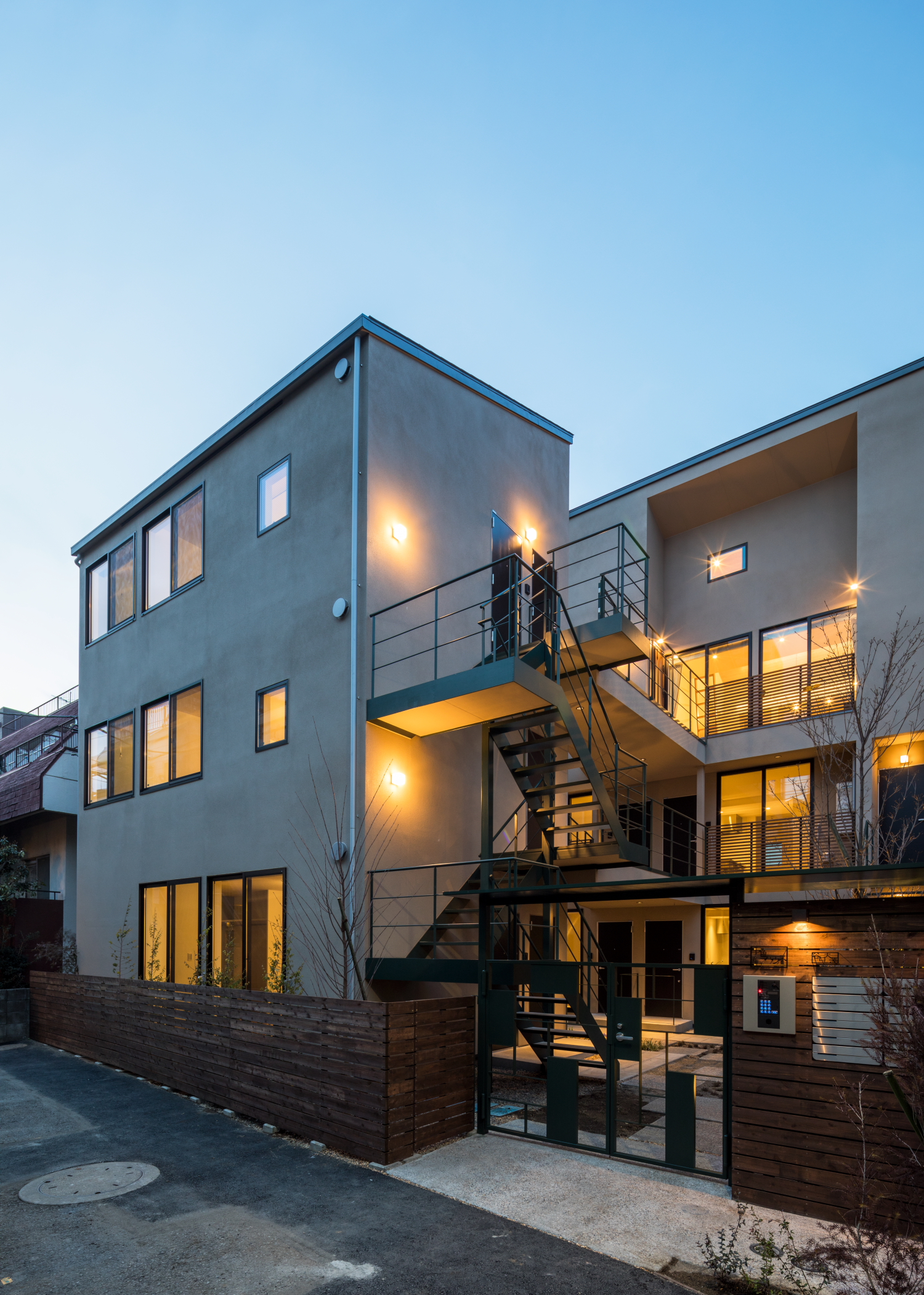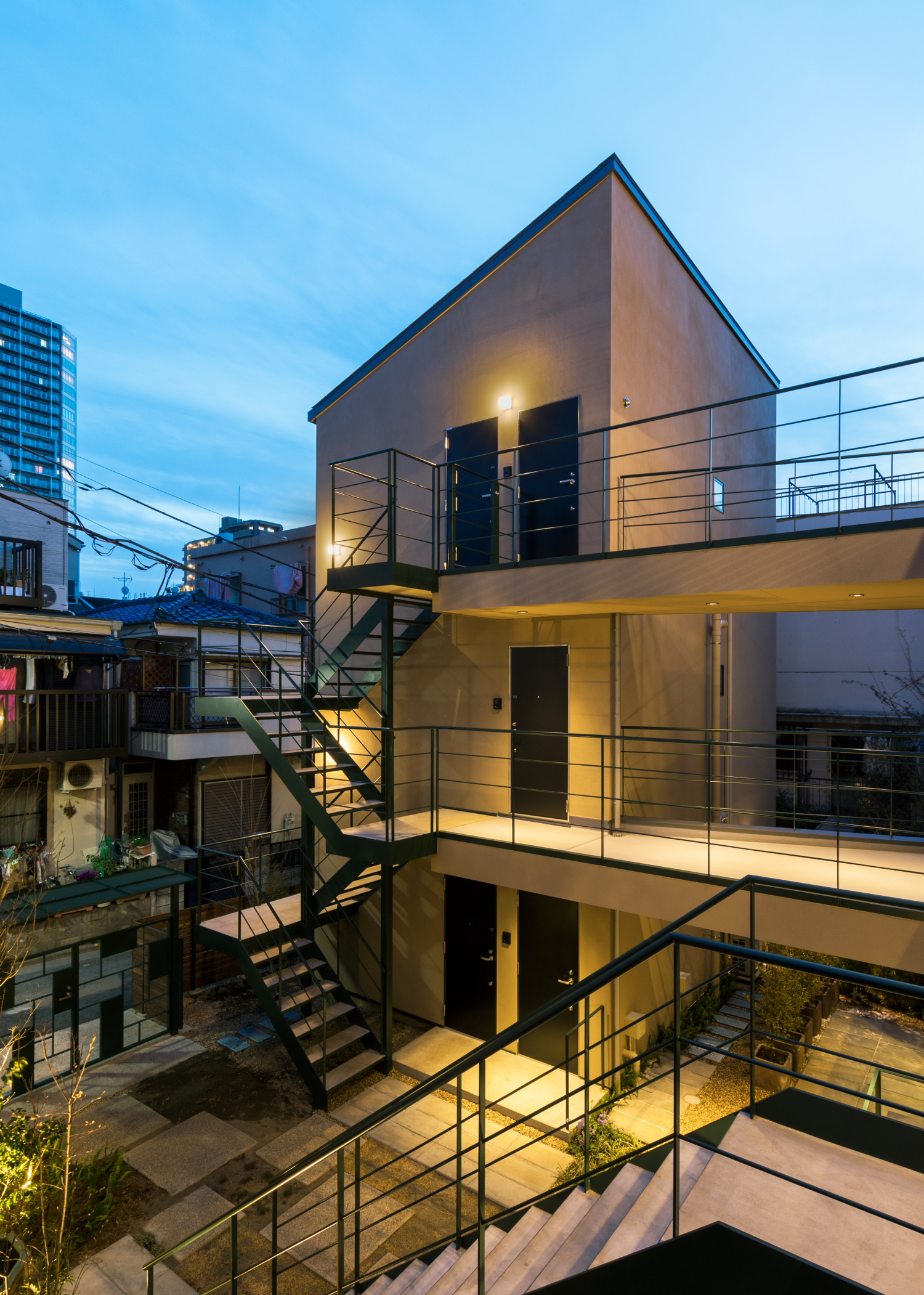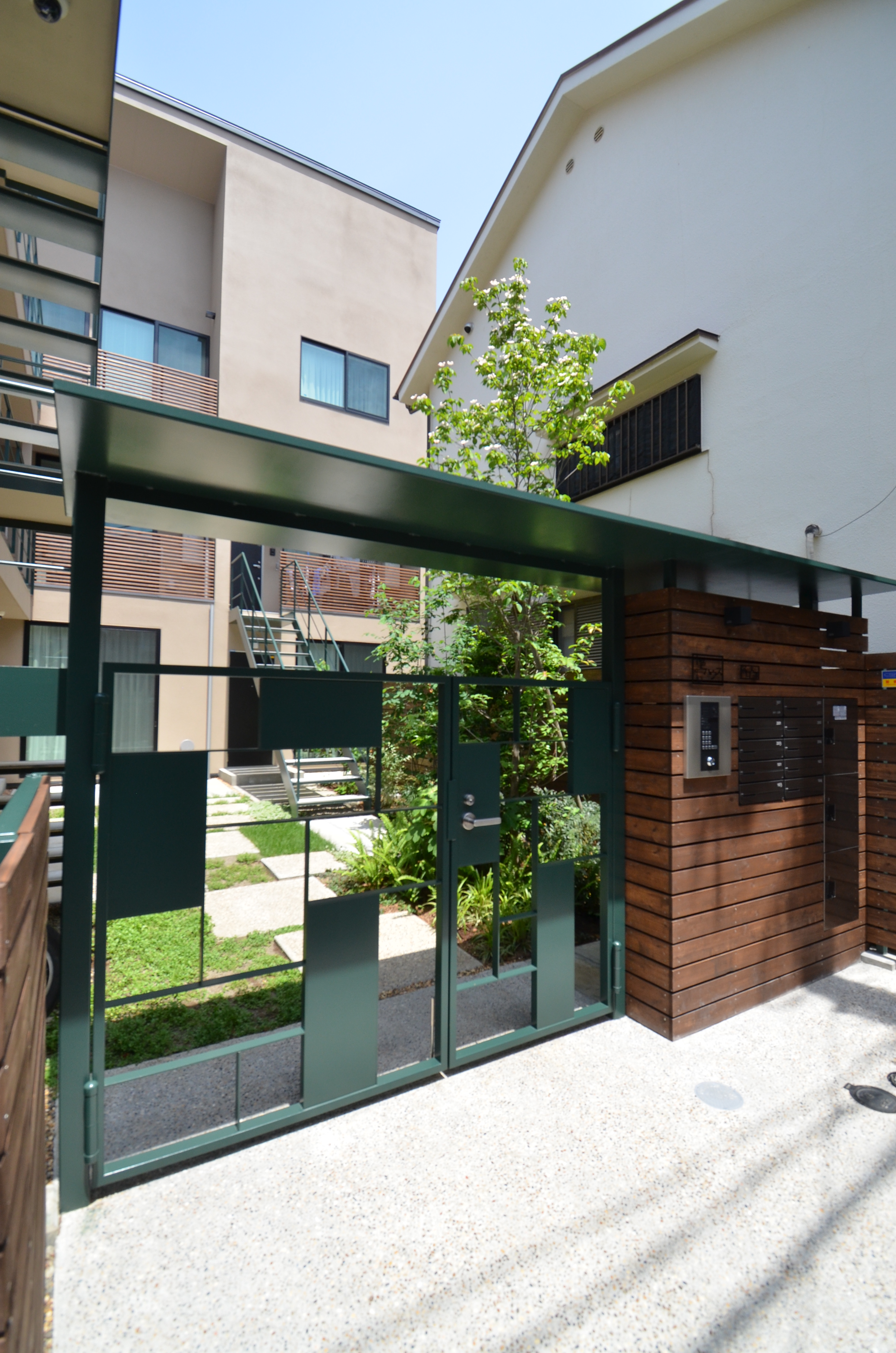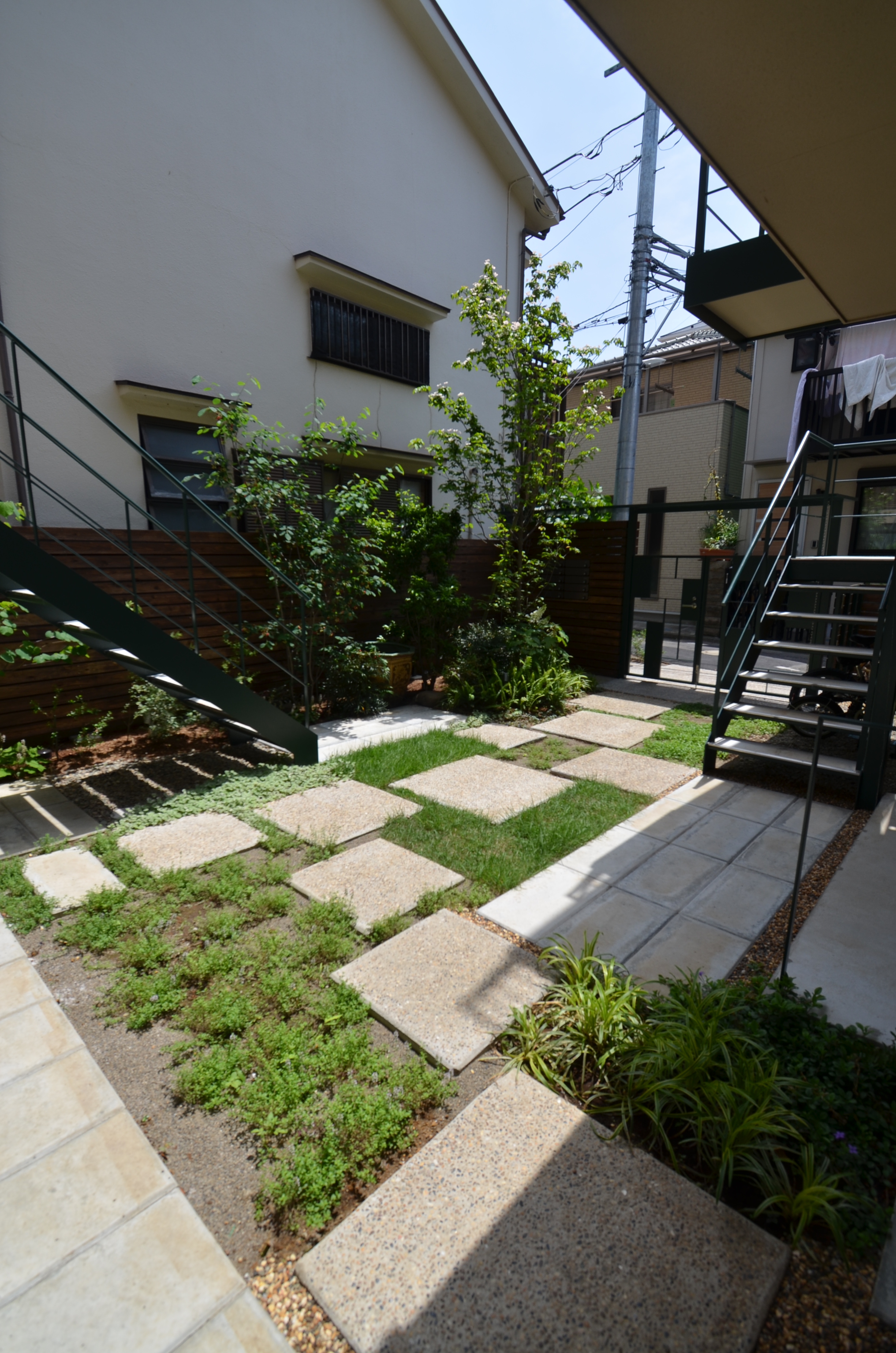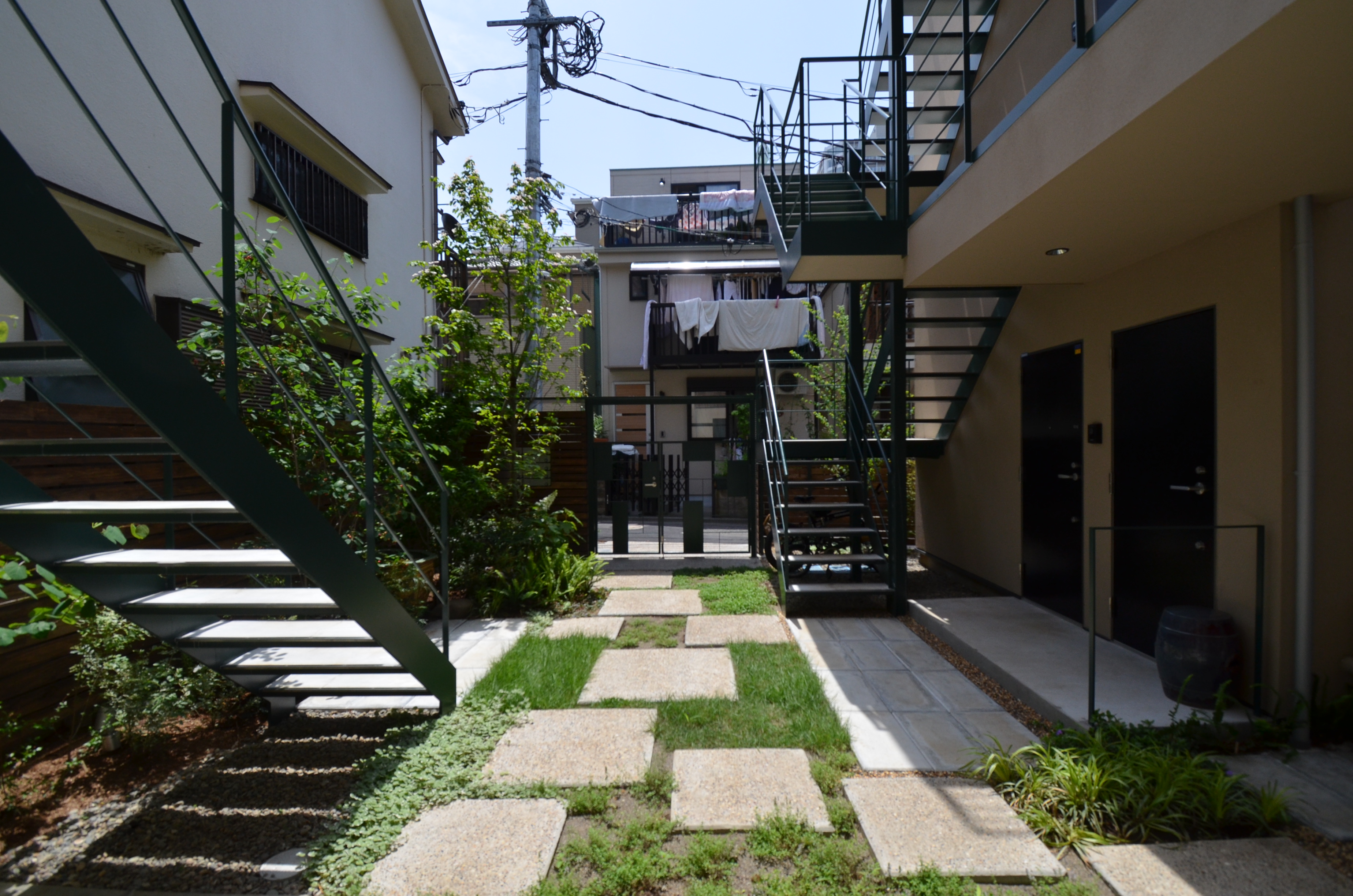 四谷四丁目のこの界隈は、道路幅が4mに満たない細い路地が多く、住宅がひしめきあっています。都会の住宅密集地でも、自然の光や風を取り入れて暮らすこと、また、新築の建物によって周辺の環境に悪影響がないことを考え、細い路地に広がりが生まれるような、ふっと視界が開けるスペースを『ろじにわ』として設けました。中に暮らす10軒の住人をつなぐだけでなく、四季を感じる樹々が街の借景となり、ときにアートイベントやワークショップなどで街へ広がっていくコモンスペースとして、街ゆく人、街に暮らす人との関係をゆるやかにつなぎます。『ろじにわ』の樹々は、赤や黄色に色づくもの、花が咲くもの、香りのするものなどを植え、通路の踏み石以外、できるだけ地被植物とし、四季を通じて五感で楽しめる庭としました。