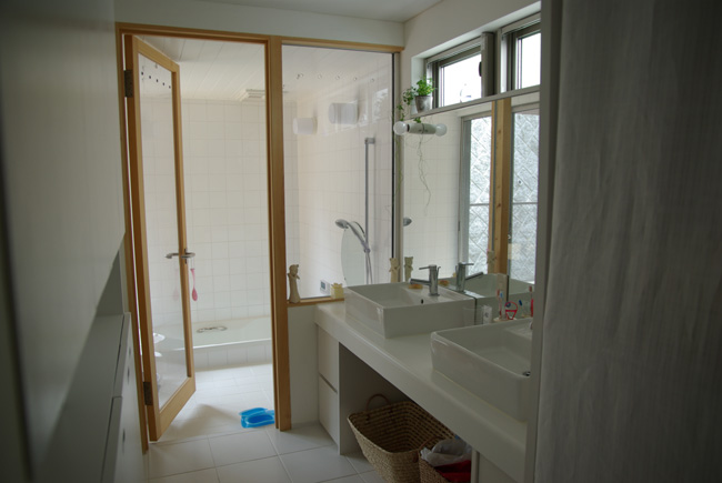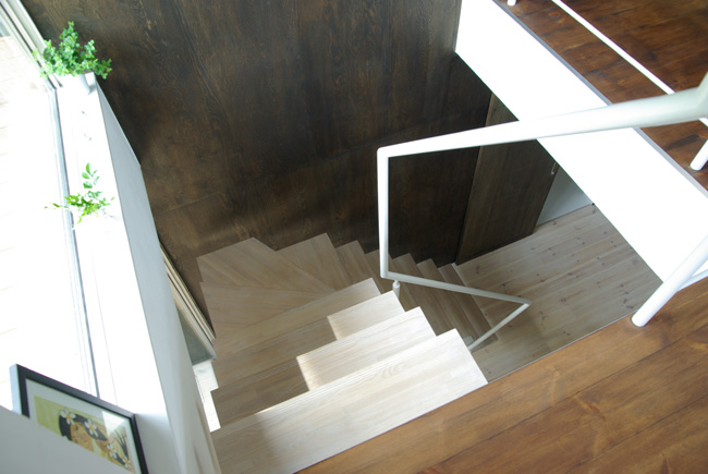 1階は、大きなバスコートを持つ開放的なバスルームや、共通の趣味であるスキーのチューンナップできる広い土間と大容量の収納を玄関に設け、白と落ち着いたダーク系の色に統一した2階は、東、南、西の3方に対してとても開放的としつつ、南面には隣戸の視線と日射を考慮した身長より少し高めの壁を配置したプライバシーと開放感の両方を実現しています。