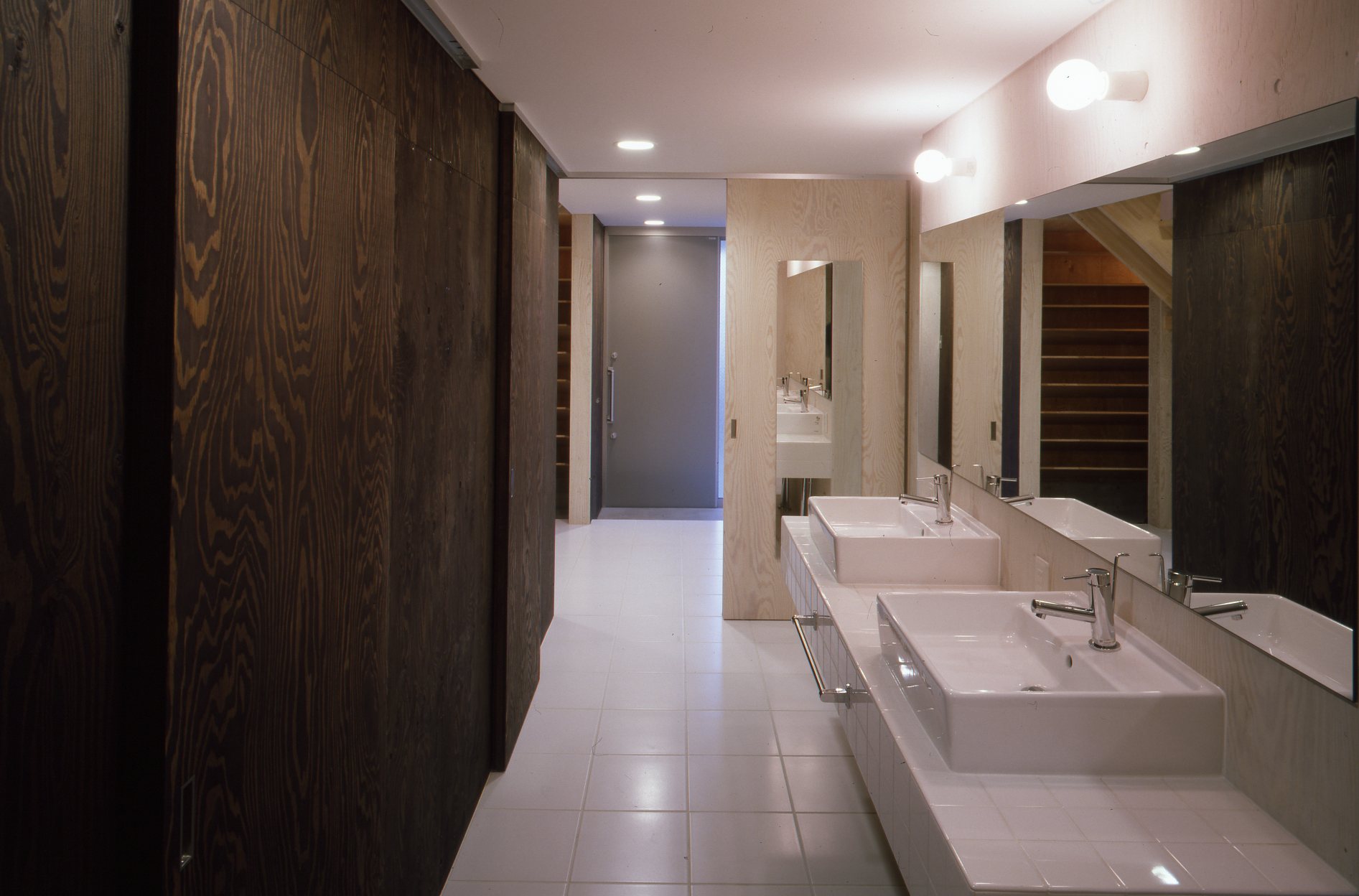 共働きで忙しく働くご夫妻からの「とにかく機能的で、将来に渡って快適な環境を実現できる住宅を。」との要望から、1階にはダブルボウルの洗面を中心に、家事室も含めて回遊できる水廻りを作り、洗面の背面には家族全員の衣類を収納する大容量のファミリーク
