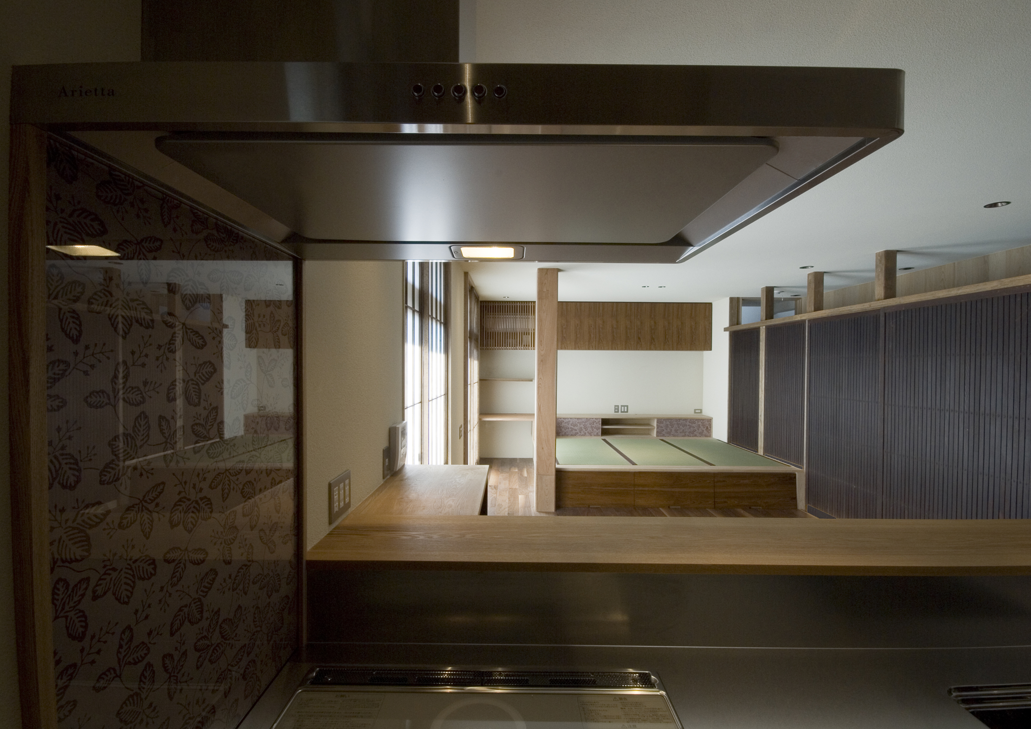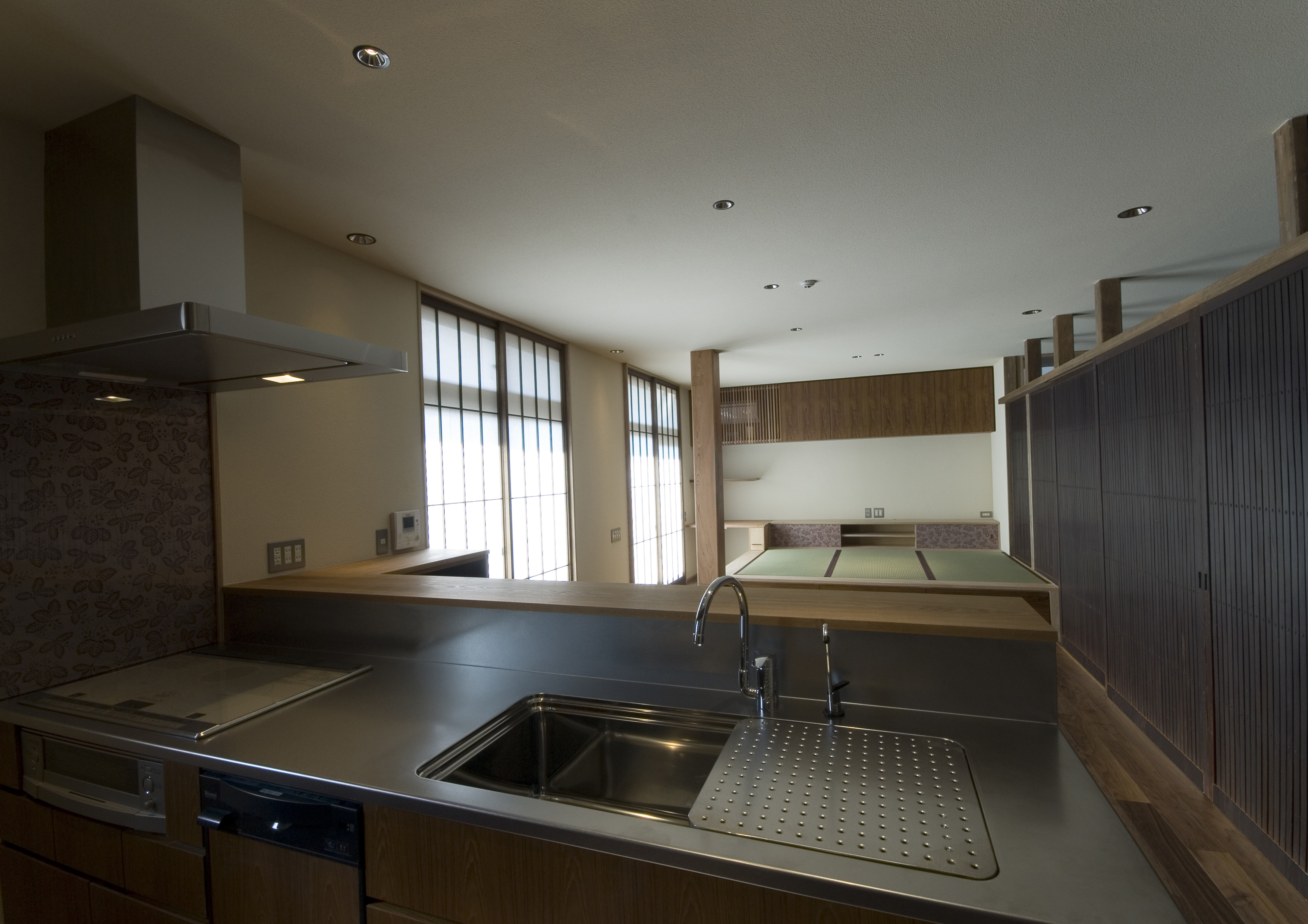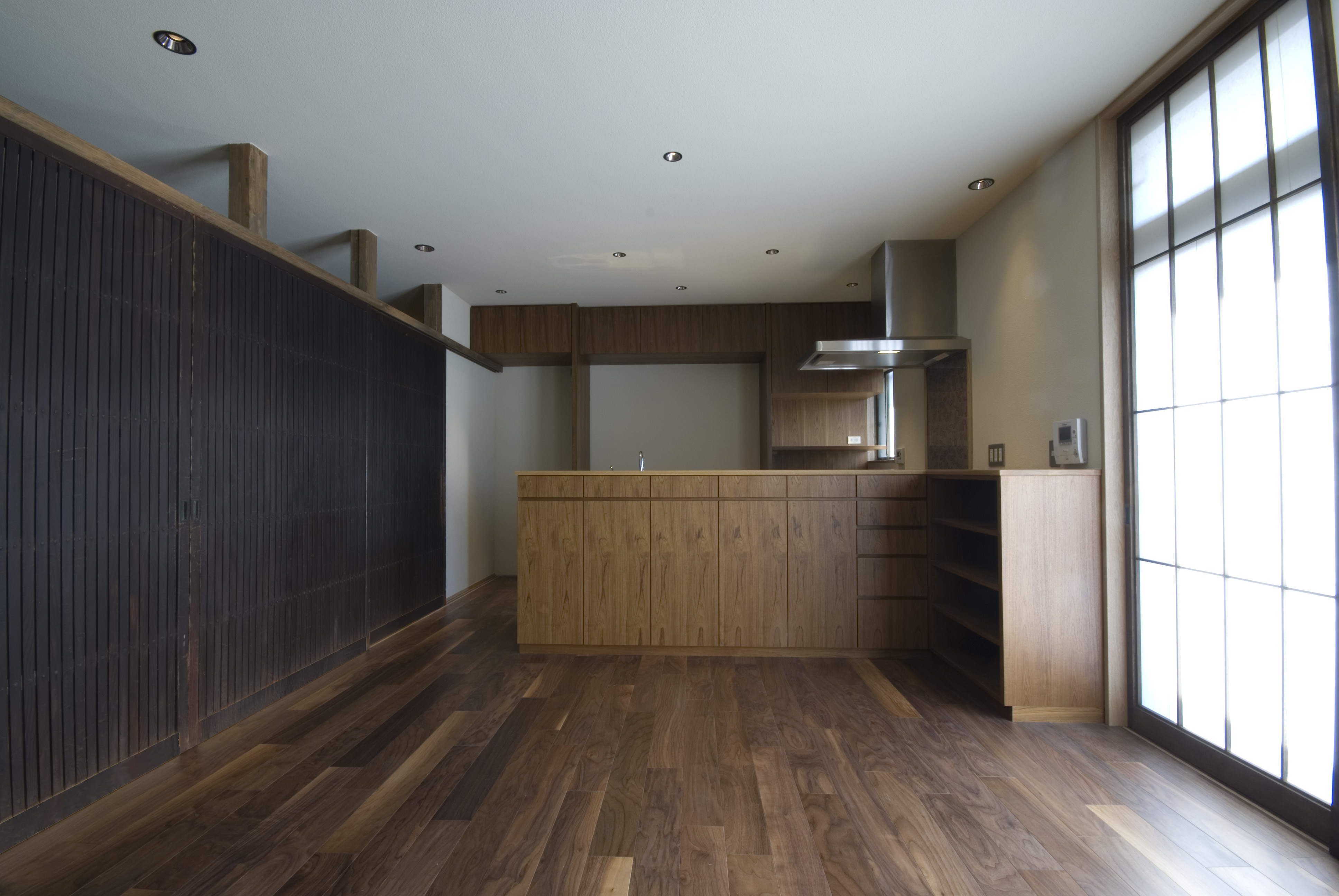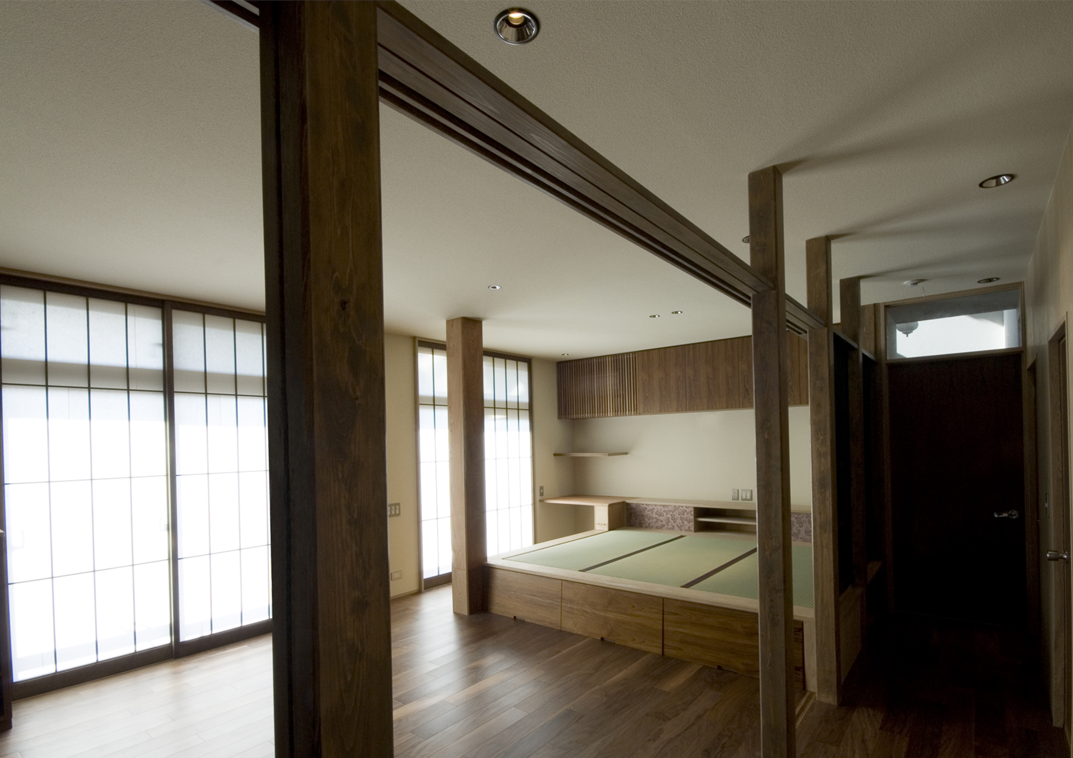 床はウォールナットフローリングを使用し、また部屋の一部に、3帖の畳スペースを作り畳でもくつろぐ事が出来る空間としました。