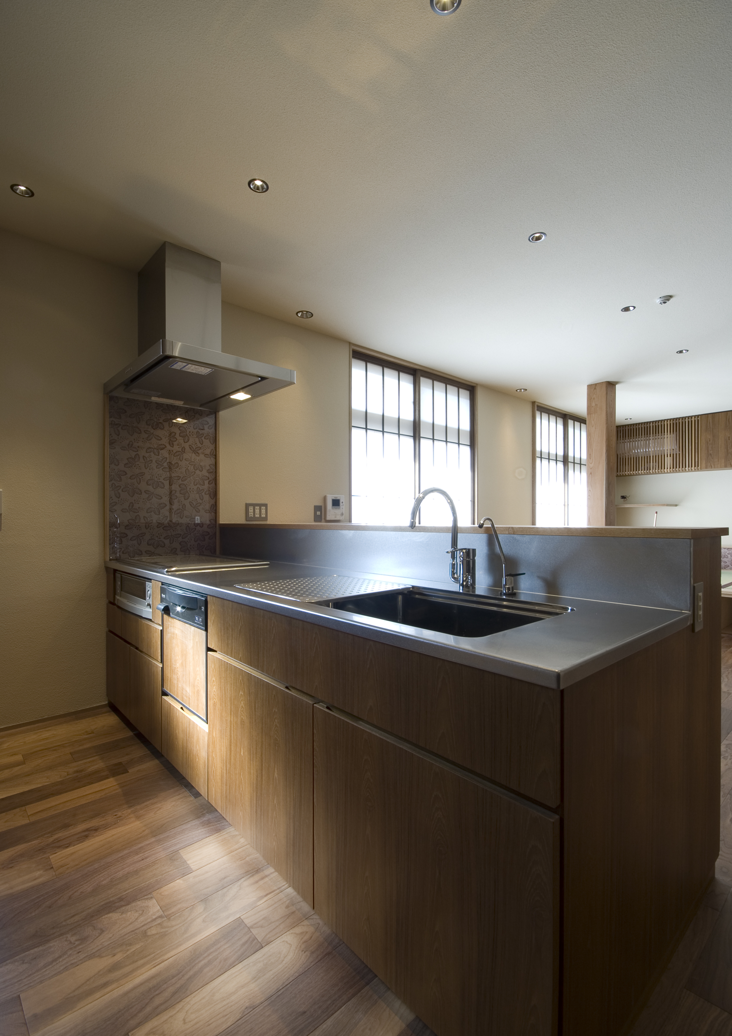 棚板は、ベンチ、棚、机、引き出しになりました。TV台の下とキッチンバックガードには、唐長の唐紙を使用しています。