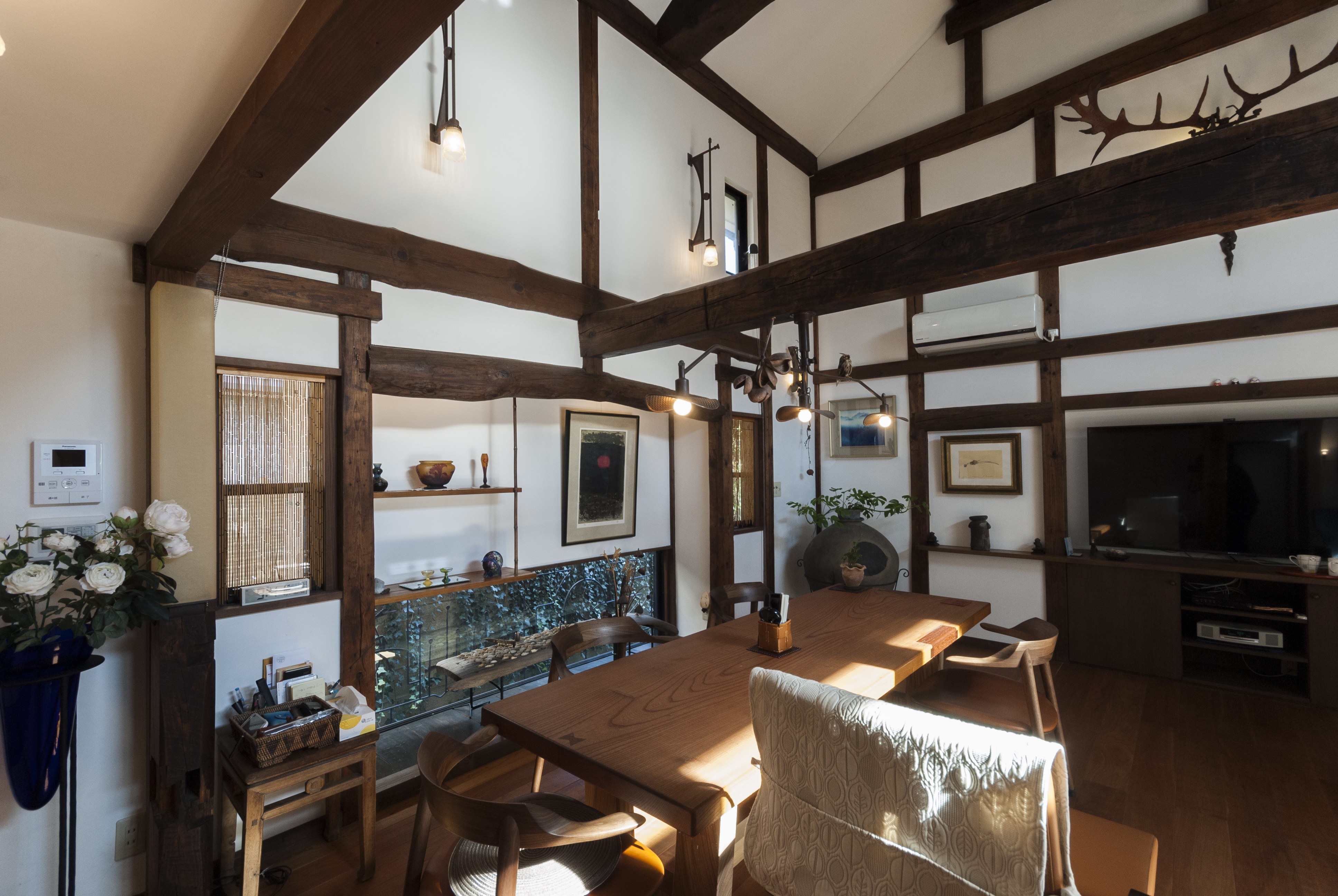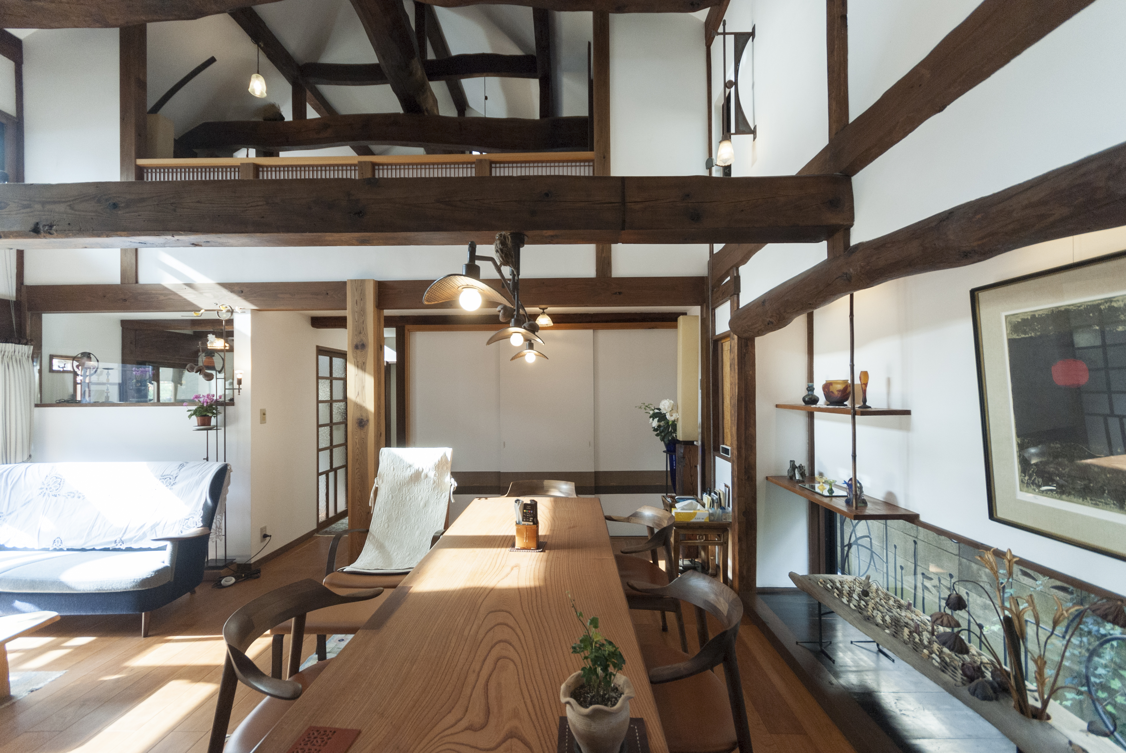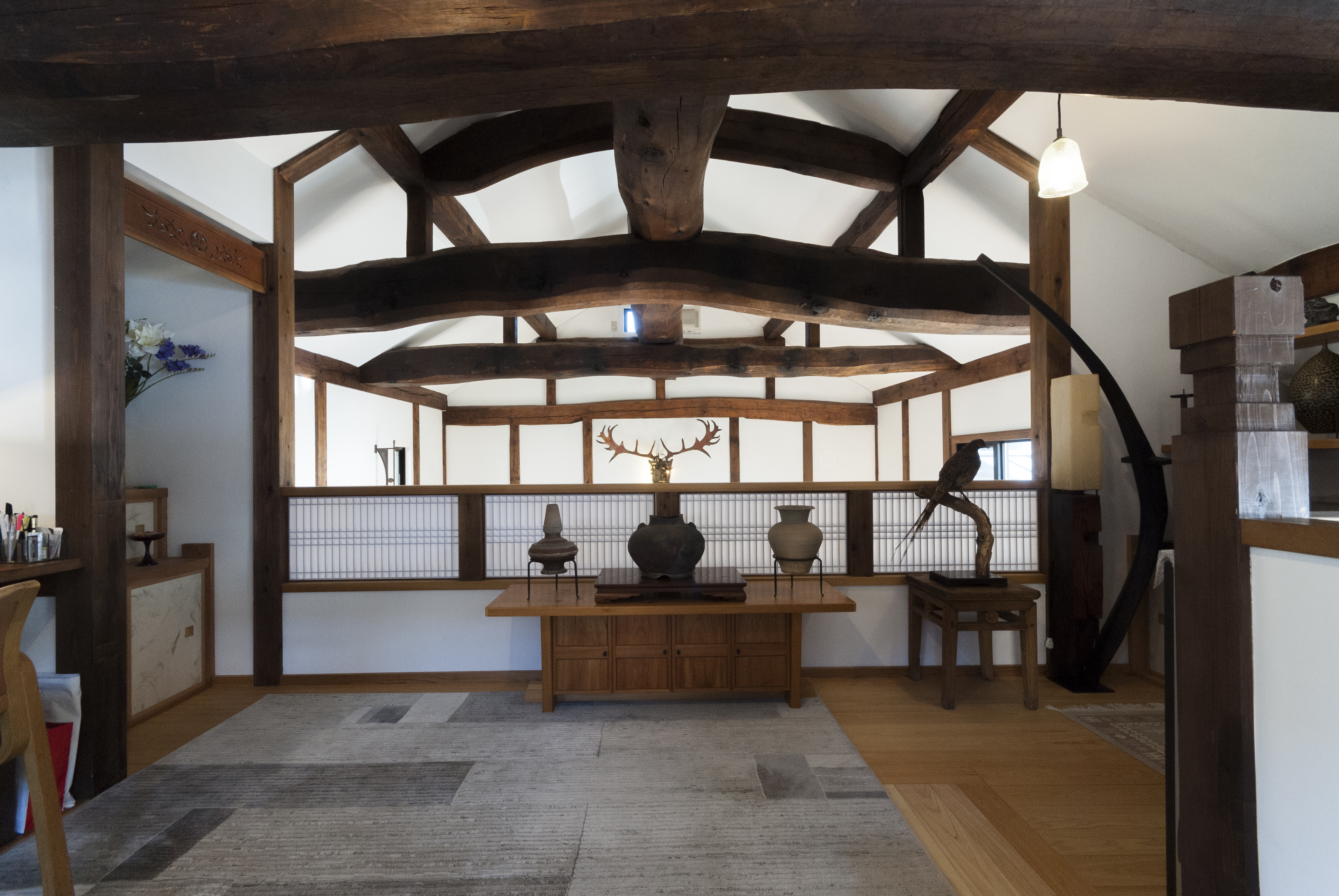 移築・古民家のリノベーションです。既存の状態でもすでに、古民家の持つ圧倒的な存在感と施主の持つ美的感覚とが上手く混じりあい、非常に面白い空間になっていました。今回の仕事としては、現在の空間の面白さを壊すことなく、家の基本的な快適さと機能を追加して、さらに上のレベルへと導けるかを念頭に置いてプロジェクトを進めました。