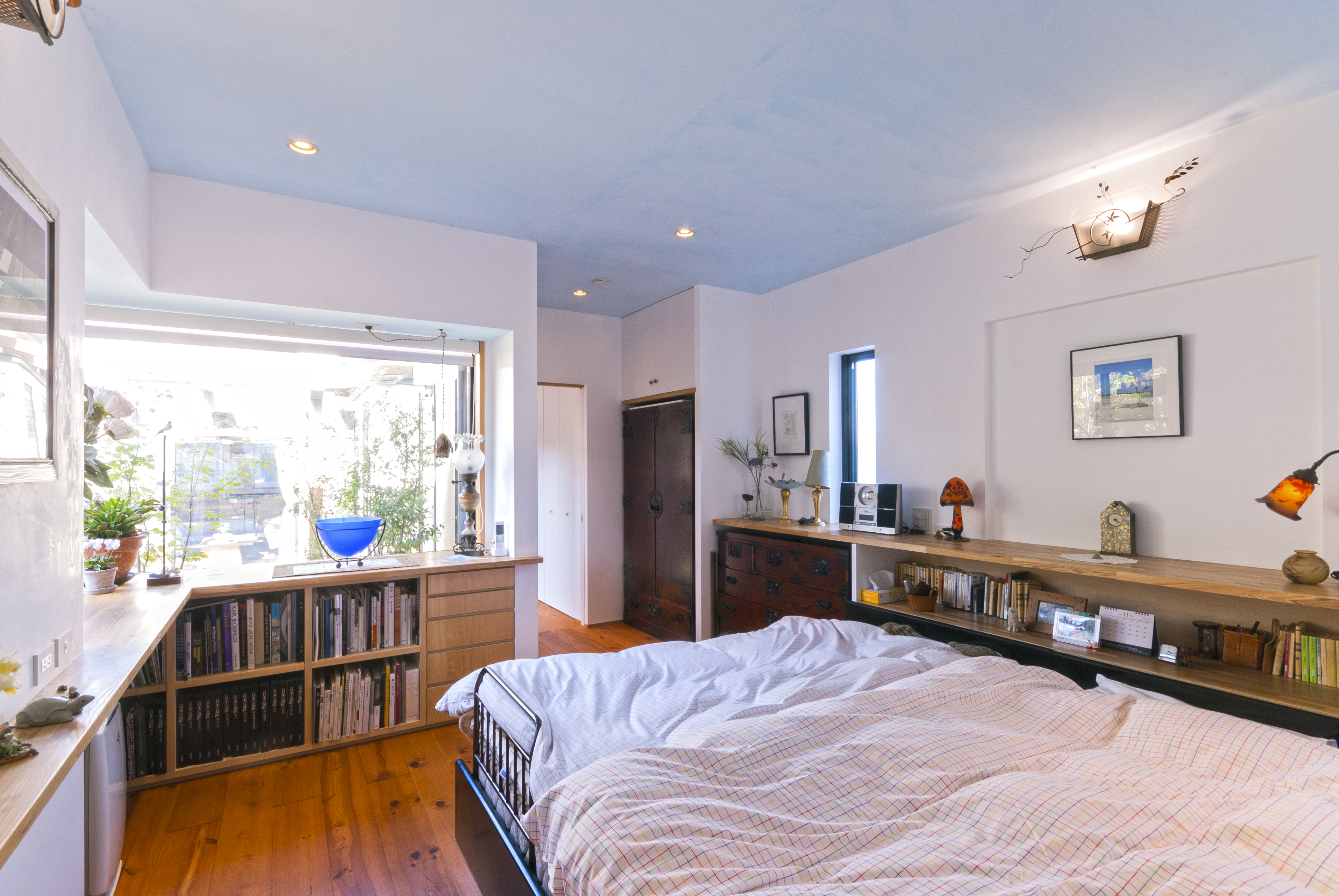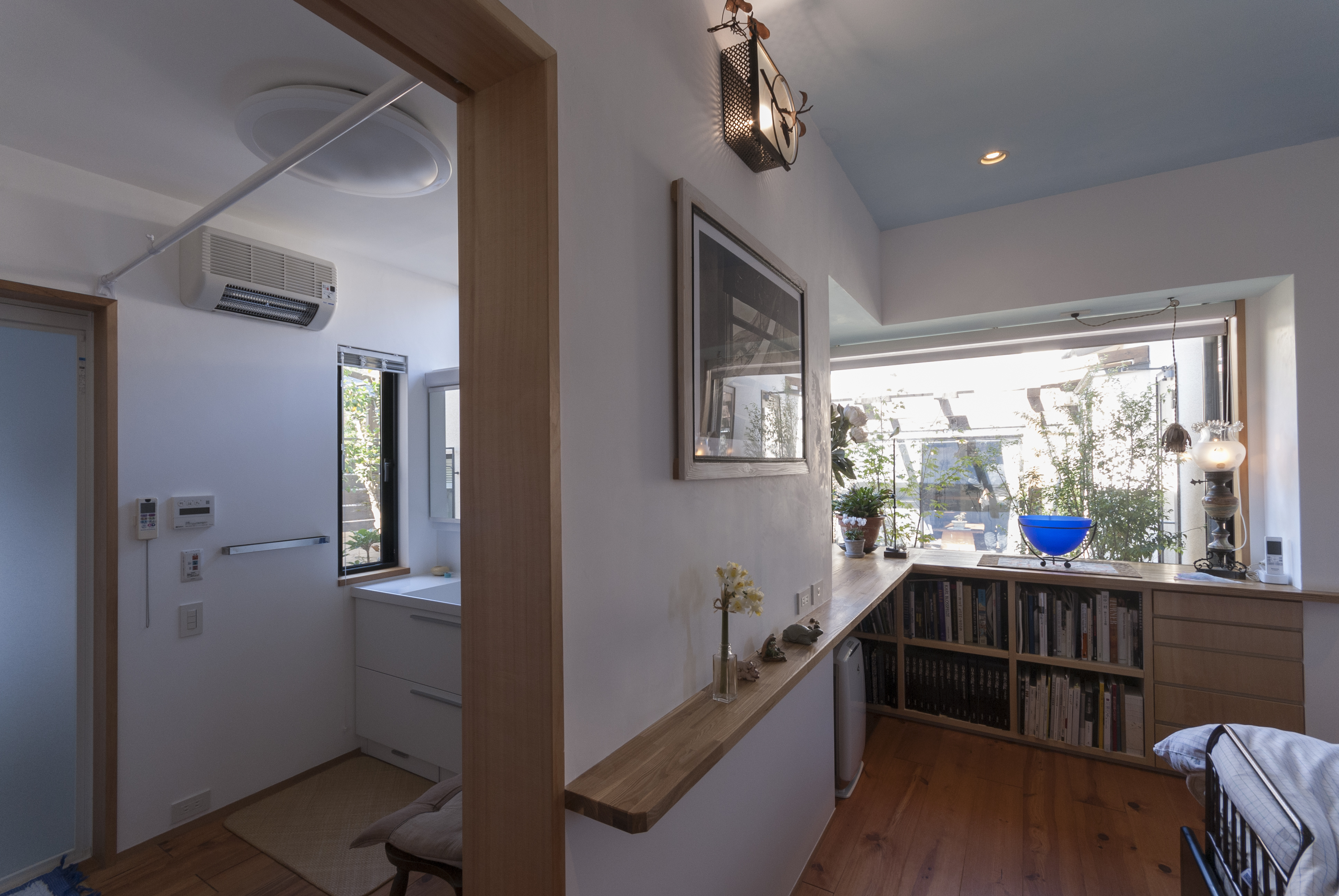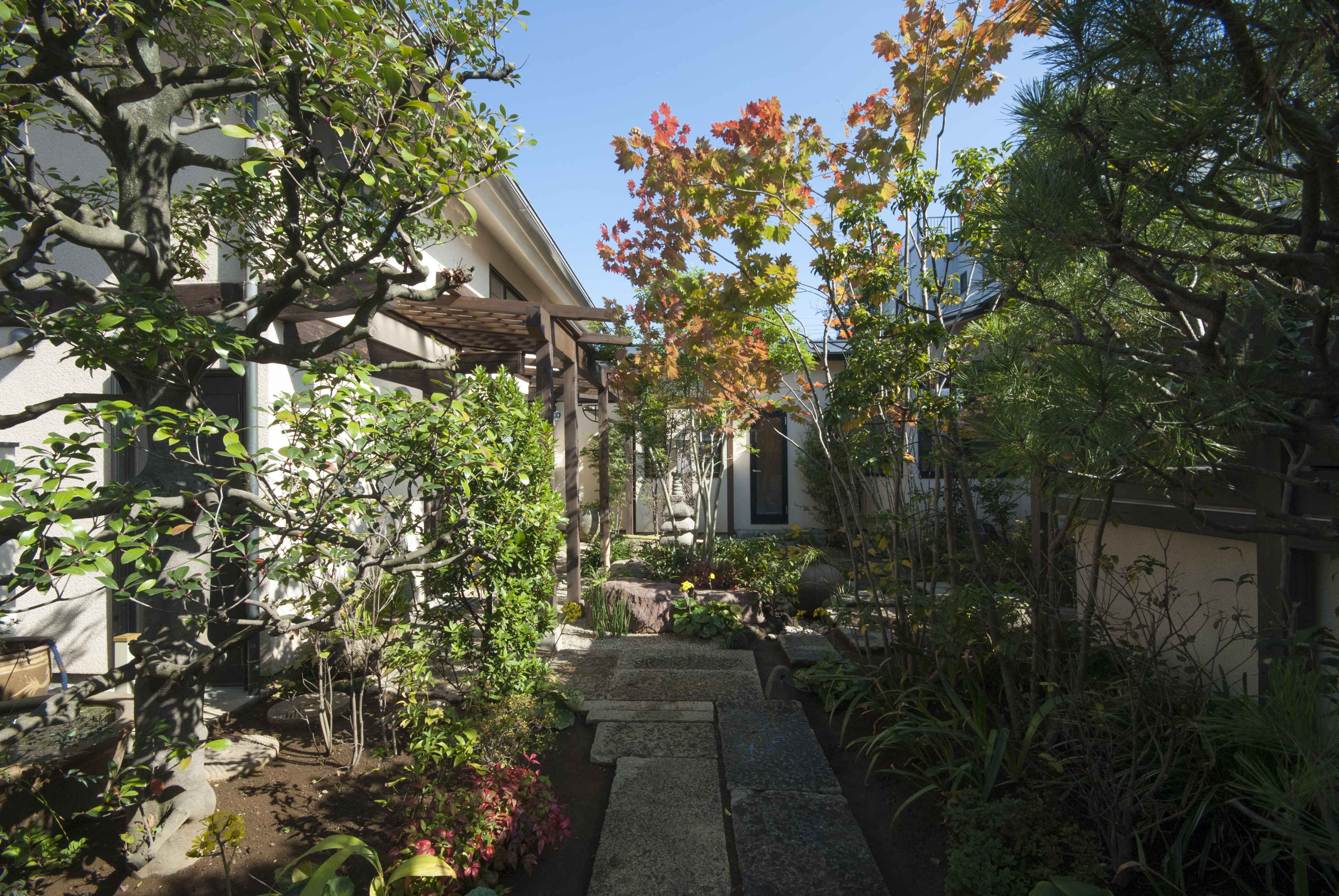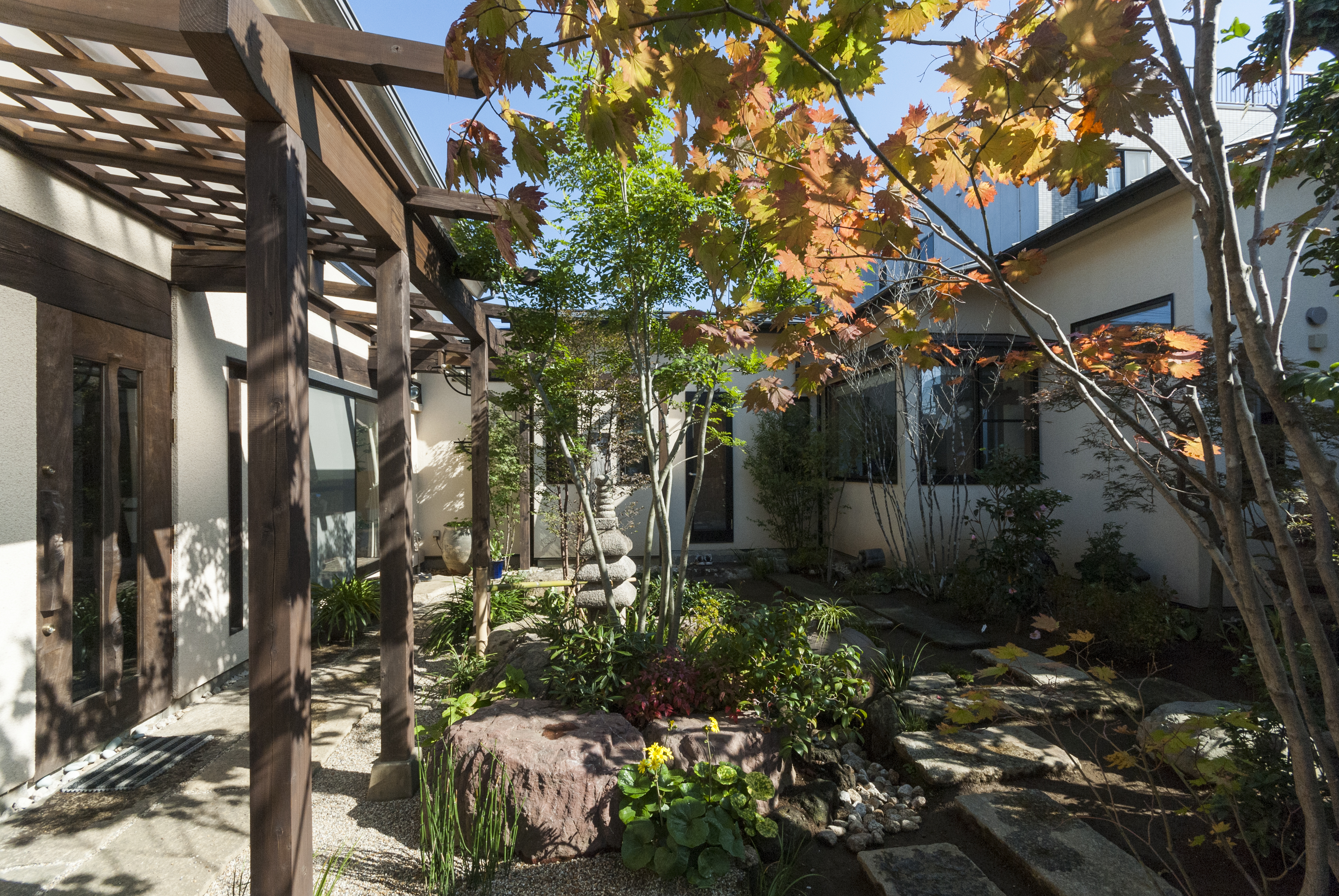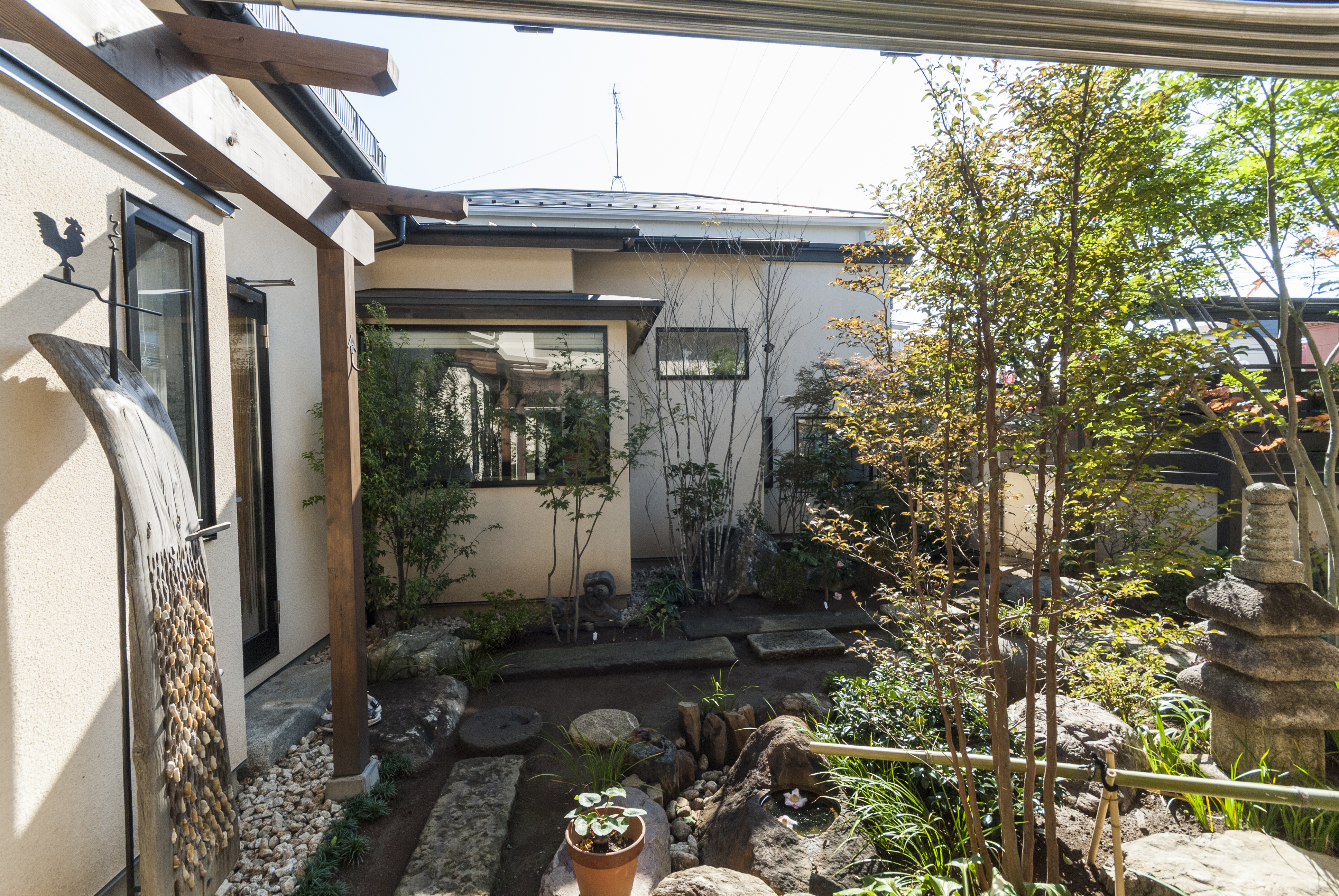 家の配置は中庭形式。家の中からは、自分の家が目隠しとなり、また、外部からアプローチした際も中庭がフィルターとなって雑然とした住宅街に位置しながら、まるでリゾート地にいる様な、自然と一体となった心地の良い空間になりました。