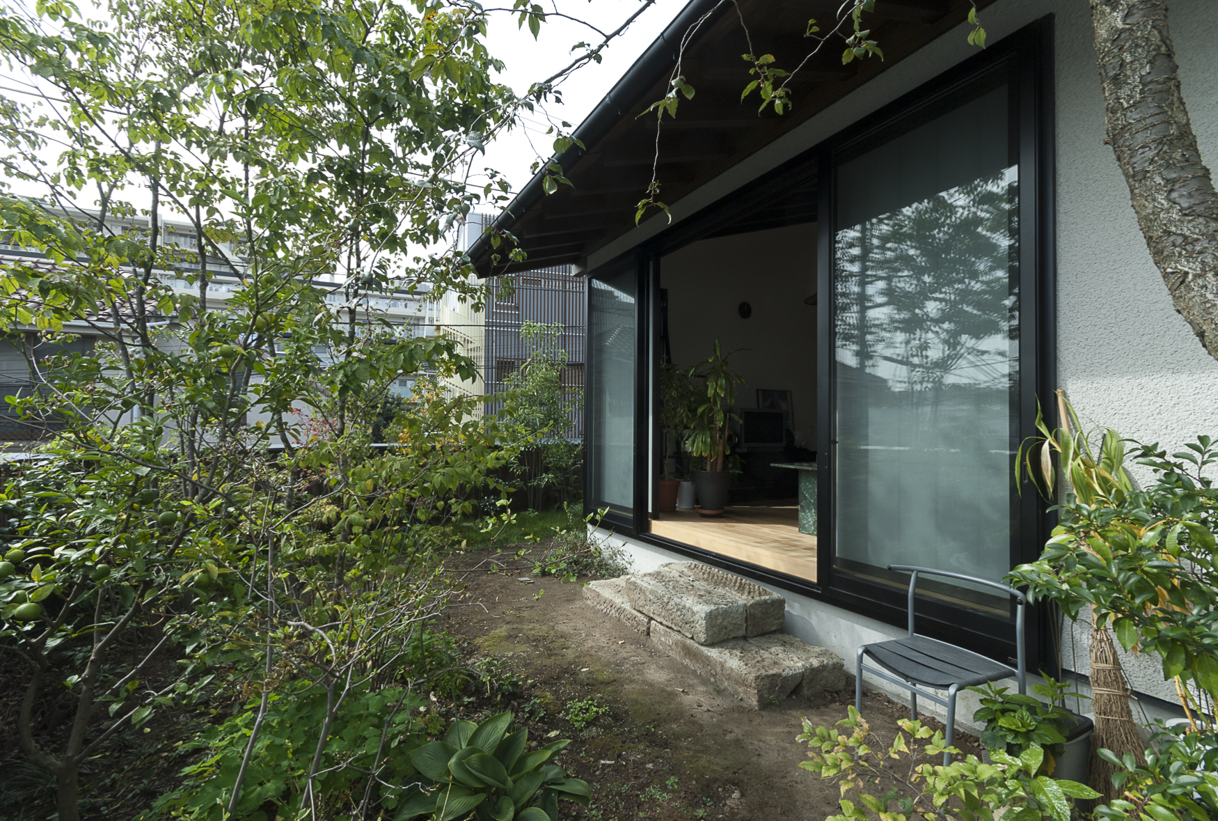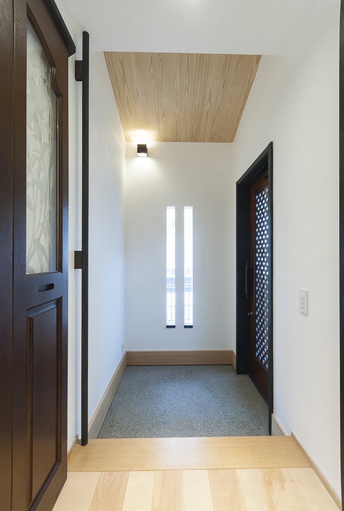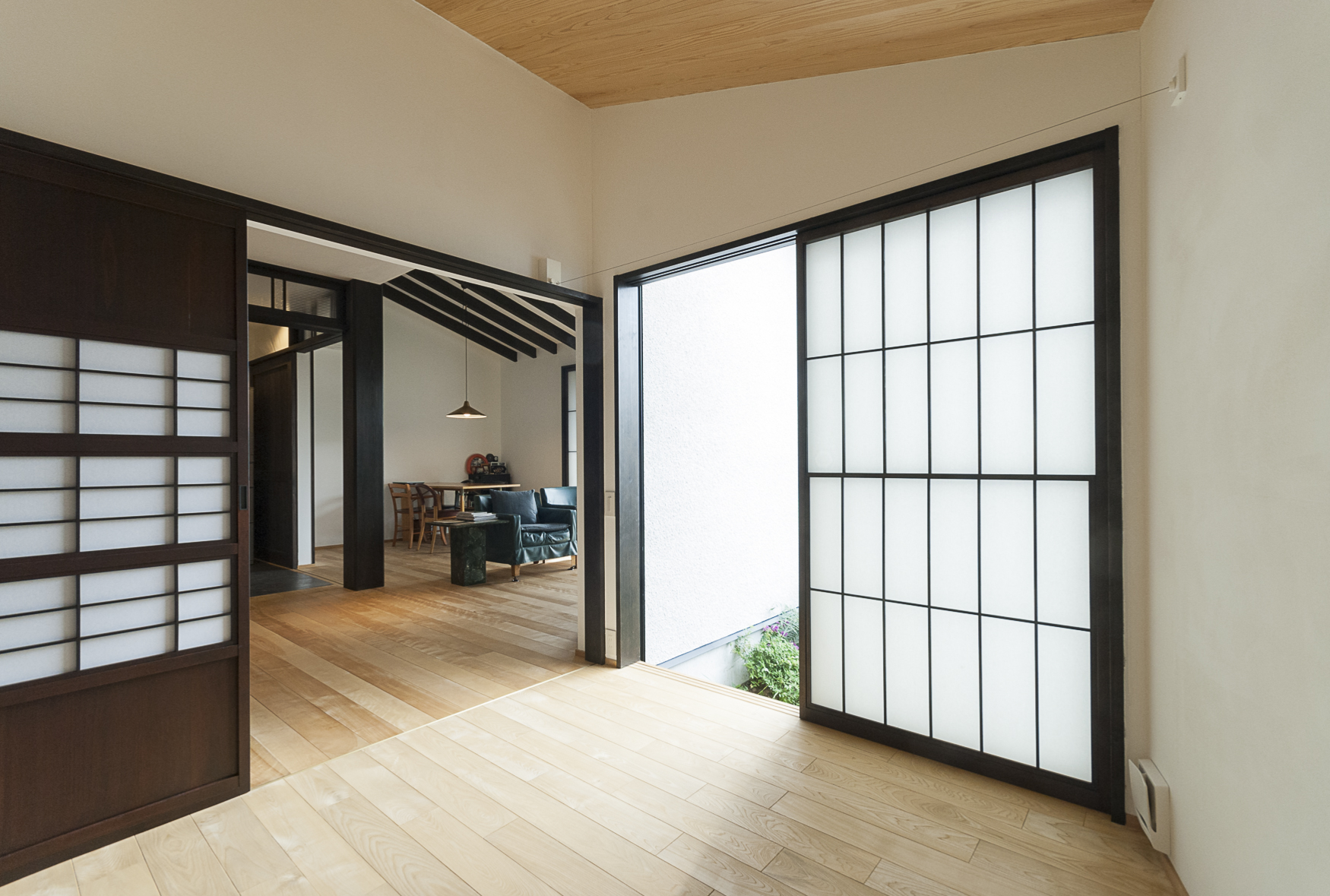 リビングダイニングには、大きな開口部、個室には雪見障子付きの開口部を配置しました。これらの開口部から主庭を、四季のうつろいを借景により眺める事が出来ます。個室の入口は開口幅が広い為、裏障子付きの格子戸を2枚繋げて対応しています。