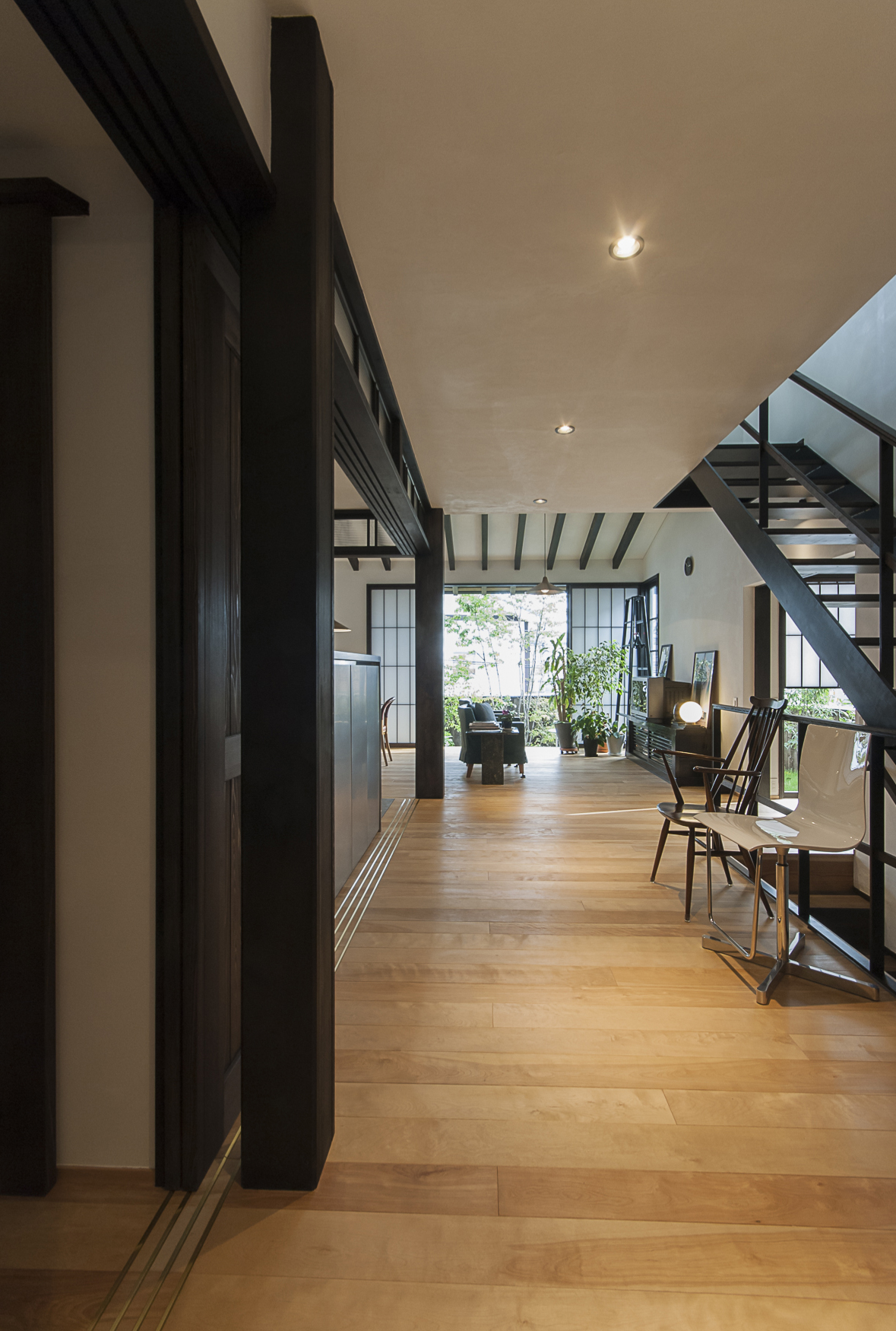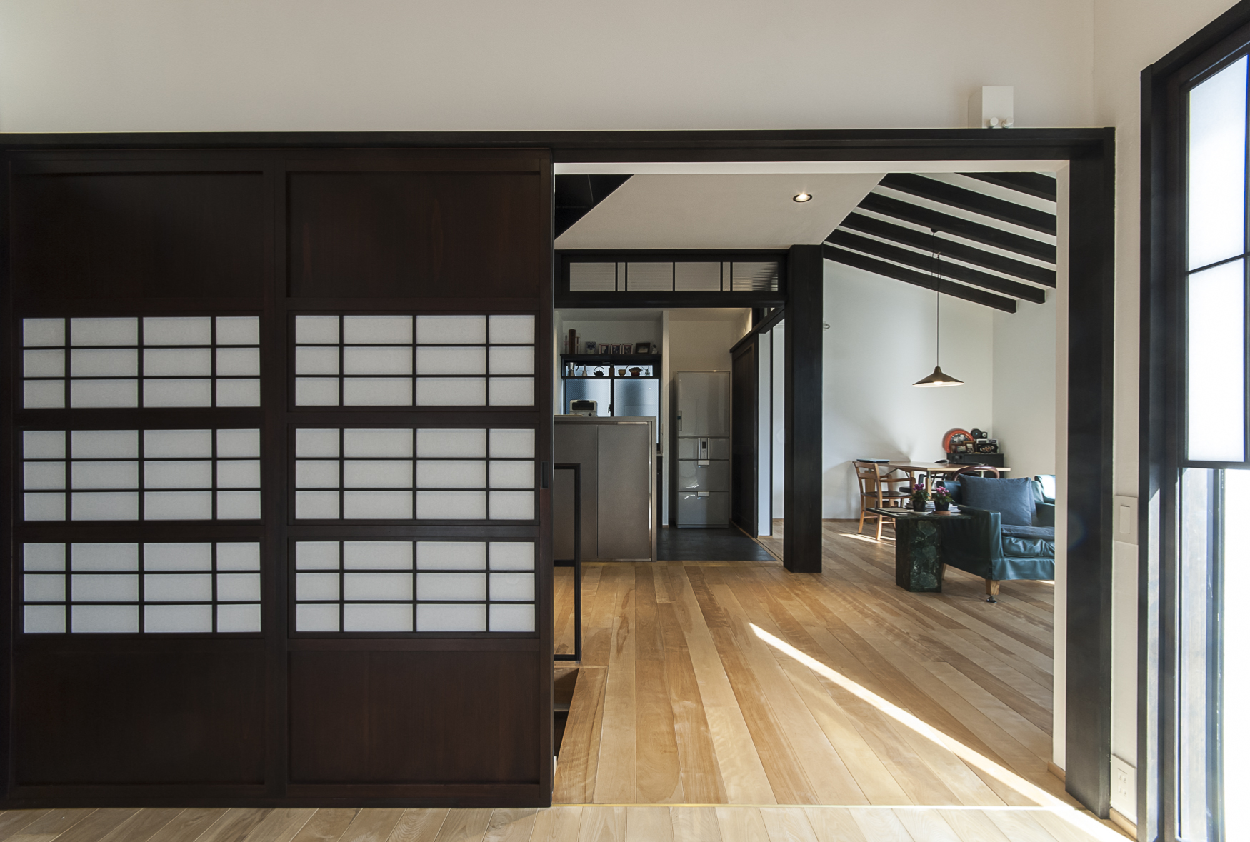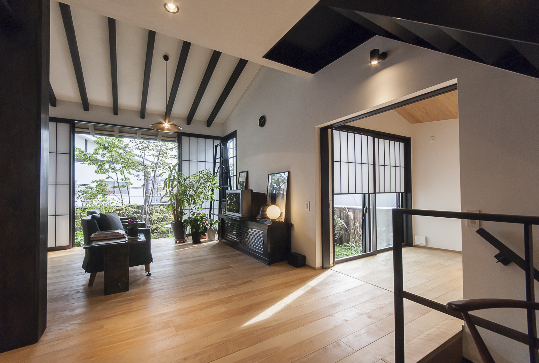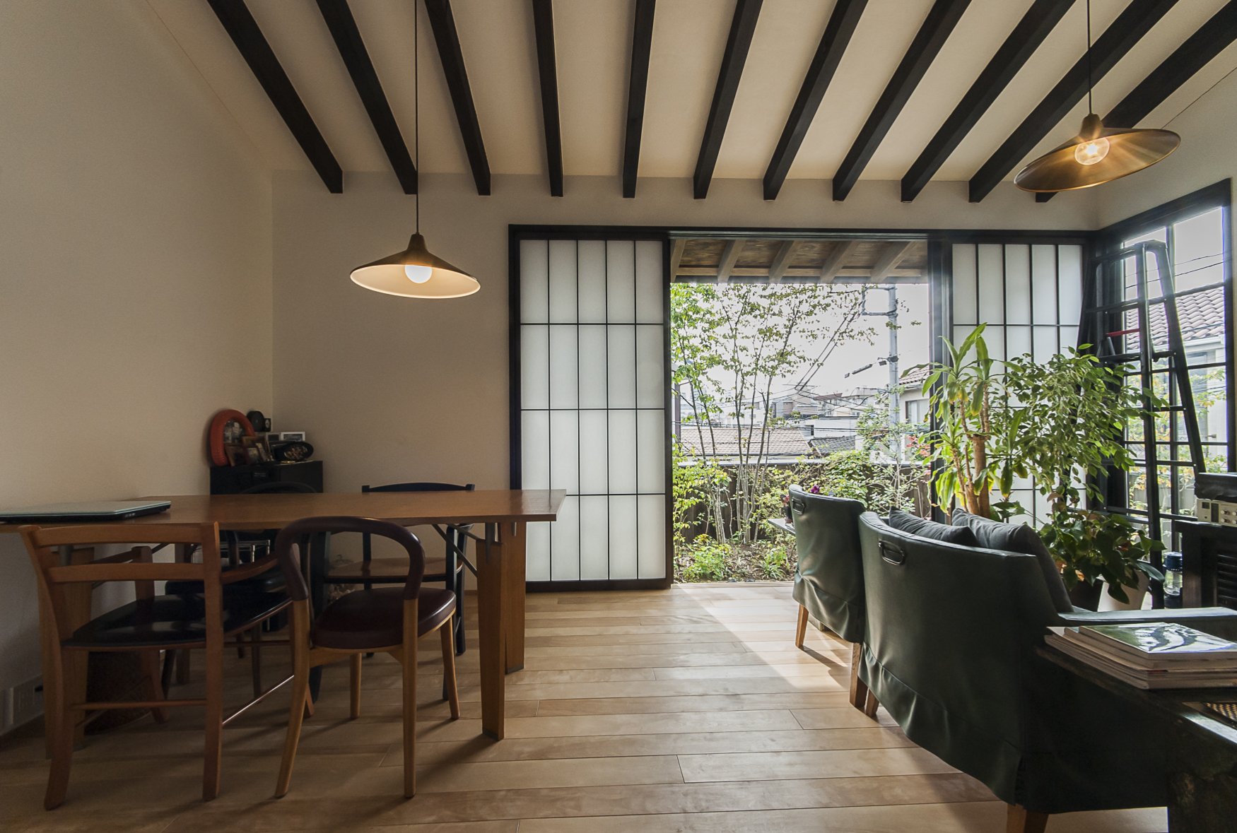 リビングダイニングには、大きな開口部、個室には雪見障子付きの開口部を配置しました。これらの開口部から主庭を、四季のうつろいを借景により眺める事が出来ます。個室の入口は開口幅が広い為、裏障子付きの格子戸を2枚繋げて対応しています。
