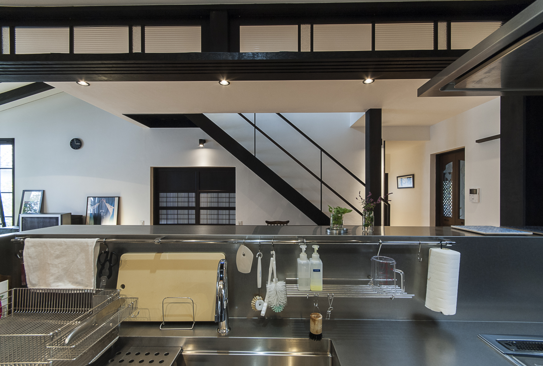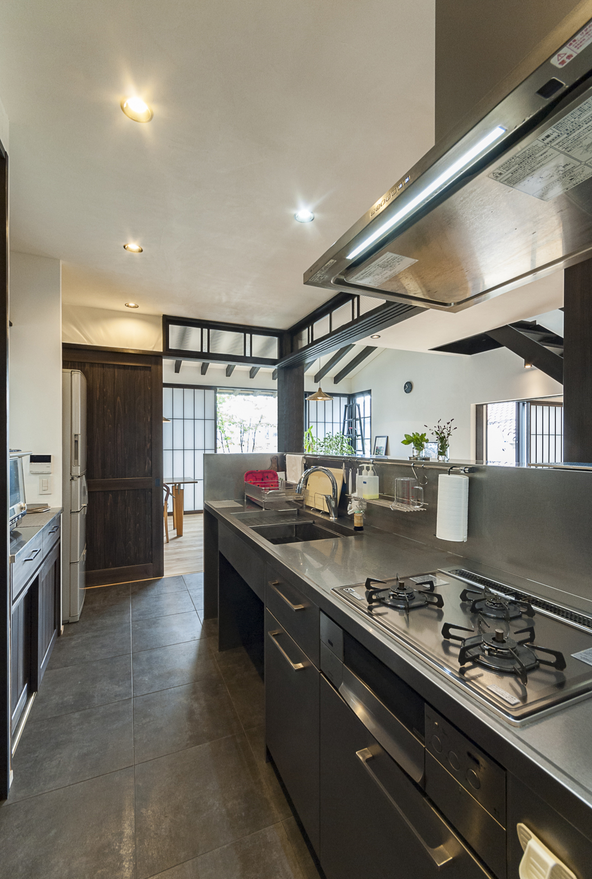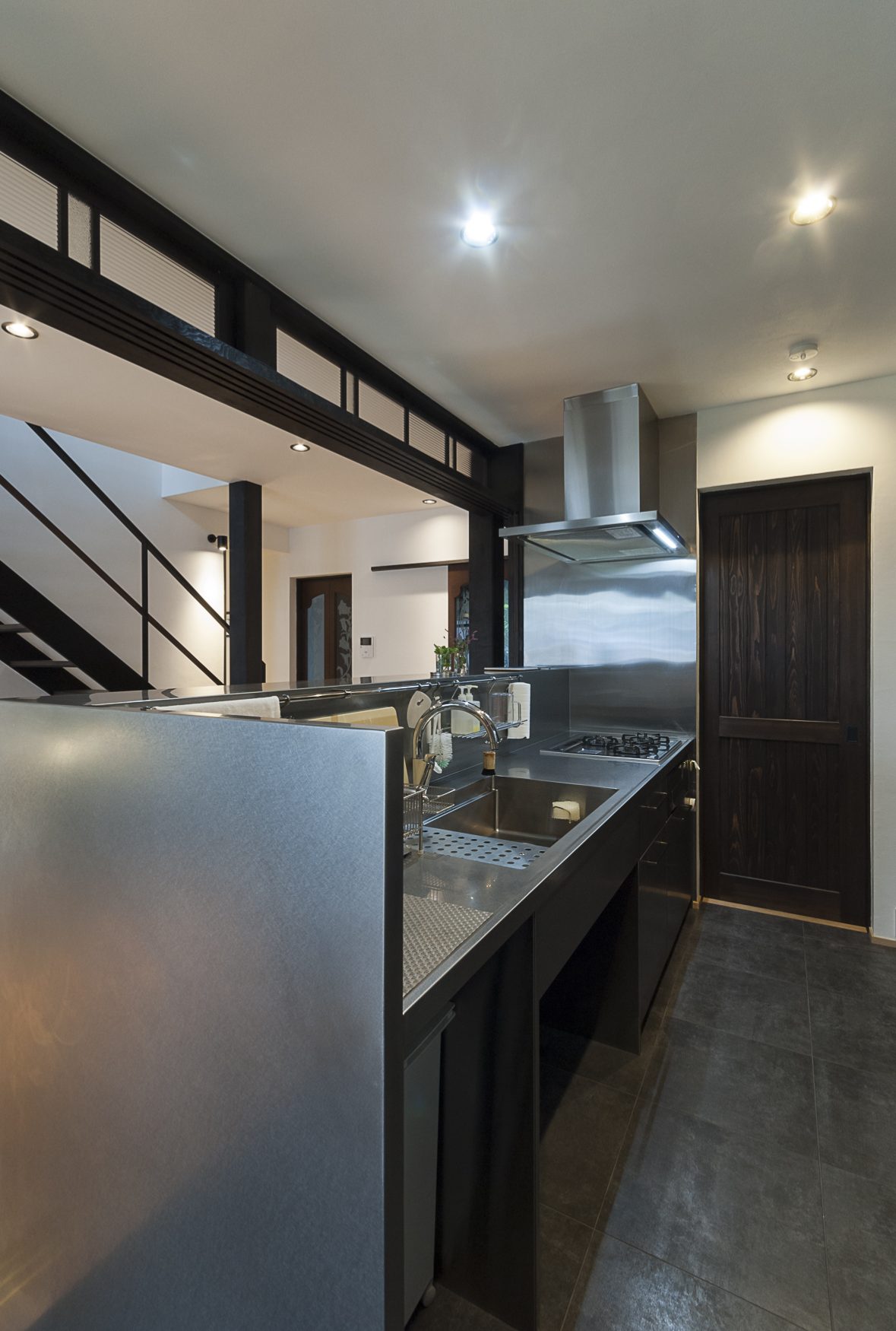 キッチンスペースは、通常では建具を開いたオープンな空間になっていますが、匂いが気になる料理などを調理する時などには、引き戸を閉めると完全な独立した空間になる様に設計されています。キッチンカウンターは、奥様と打ち合わせしながら全てを決定したフルオーダーのオールステンレスキッチンを採用しました。