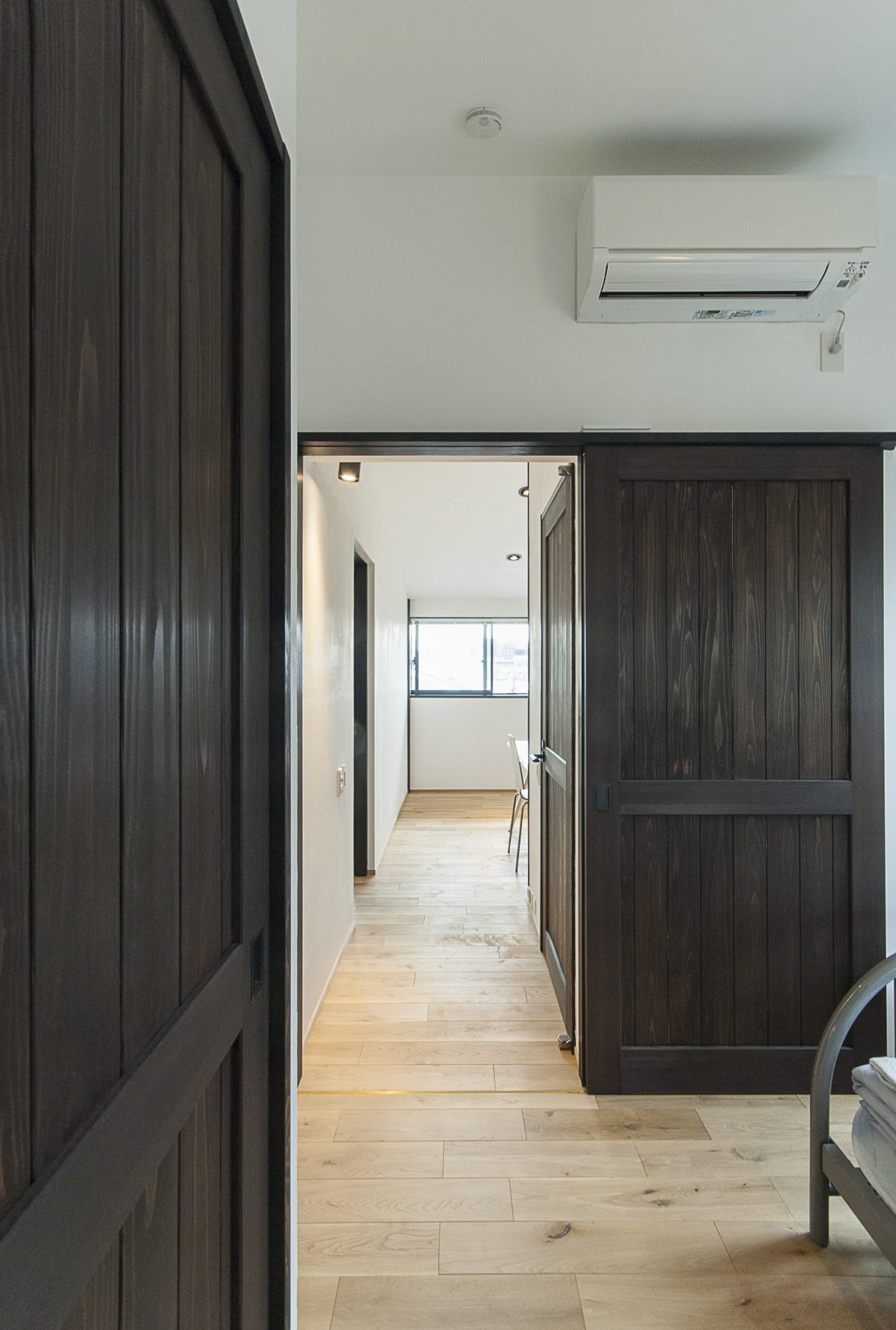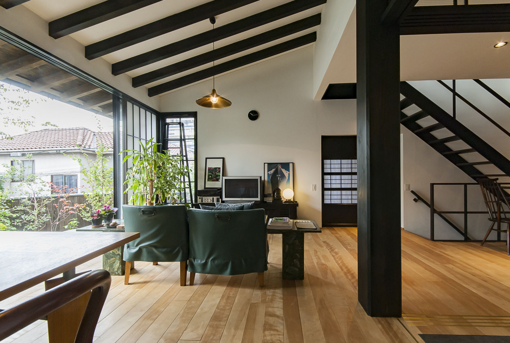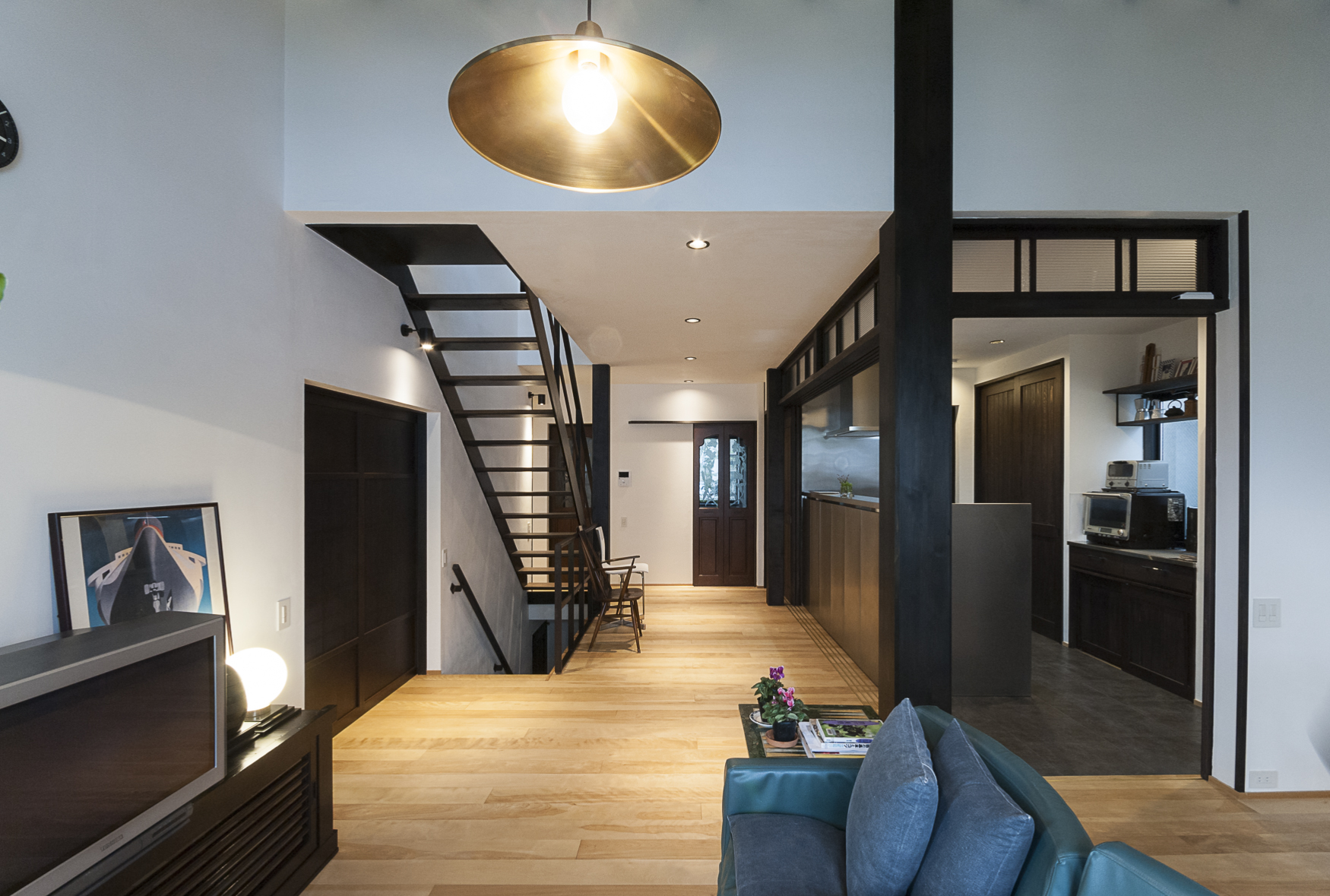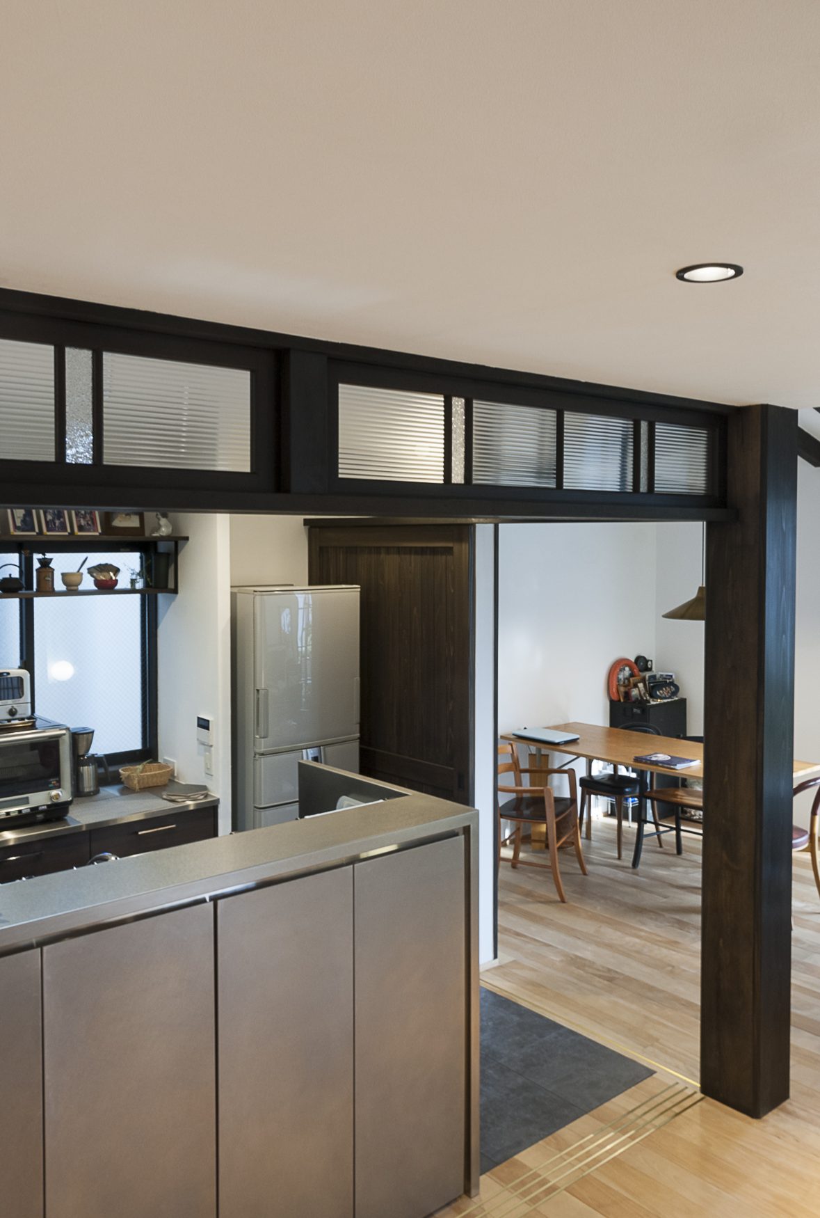 キッチンスペースは、通常では建具を開いたオープンな空間になっていますが、匂いが気になる料理などを調理する時などには、引き戸を閉めると完全な独立した空間になる様に設計されています。キッチンカウンターは、奥様と打ち合わせしながら全てを決定したフルオーダーのオールステンレスキッチンを採用しました。