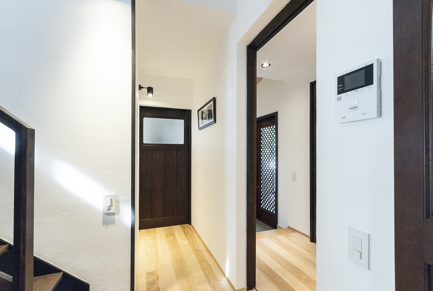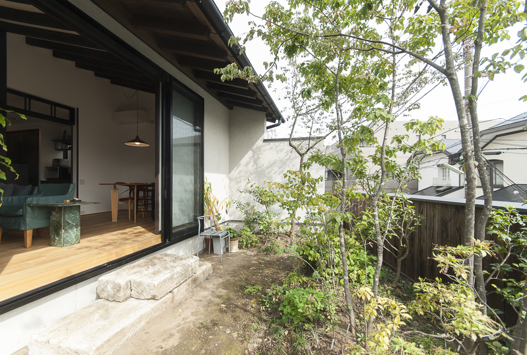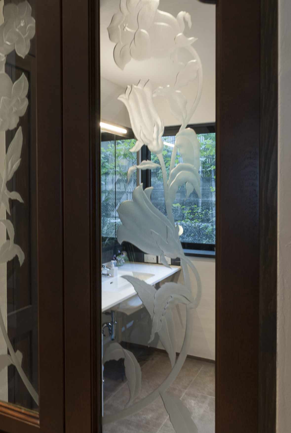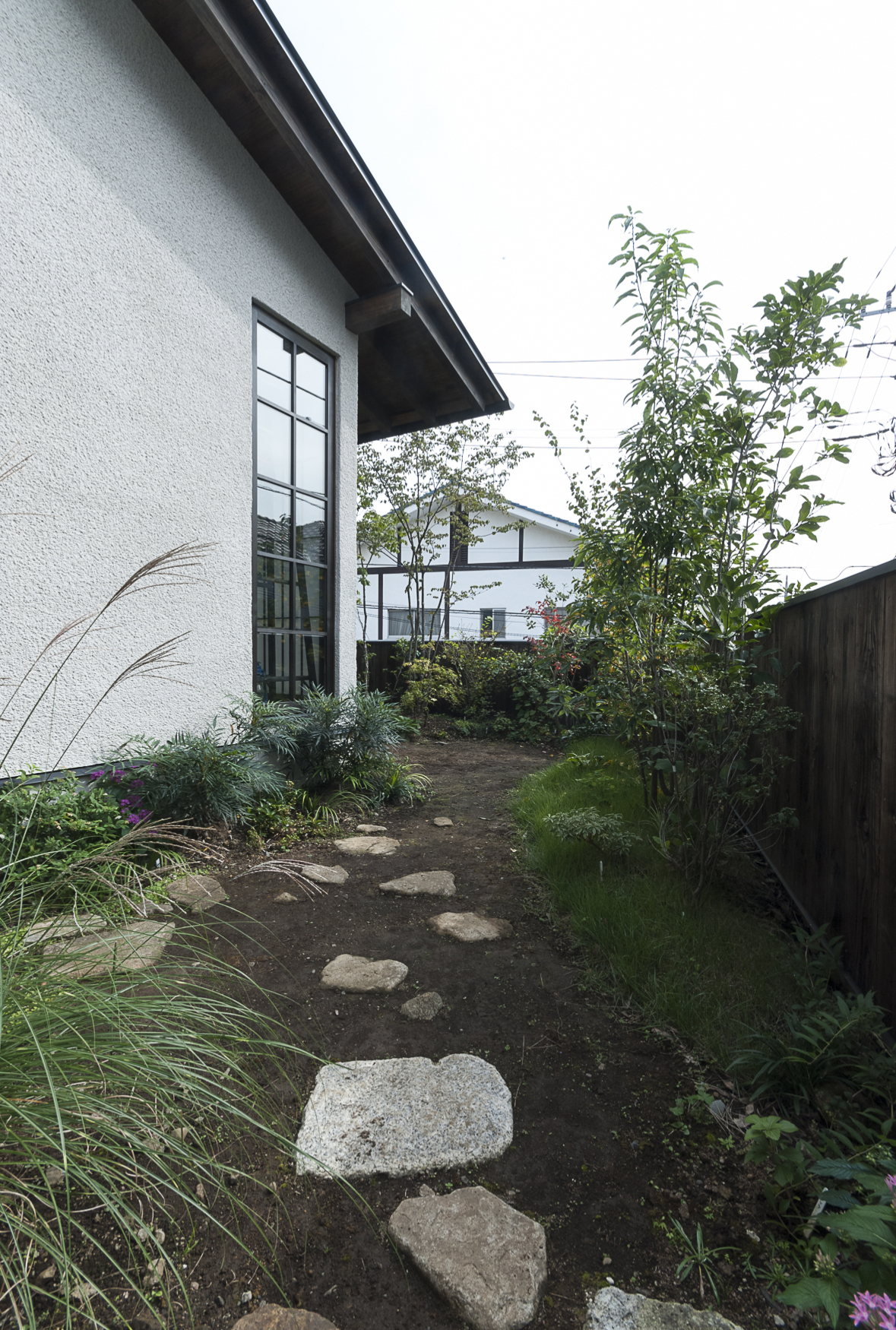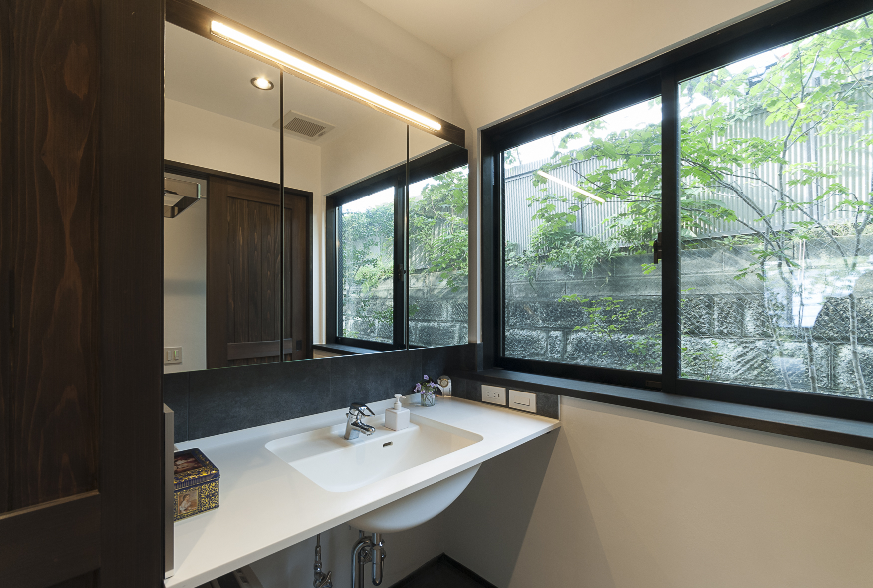リビングダイニングやキッチンの影に隠れて見過ごされがちな水廻りや収納スペース。この家の洗面所は裏庭に面する様にプランニングしました。緑溢れる明るい洗面所で、外を眺めながらゆったりとした気持ちで身支度を整える事が出来ます。また、収納も大切です。各所の収納スペースを設けるのはもちろんの事、キッチンの横に勝手口もあるキッチン収納を設け、キッチン廻りの物だけでなく、雑多の物を収納出来るようにしています。
