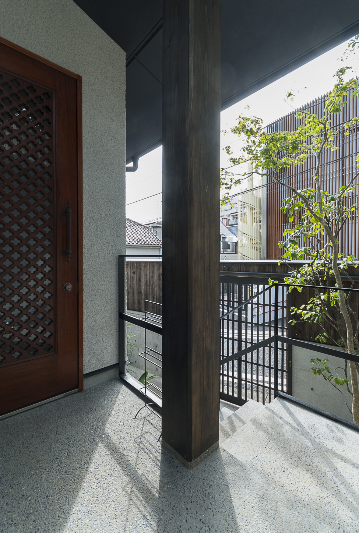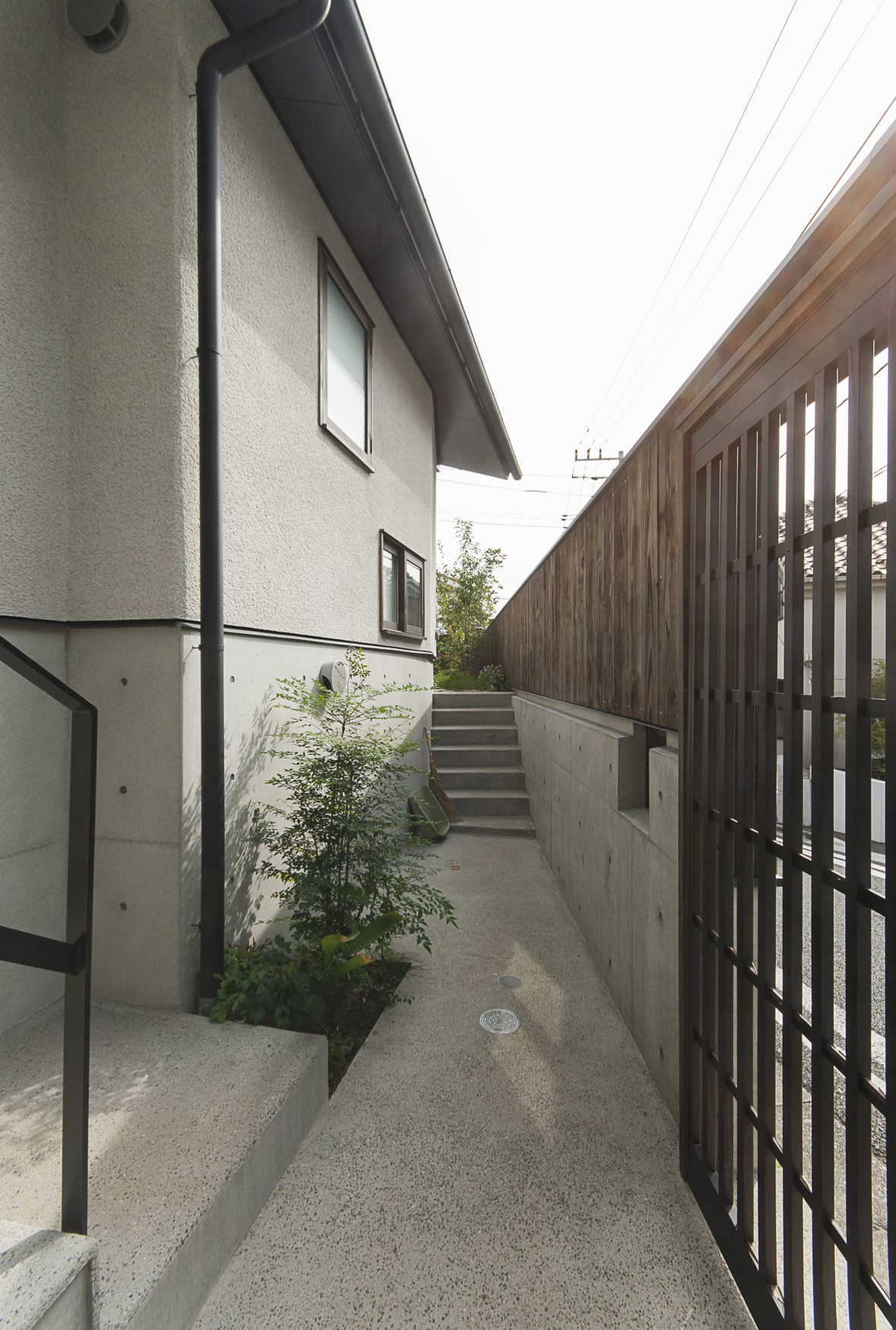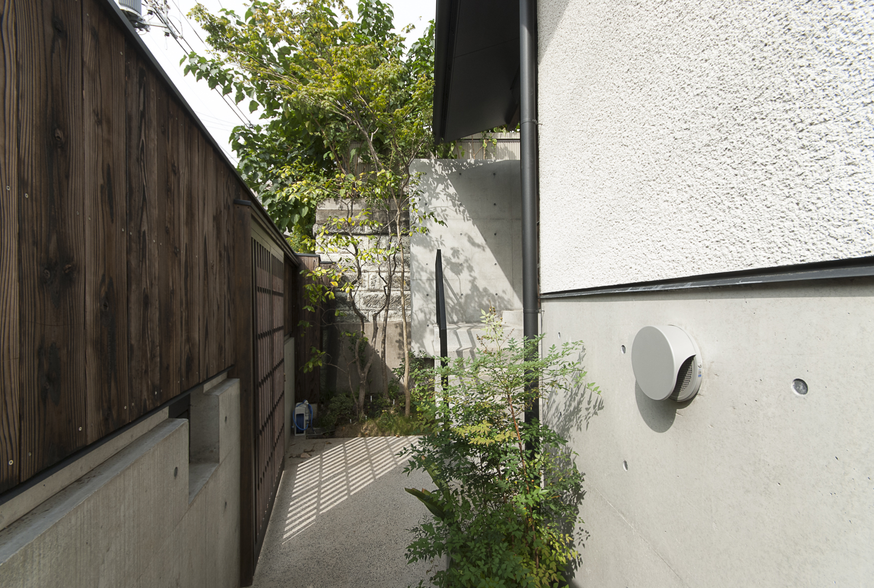 外観は、焼杉の塀と打ち放しコンクリートの組み合わせになっています。リビングダイニングから外部に向かう視線の抜けや、外部からの視線への対策は塀の高さで決まる為、慎重に検討を行いました。また、塀の下端に水切りを取り付け、汚れやすい打ち放しコンクリートが汚くならない様に配慮しています。