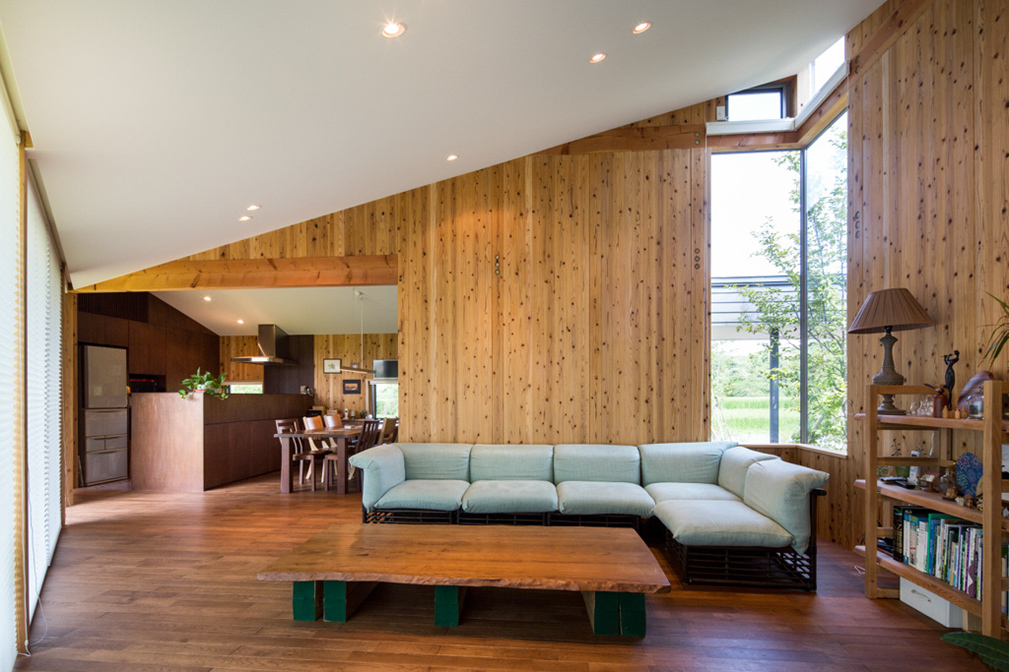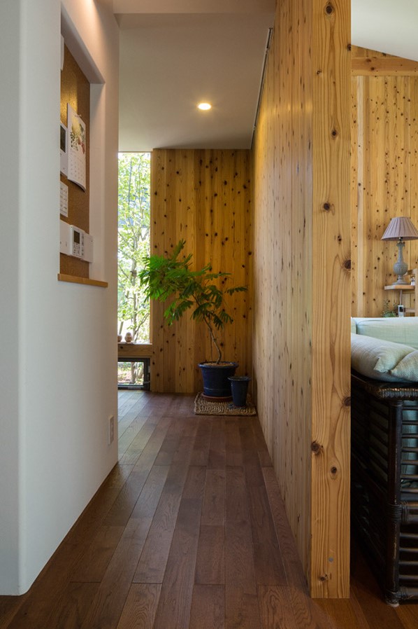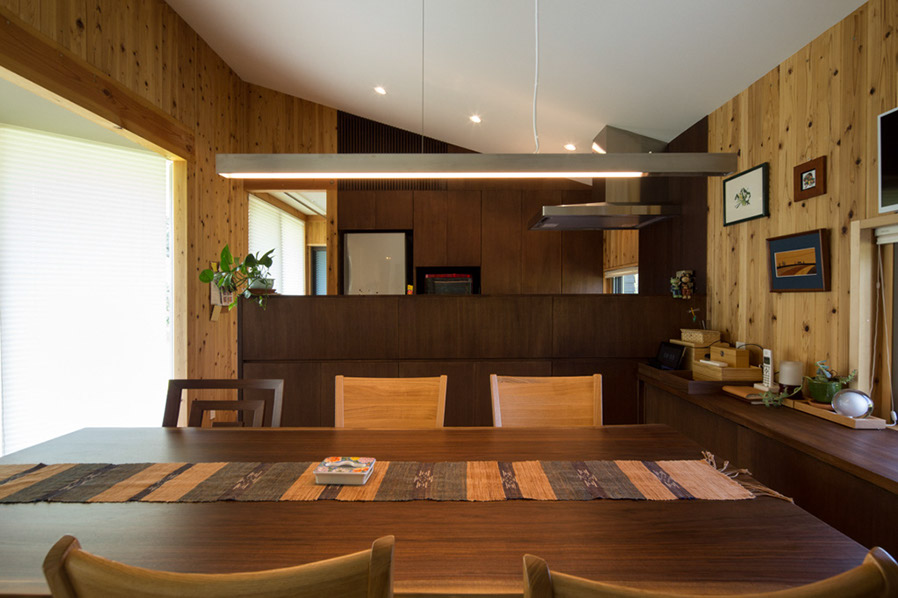 この工法で造る住宅の性能の良さは、東北で再建住宅を作っていてよく分かっていましたが、私共が設計する住宅のテイストを気に入って下さる方には、節もある木が全面に表れた住宅は好まれないこともよく理解していて、私どもからはあまり奨めないできました。しかしこの住宅を設計してみて、木が露になっている量のバランスで雰囲気が全然違って来ることがよく分かりました。視野の中に、同種の木の露な量が占める割合が固まって30%ぐらいだと、多少節のある木があっても、それがむしろおしゃれに見えてきます。