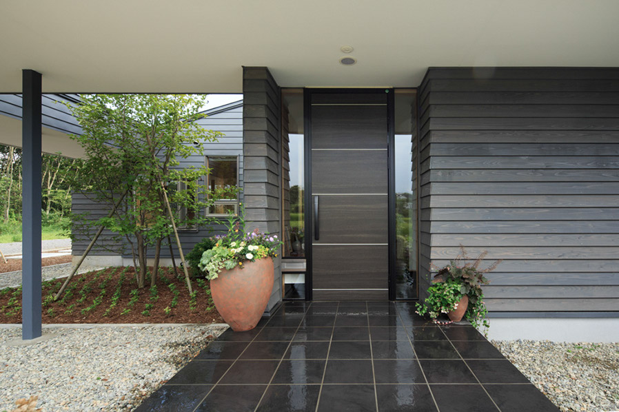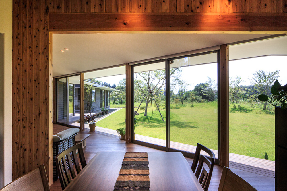 そこで茶臼岳から吹き下ろす冷たい風を、敷地の北と東の道路沿いに植えた防風林で保護し、建物もL字型に配して南の庭を囲い、全室から庭全体が見渡せるようにした平屋の住宅です。