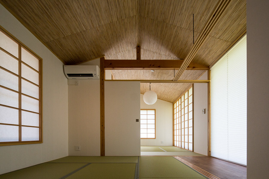 被災地沿岸では既にこのFSB工法で、個人の再建住宅として4棟を安価に建てています。しかし那須町では角材の連結パネルの製作が初めてのためか、思った以上に費用が要するということで、断熱の必要のない車庫だけは在来の工法で建築しています。母屋部分の内部は角材連結パネル表しのままですが、離れでは、趣を少し変えようと、パネルに直に土佐和紙を貼っています。