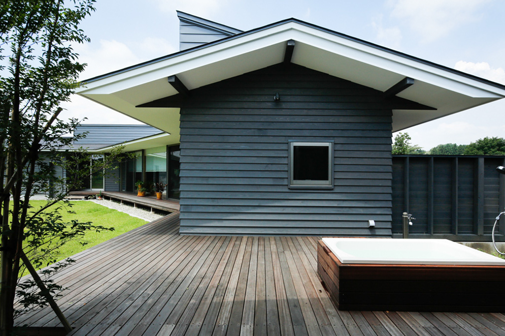 子供家族用の部屋は離れとし、ミニキッチンとトイレ及びシャワーも併設し、母屋とはデッキスペースを介して行き来します。その間に露天風呂用の浴槽だけを設け、天板を載せれば屋外リビングのテーブルにもなります。