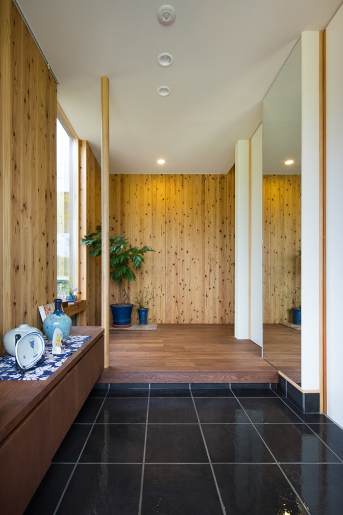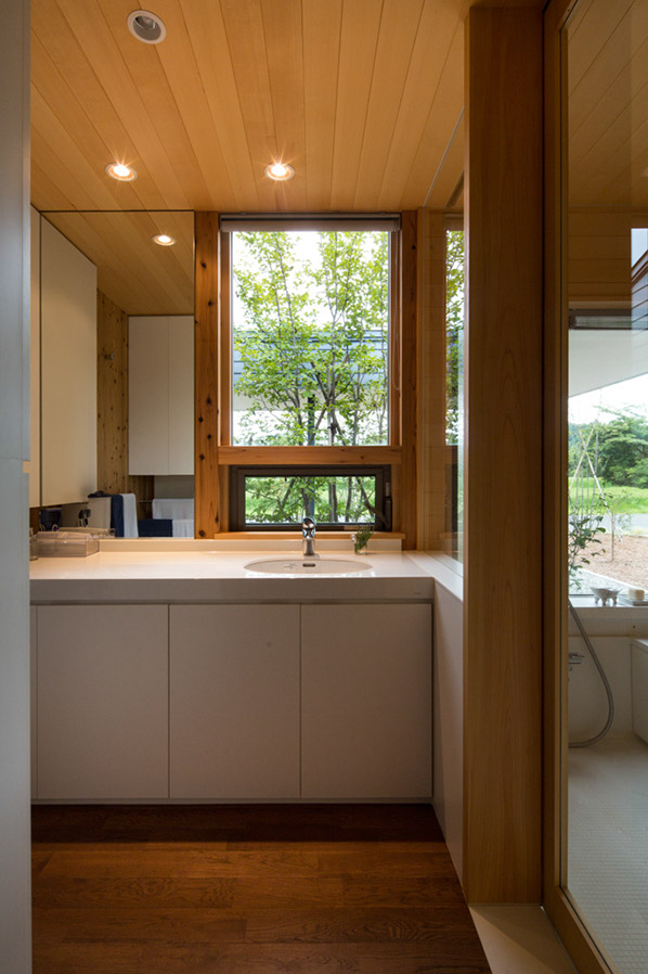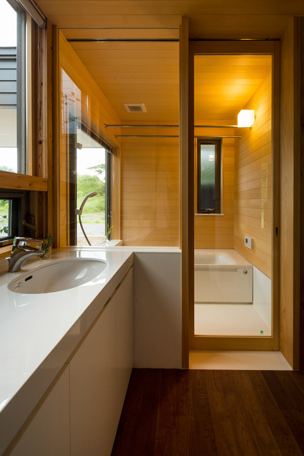 東北の角部分は、水平感を強調するために、北と東の軒先の屋根だけを延長させ、中庭的スペースを作り、道路からの緩衝地帯ともしつつ、玄関、居間、洗面所、浴室等から眺められるプライベートコートとしています。