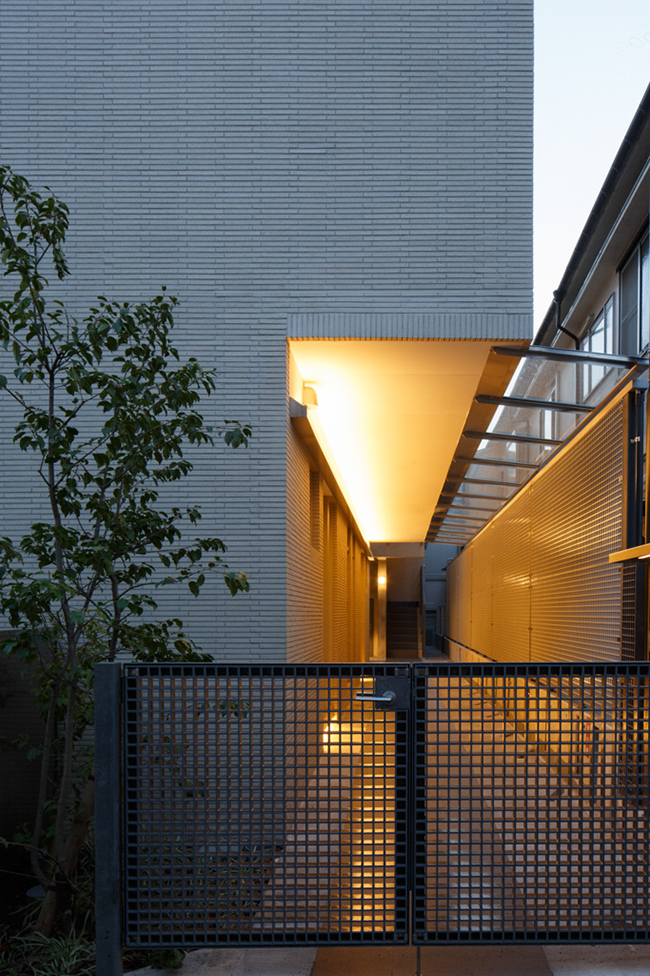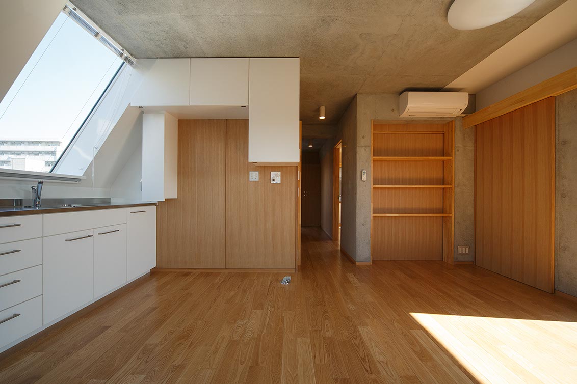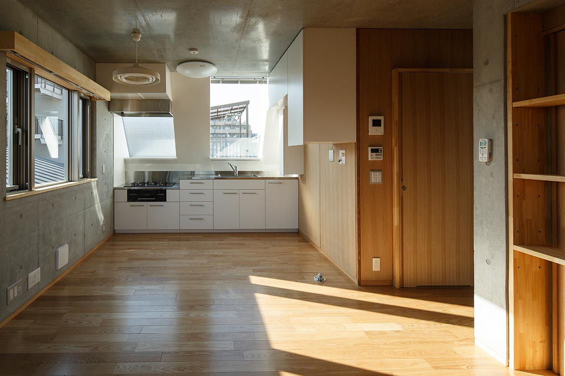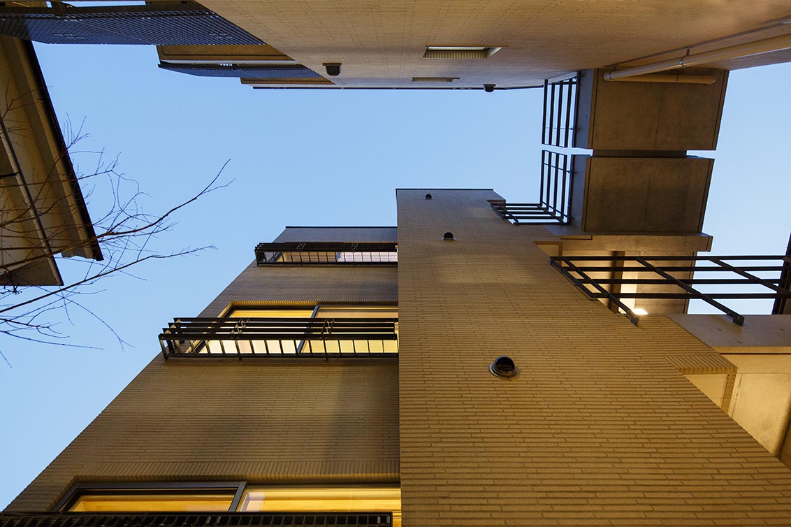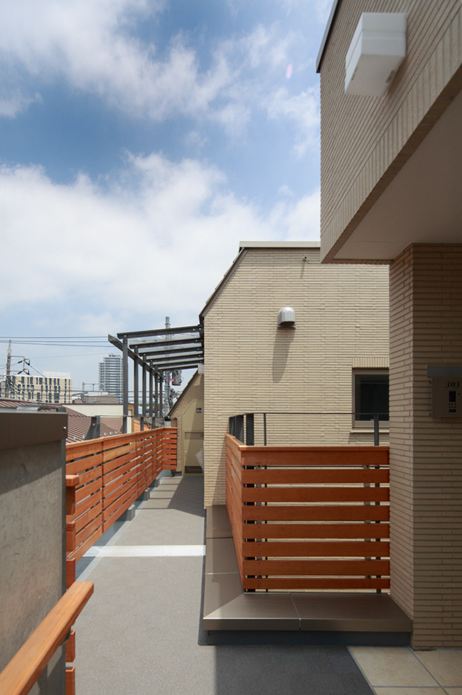 各戸の面積も分譲並みの広さで計画しています。外壁は選択に吟味を重ねた特徴のある細めのタイル。その下地には経垂れや剥離の無い、無機質系の外断熱材を同時打ち込みにしてあり、躯体全体が蓄熱体なり、外気温に左右されない温熱環境を有した戸建て並みのレベルの建築となっています。