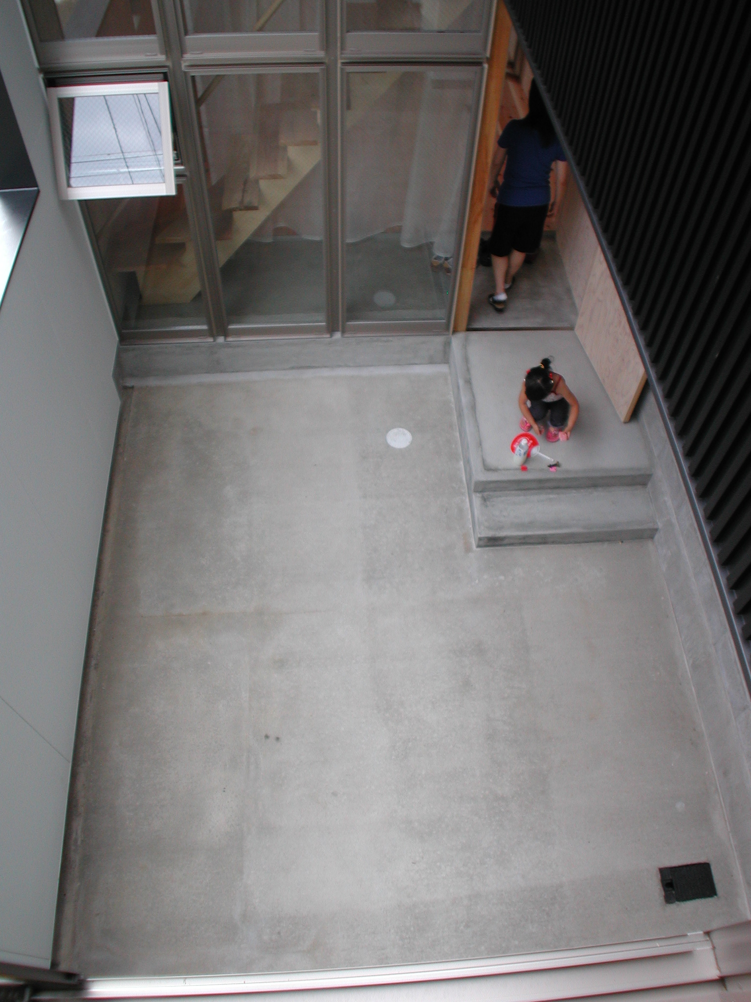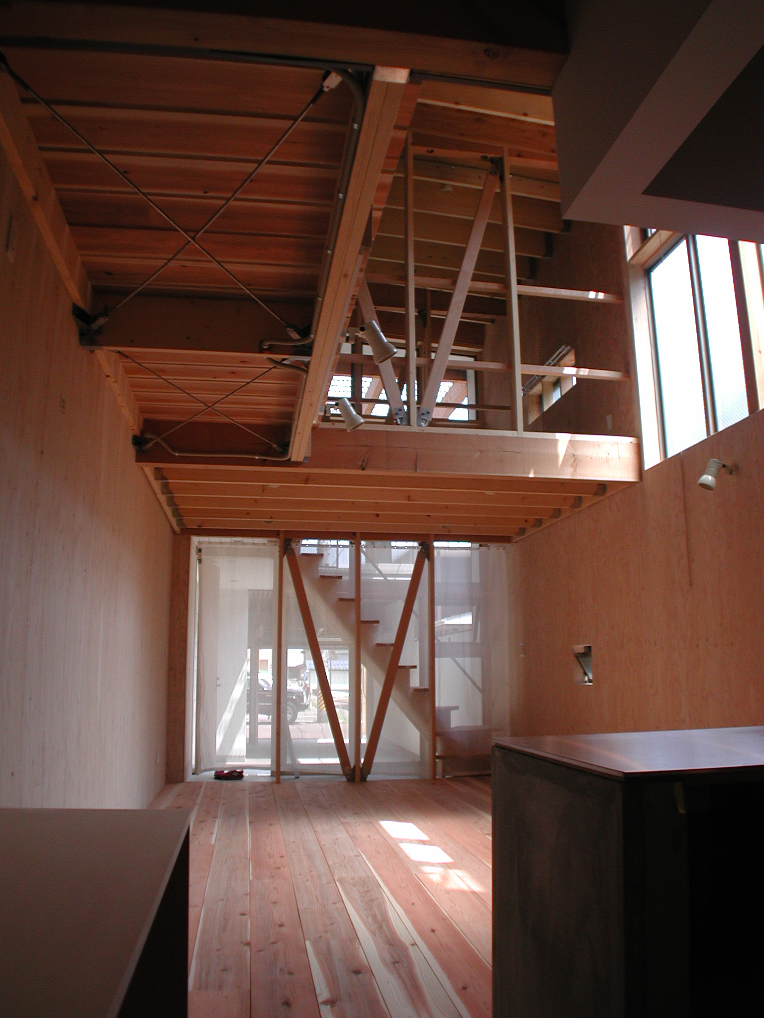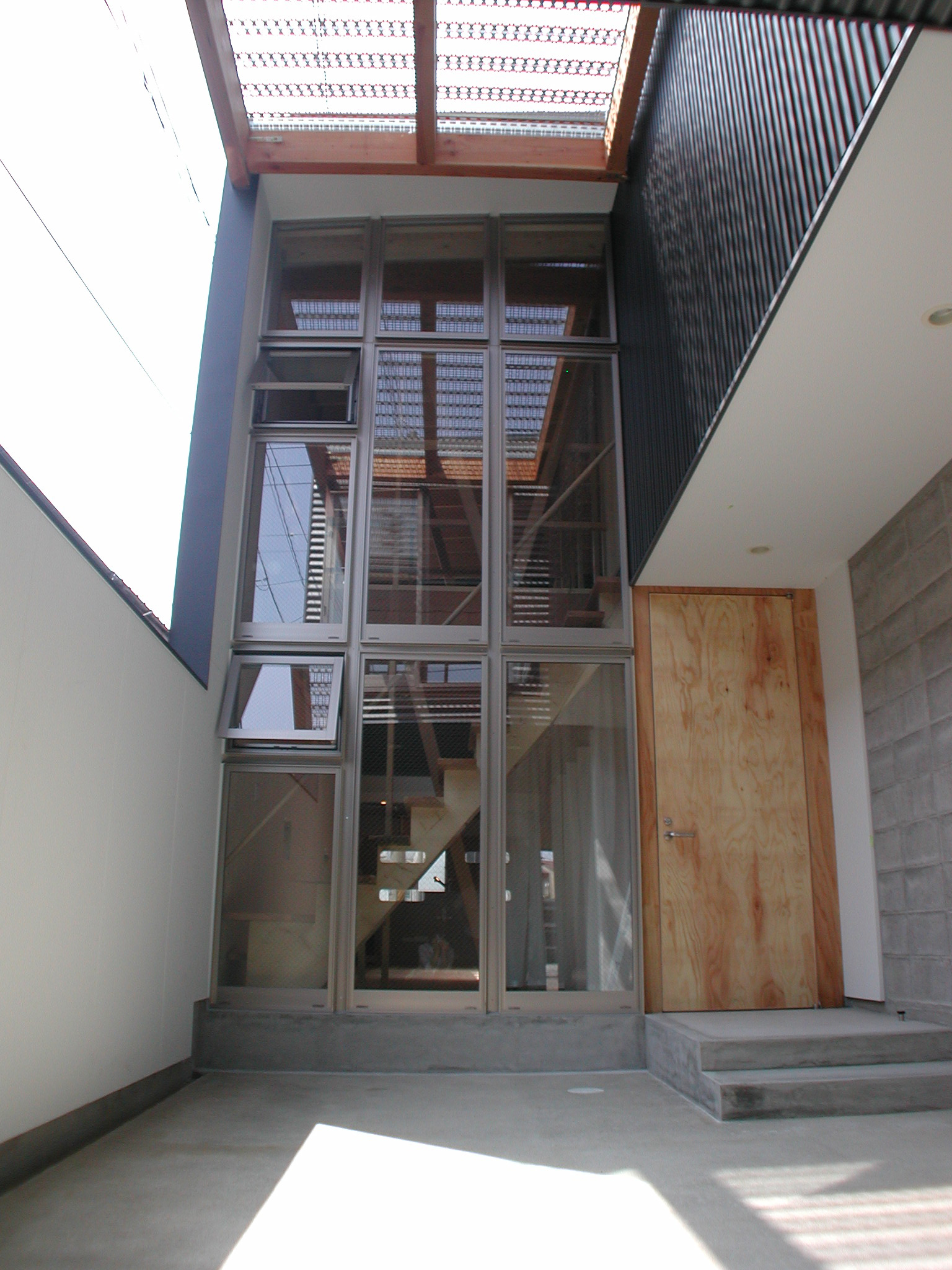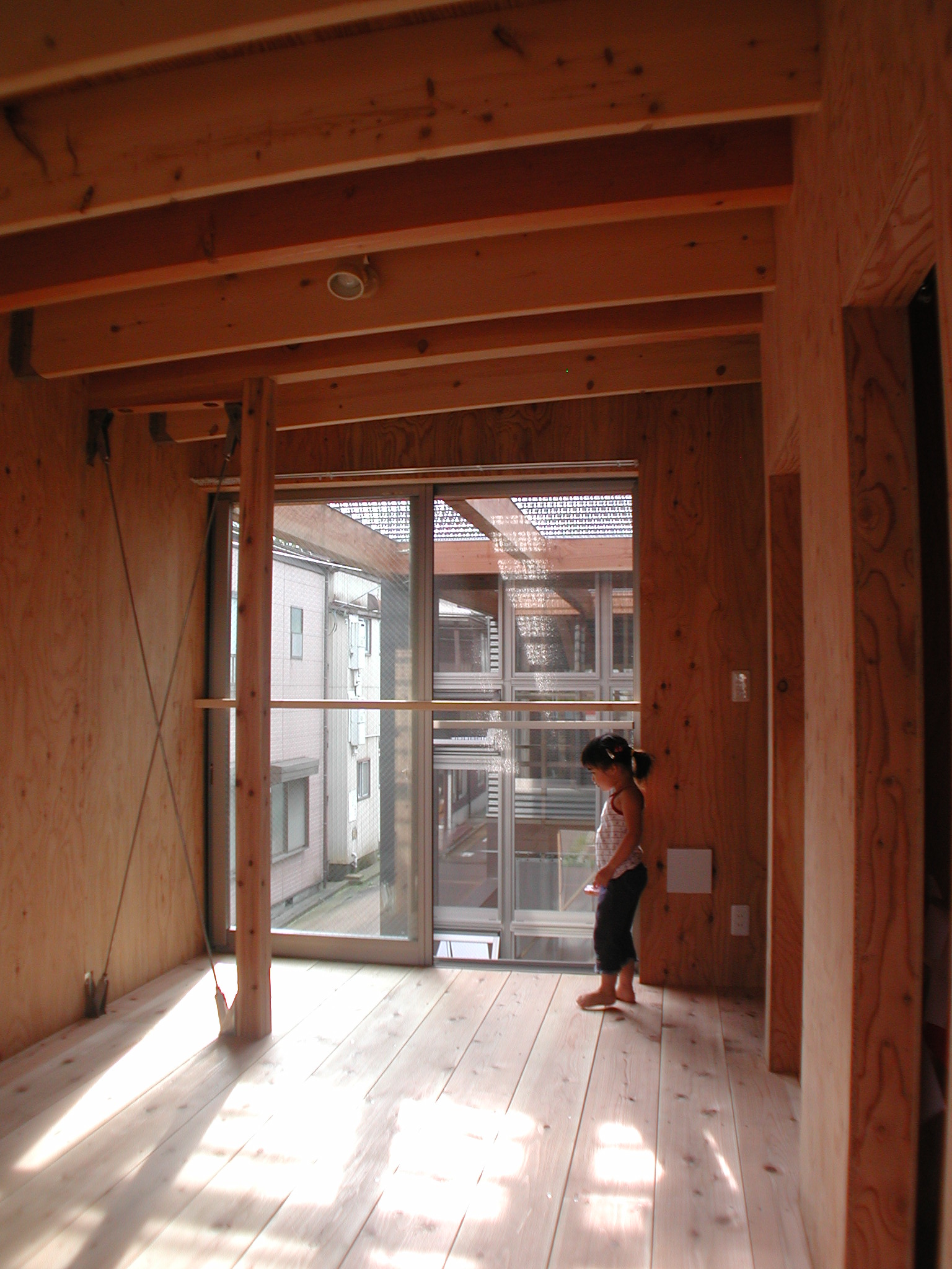 3方向を隣家に挟まれる、間口3.9m×奥行き25mと極端に細長い敷地であり、集団除雪の時しか雪下ろしをしてはいけないため積雪荷重2mの条件を求められる条件から、余白を作らず敷地いっぱいに計画した細長い2層分の大きな箱の中に、浮遊した3つの個室と光庭と吹き抜けを組み合わせることで、どの季節であっても光と風を取り込む快適な住環境を作っています。