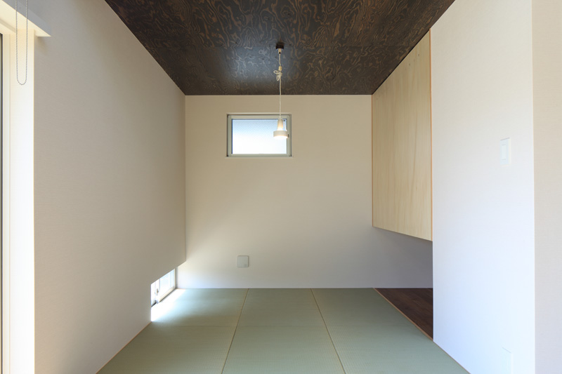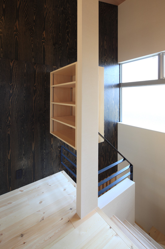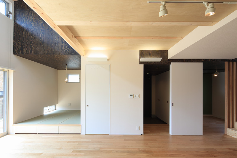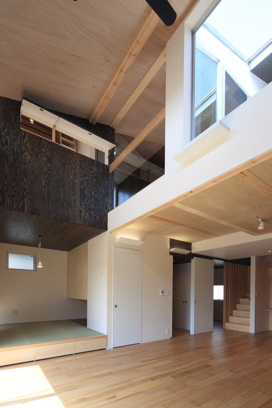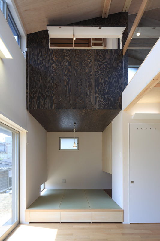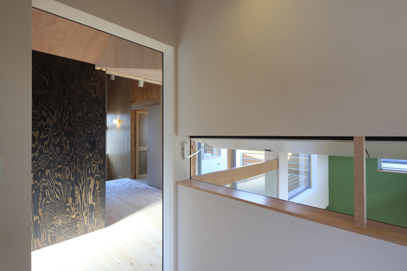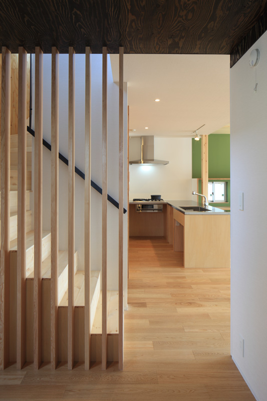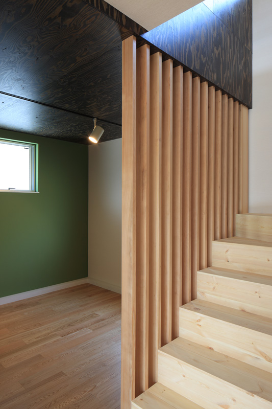 1階奥に配置したご主人のための趣味の部屋は、こもり過ぎないスペースがほしいと言う要望を受け、階段の手すりを兼ねた縦ルーバーで穏やかな領域わけとした。小上がりにしたリビング続きの和室と共に、穏やかに領域わけされた、ワンルームに近い開放的な1階を実現している。
