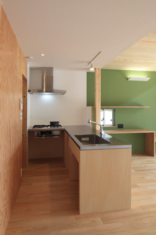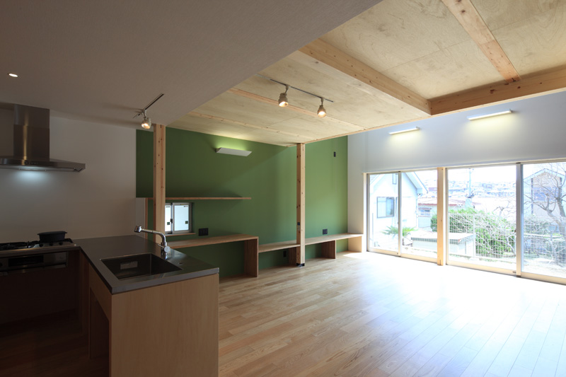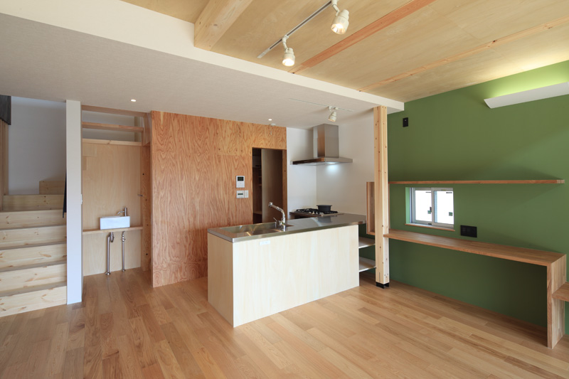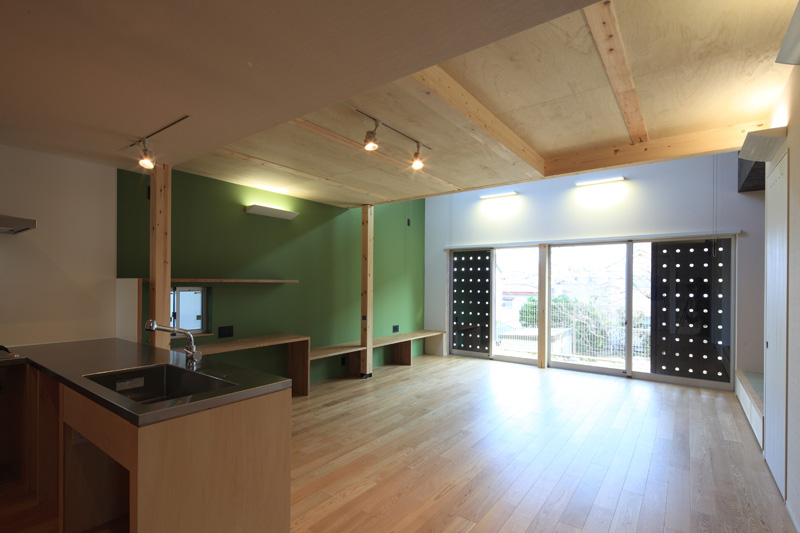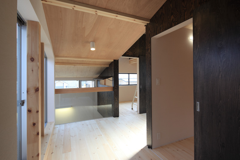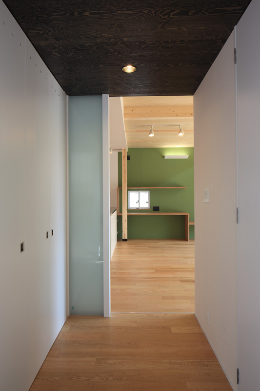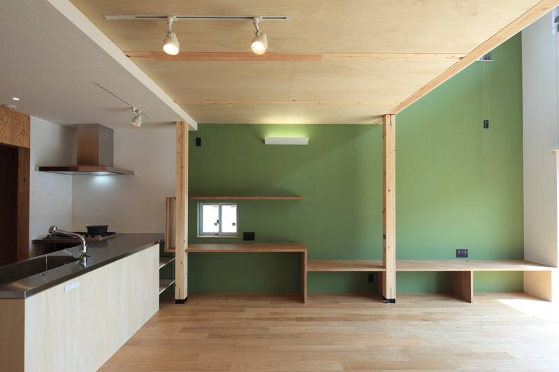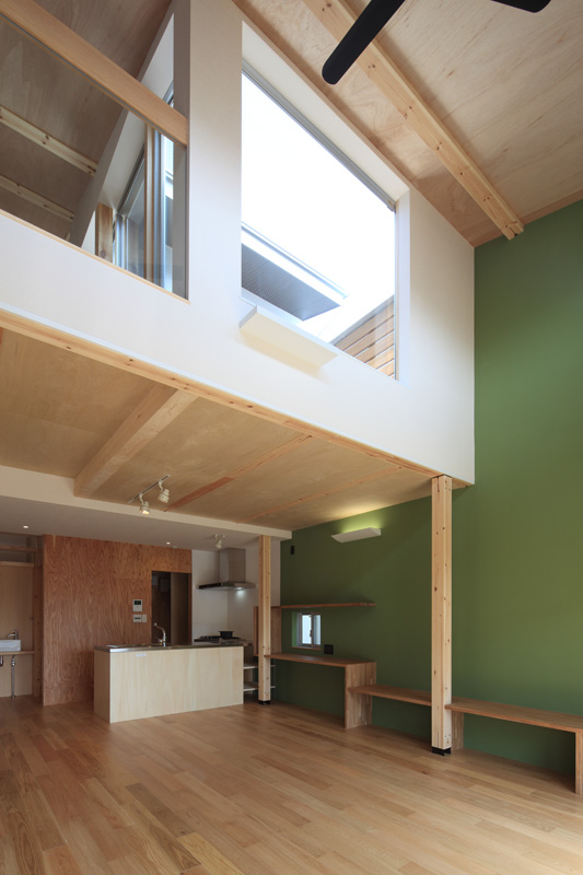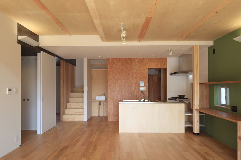 1階奥に配置したご主人のための趣味の部屋は、こもり過ぎないスペースがほしいと言う要望を受け、階段の手すりを兼ねた縦ルーバーで穏やかな領域わけとした。小上がりにしたリビング続きの和室と共に、穏やかに領域わけされた、ワンルームに近い開放的な1階を実現している。