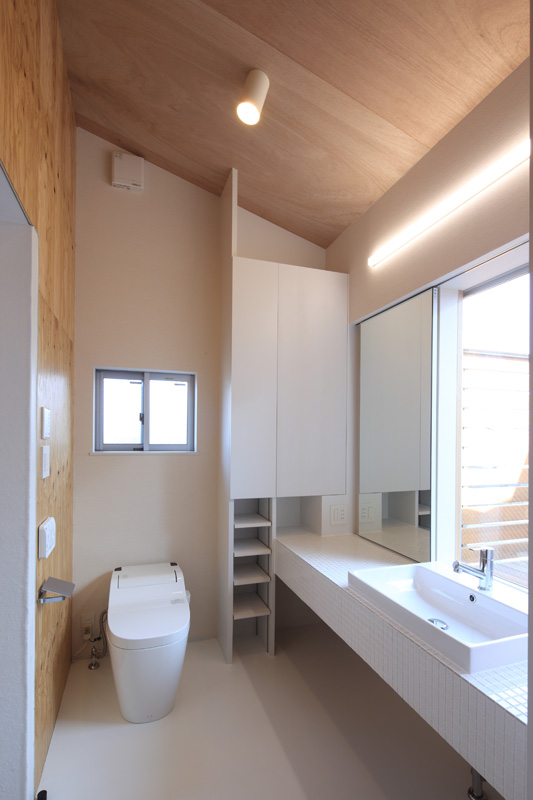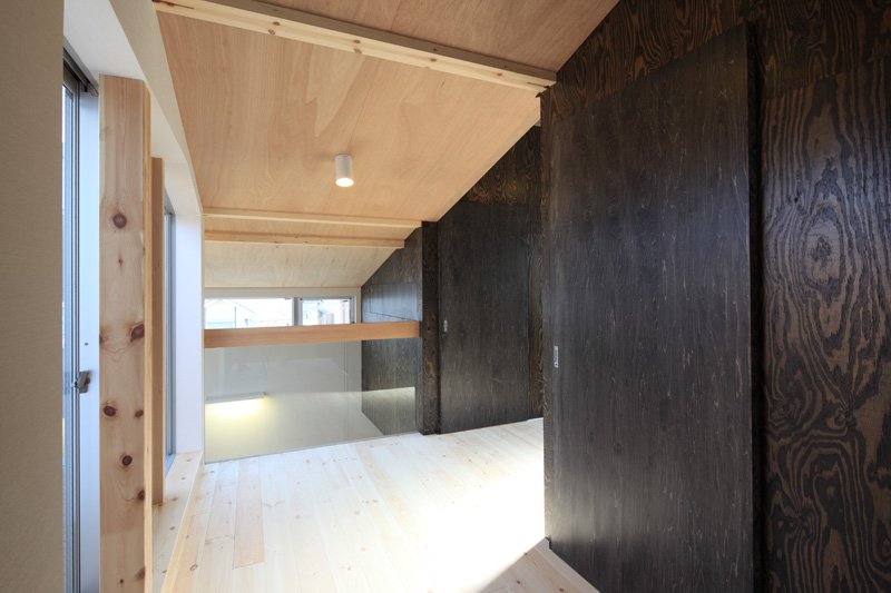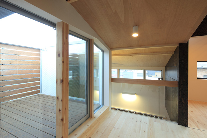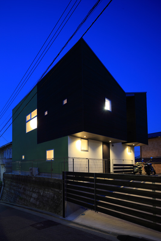 南傾斜の屋根を持つ個室と、北傾斜屋根を持つ個室がV型の屋根を形成しながら突出する特徴的な外観は、太陽光発電のための南傾斜屋根とロフトを確保するための北傾斜屋根から生じた必然性のある形で、南傾斜屋根はそのまま片流れ屋根となり、リビングの南面に対して有効な庇を形成している。