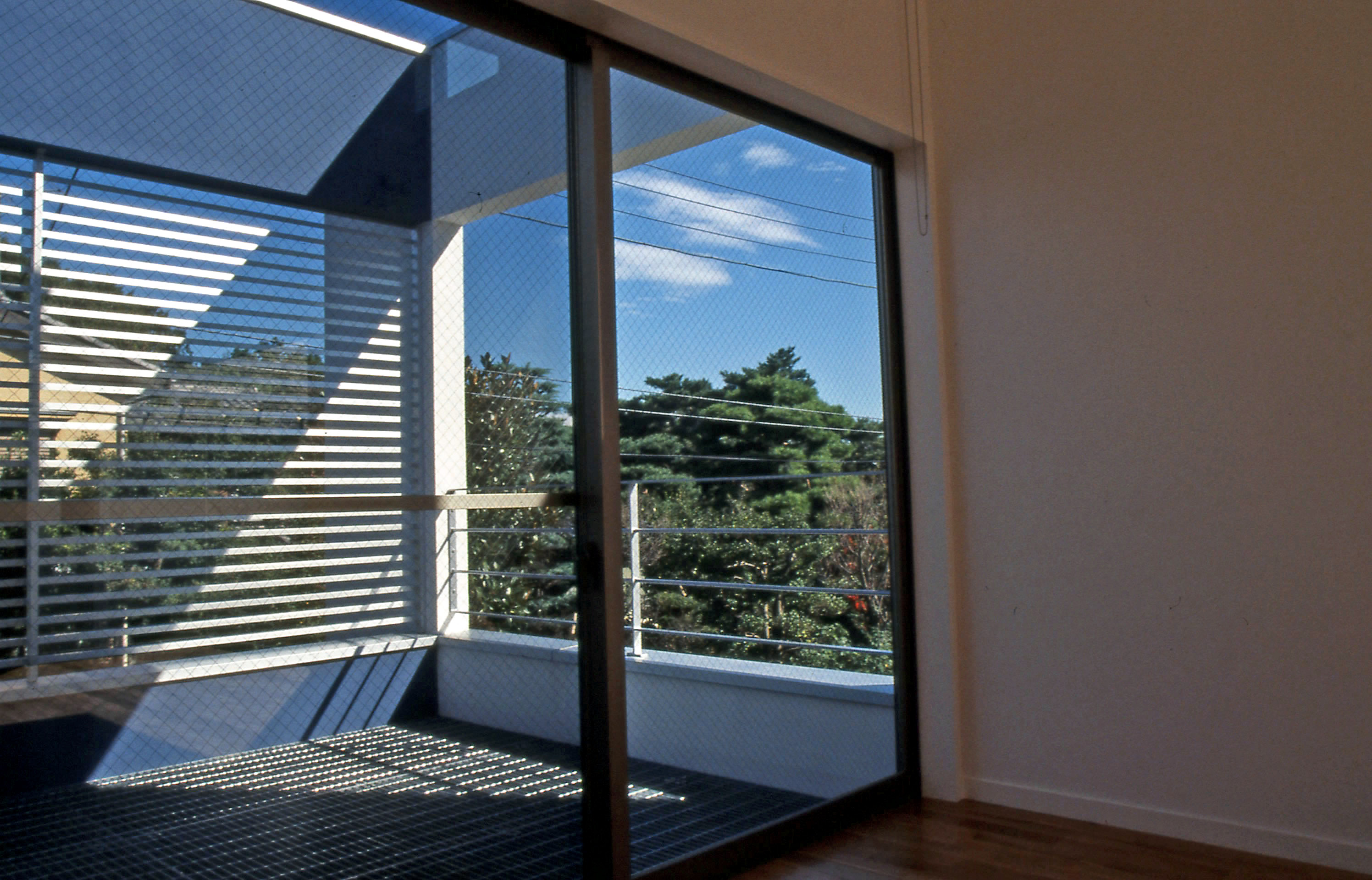また、2階北側テラスの道路側に面する部分をアルミアングル材によるルーバーで覆うことで内外に対して圧迫感を与えずに風を通しつつプライバシーも確保しています。