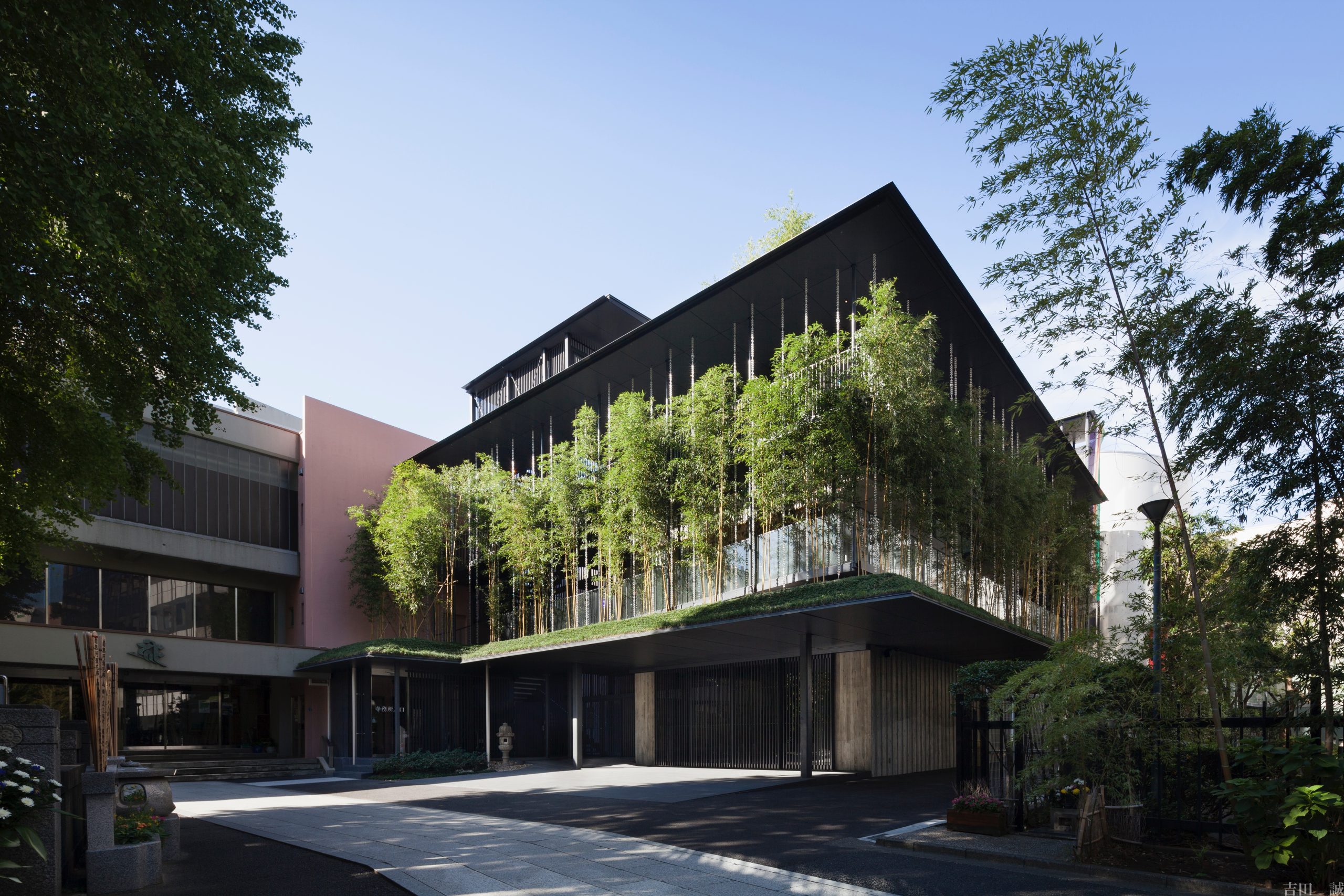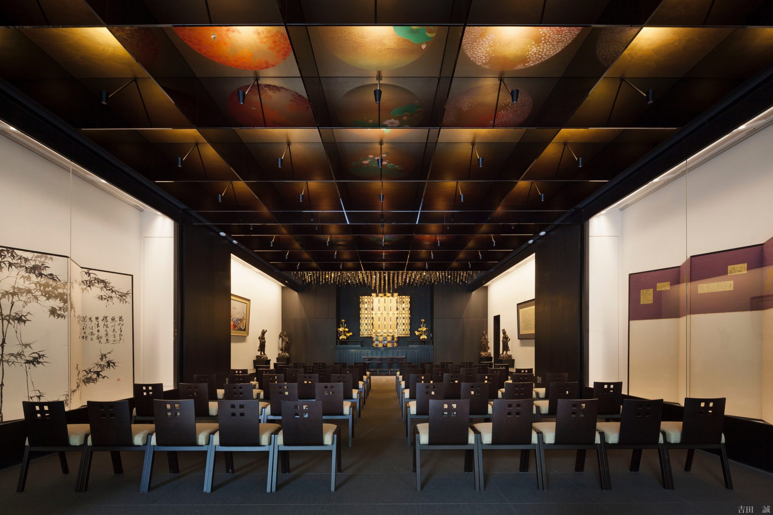 まわりをビルに囲まれた、東京の両国に建つ寺院である。今回の計画では念仏堂、客殿、僧院という3つの建物機能が求められた。広大な寺所があれば、それぞれの堂宇を点在させて回廊でつなぐことにより、伽藍を形成するのであるが、都会の限られた敷地では、境内空地を確保することも重要となってくるため、3つの建物機能を縦に積み重ねることとした。ただし積み重ねた建物機能はそれぞれ独立したものであるため、伽藍形式は踏襲し、建物内部をつなぐことはせず、外周の回廊で各部を巡るようにしている。