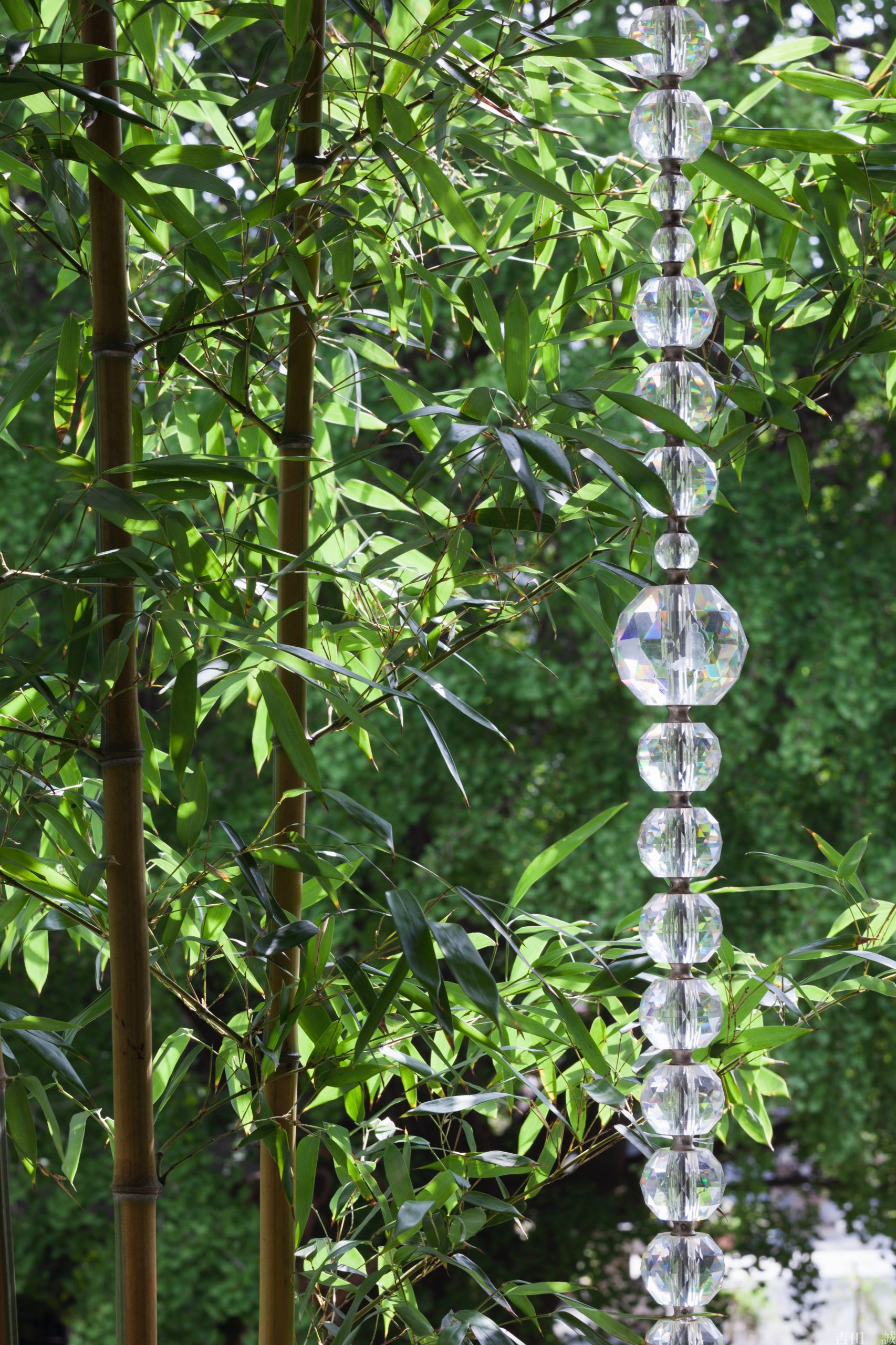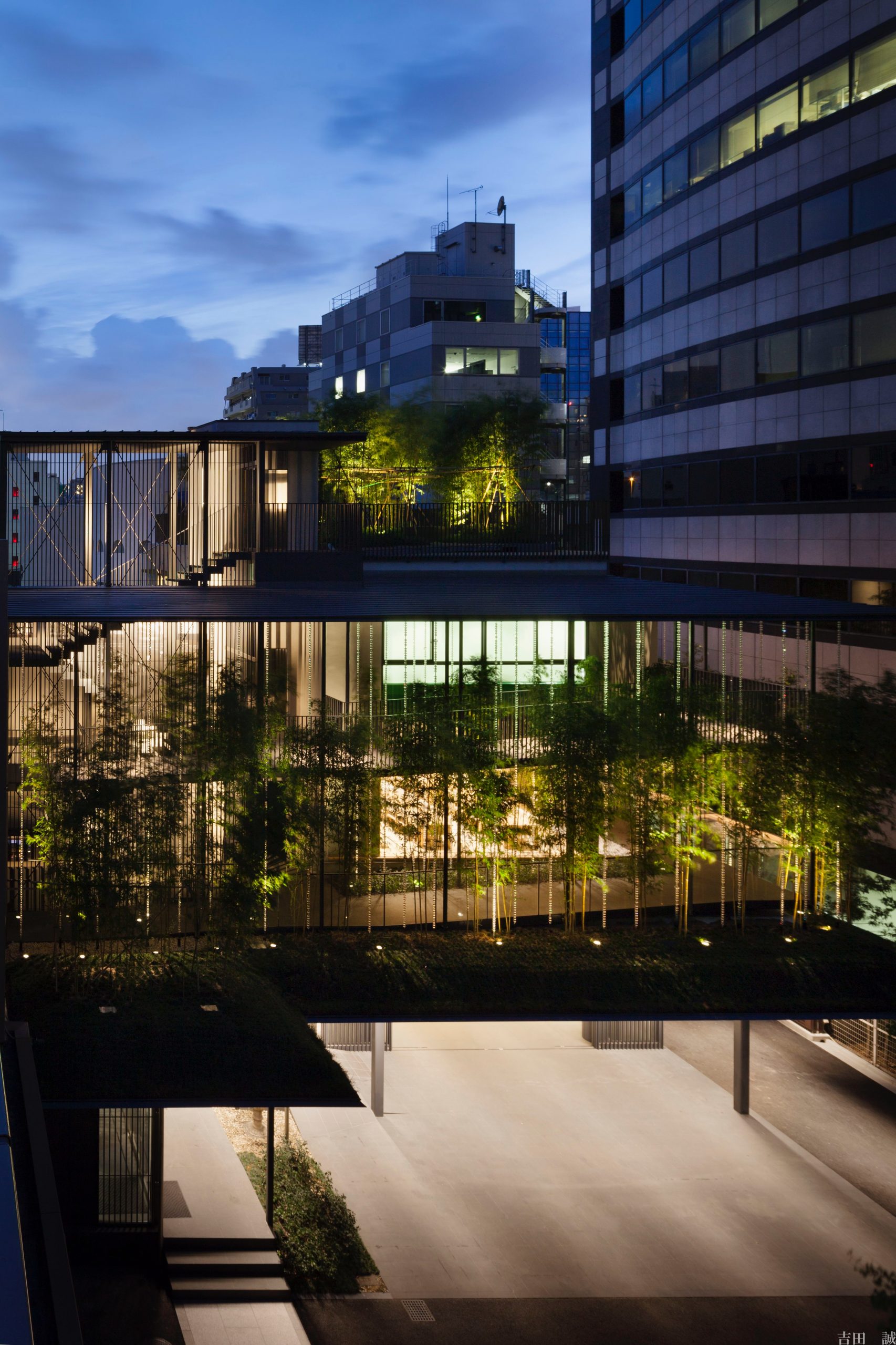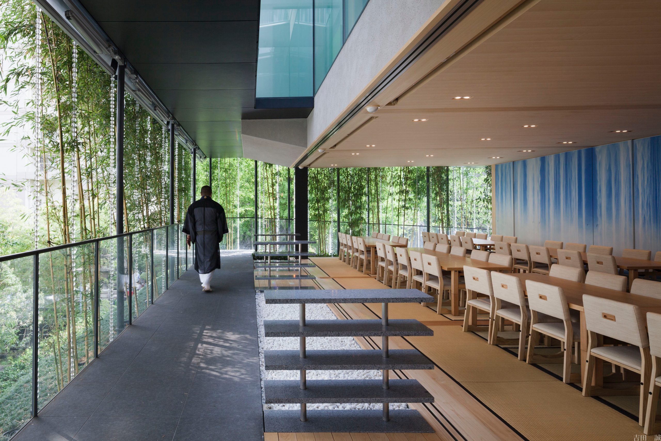 地上レベルは境内空地とし、上空の回廊沿いに参道から連続する竹を植えることとした。この天空の竹林の中には、108個のスワロフスキーが連なった数珠柱を点在させている。これは極楽浄土の道すがらにある七宝樹林の見立てであり、プリズムが発する七色の光は、数珠を繰りながら念仏を唱えることによって往生を約束された極楽の世界を垣間見るようである。