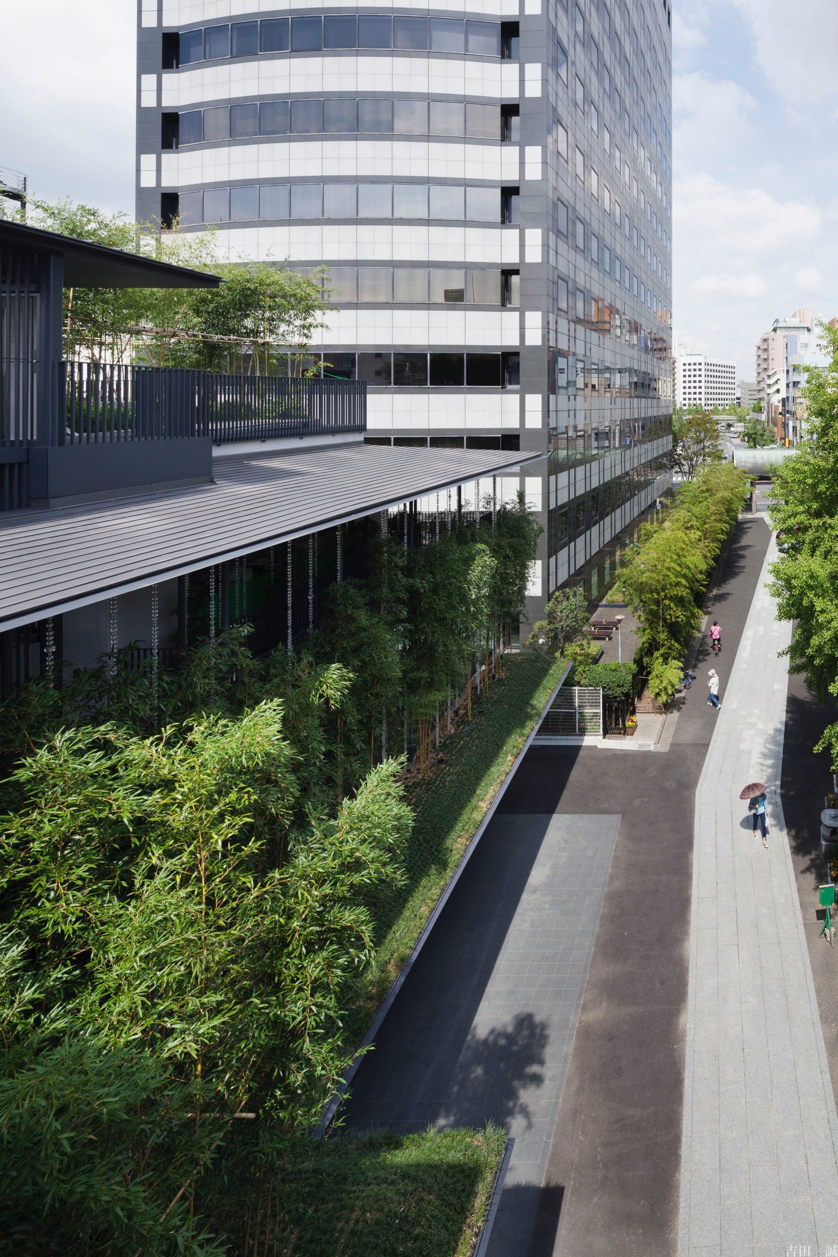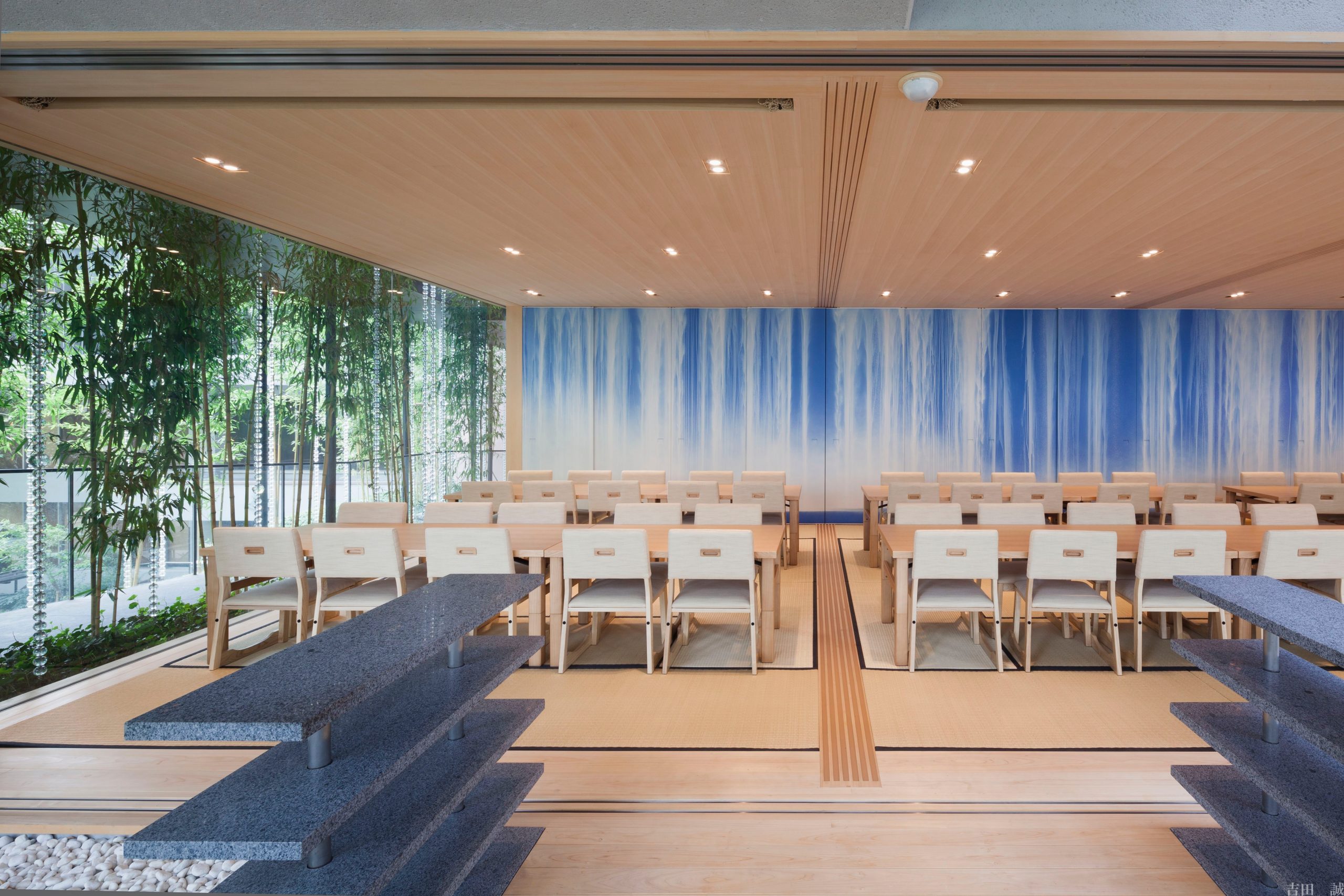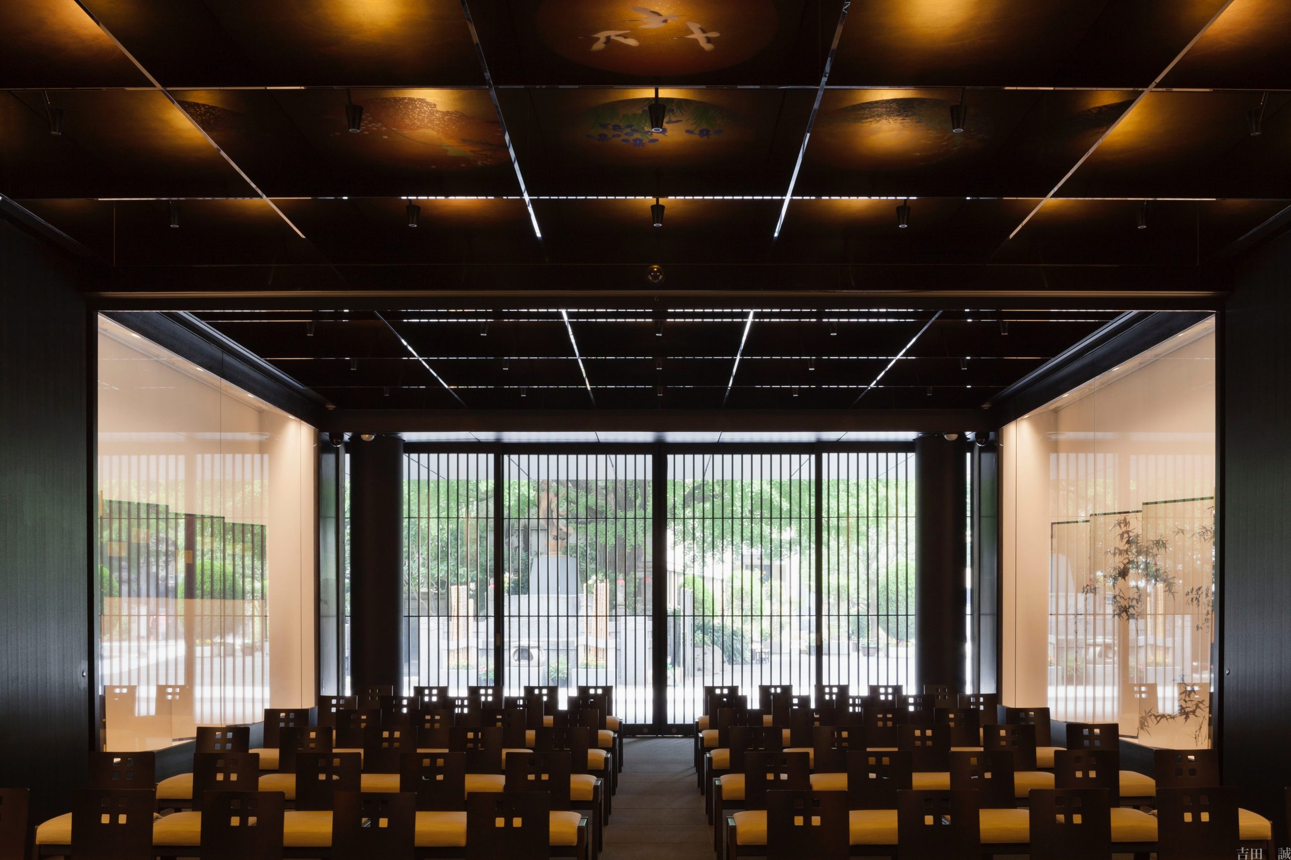 地上レベルは境内空地とし、上空の回廊沿いに参道から連続する竹を植えることとした。この天空の竹林の中には、108個のスワロフスキーが連なった数珠柱を点在させている。これは極楽浄土の道すがらにある七宝樹林の見立てであり、プリズムが発する七色の光は、数珠を繰りながら念仏を唱えることによって往生を約束された極楽の世界を垣間見るようである。