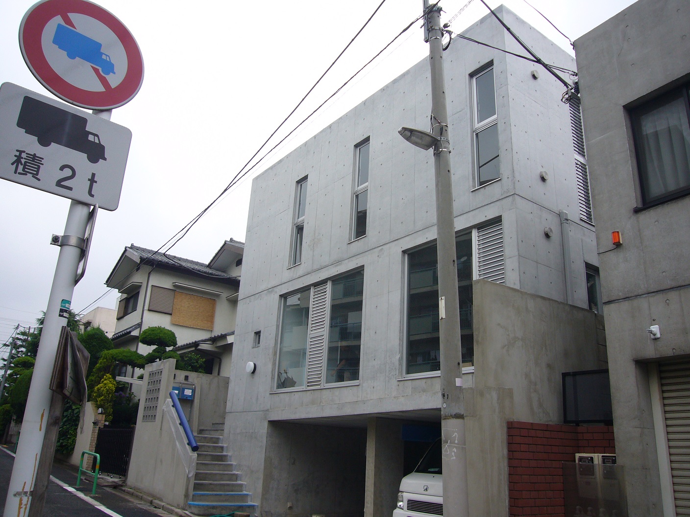 敷地レベルが道路レベルよりも2m近く高いため地下をカーポートにして外部階段を上って各玄関へとアプローチします。