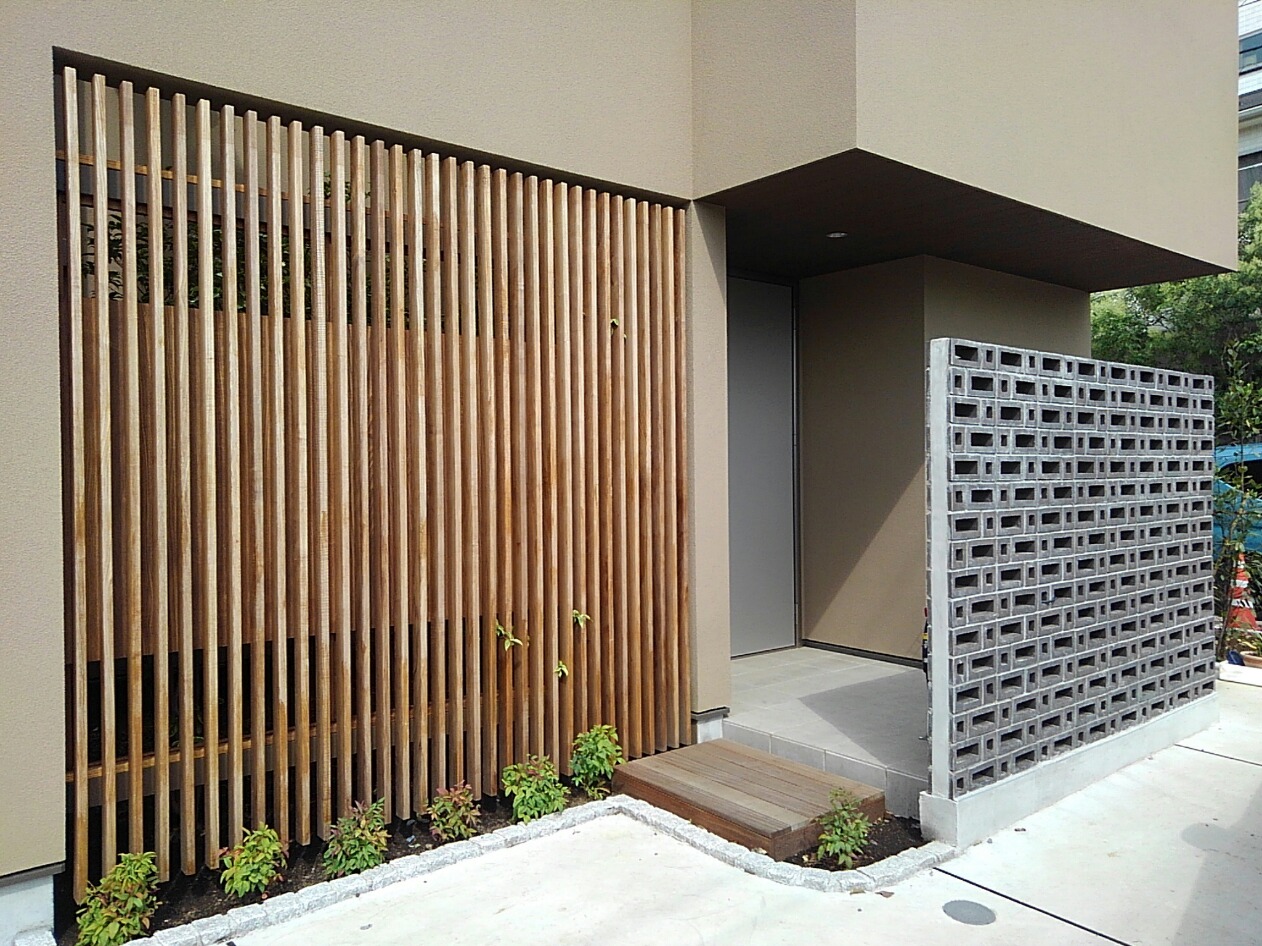 また、中庭の道路側には目隠しと風通しを兼ねた木製竪格子を、玄関アプローチには孔空きブロックの塀を設けることで、家の顔となる外観にリズムと変化を付けました。