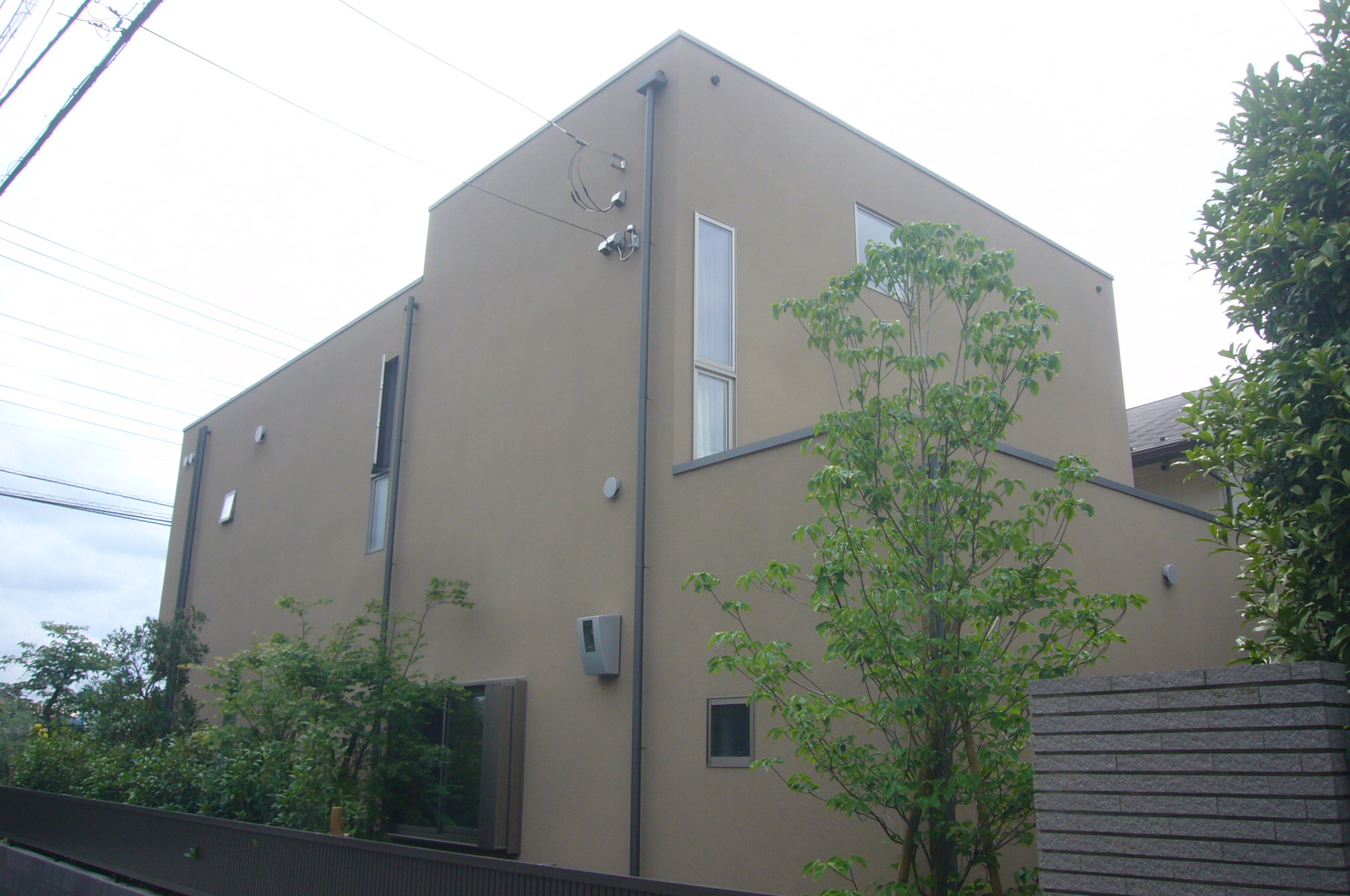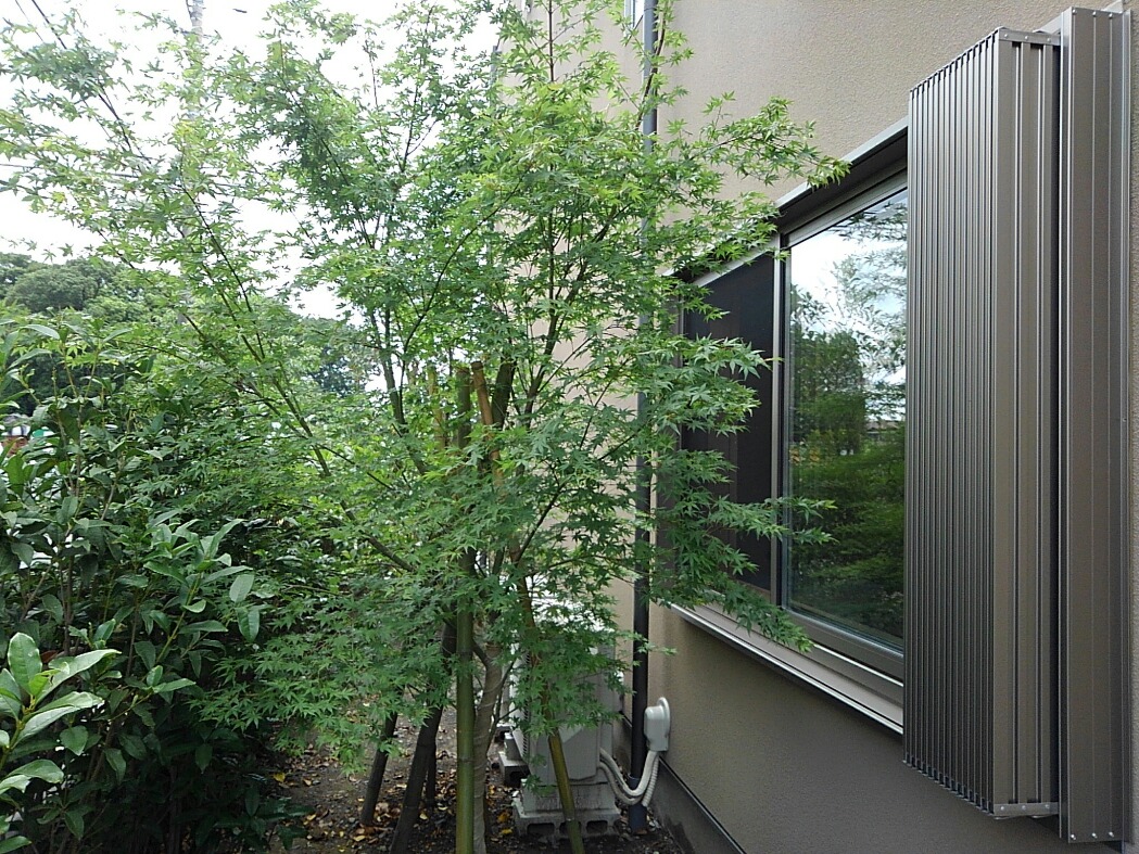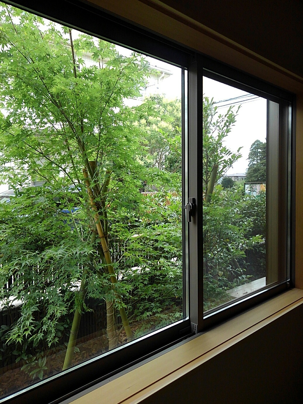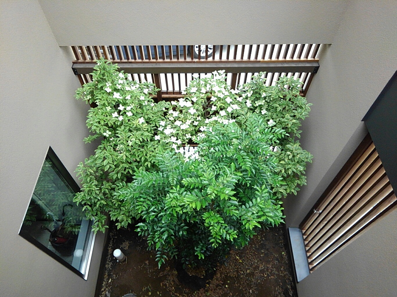 植栽計画は条例に従い、敷地面積の10%以上となるように樹種、樹木の本数、大きさや配置などを考慮しつつ、建て主と造園業者と打合せを重ねてハナミズキ、イロハモミジ、ホンサカキ、ヤマモモ、カラタネオガタマ、オリーブ、月桂樹、シマトネリコ、ヤマボウシ、オタフクナンテン、キンモクセイを植えました。