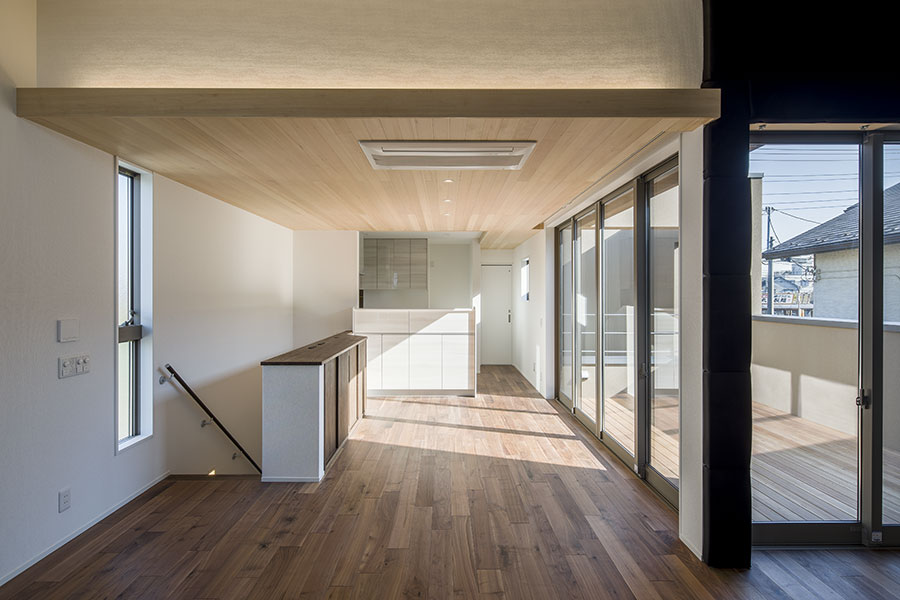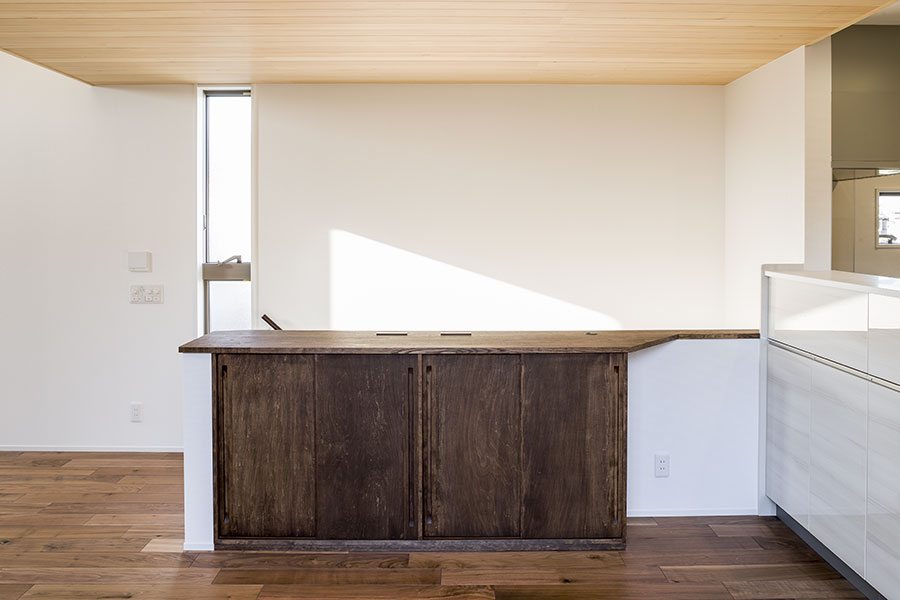 1階のウォークインクローゼット・納戸部分は平屋にして、2階ダイニング・キッチンとリビングの天井高さに変化を付けることにより、高さの異なるボリュームを組み合わせた三つの屋根のあるコートハウスになりました。