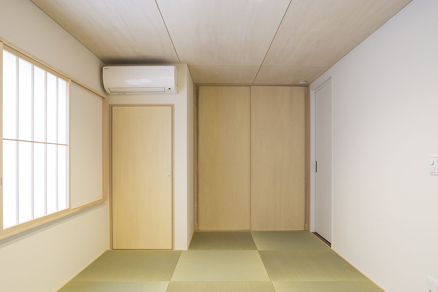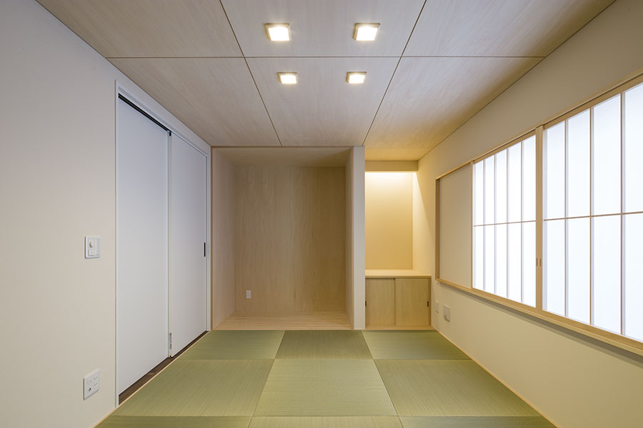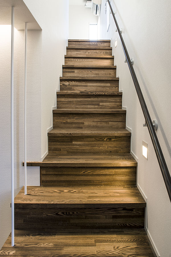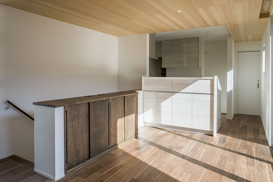 日当たりとご主人の趣味などを考慮して1階を寝室・和室・浴室・洗面室といったプライベート空間に、2階をリビング・ダイニング・キッチンといったパブリックな空間のプランとしました。