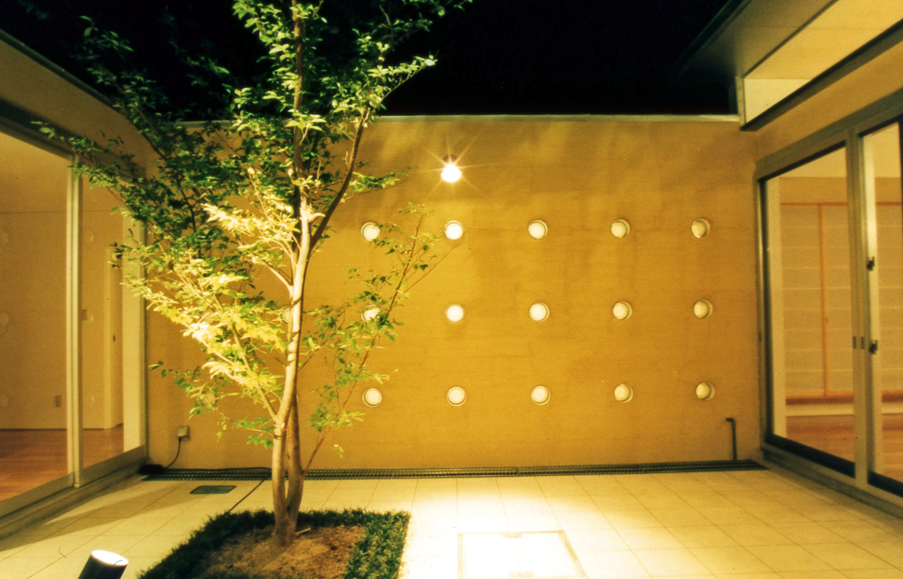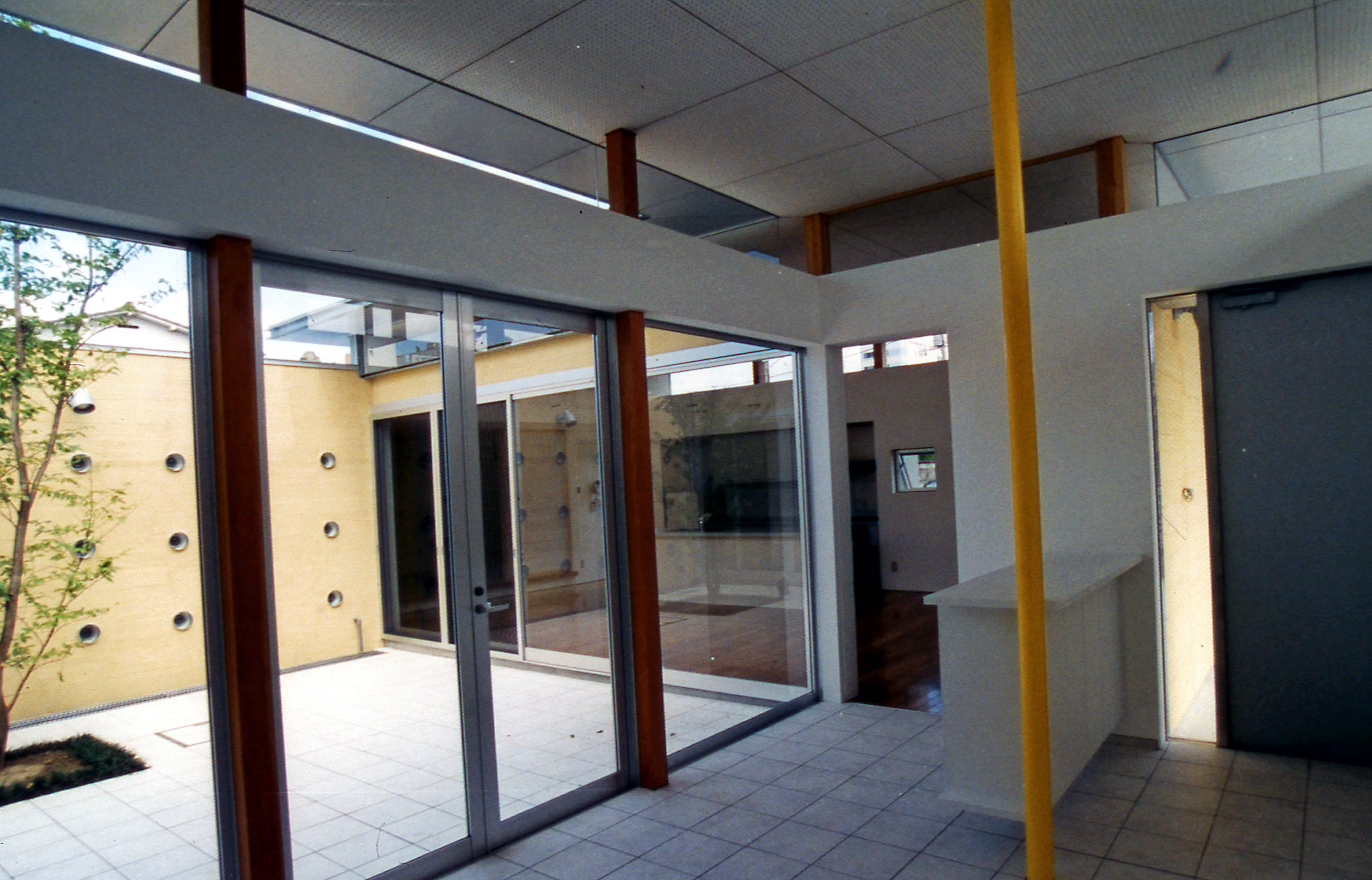 玄関ホールの正面に中庭を挟んで洗面脱衣室、便所、浴室といった水廻り設備あり、また中庭を介してパブリックスペースであるリビング、ダイニング、キッチンスペースとプライベートスペースであるご主人の書斎と寝室に分けました。