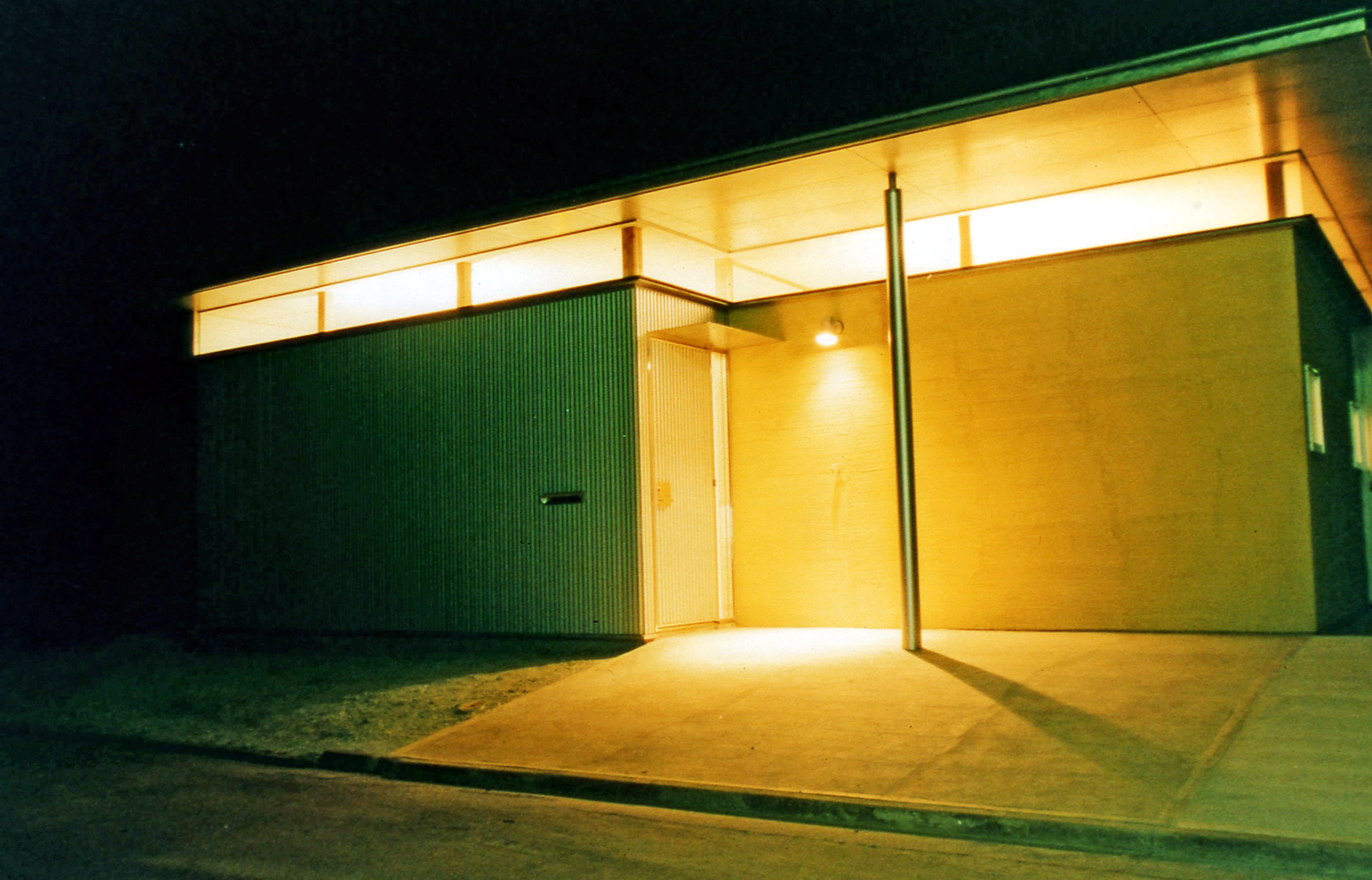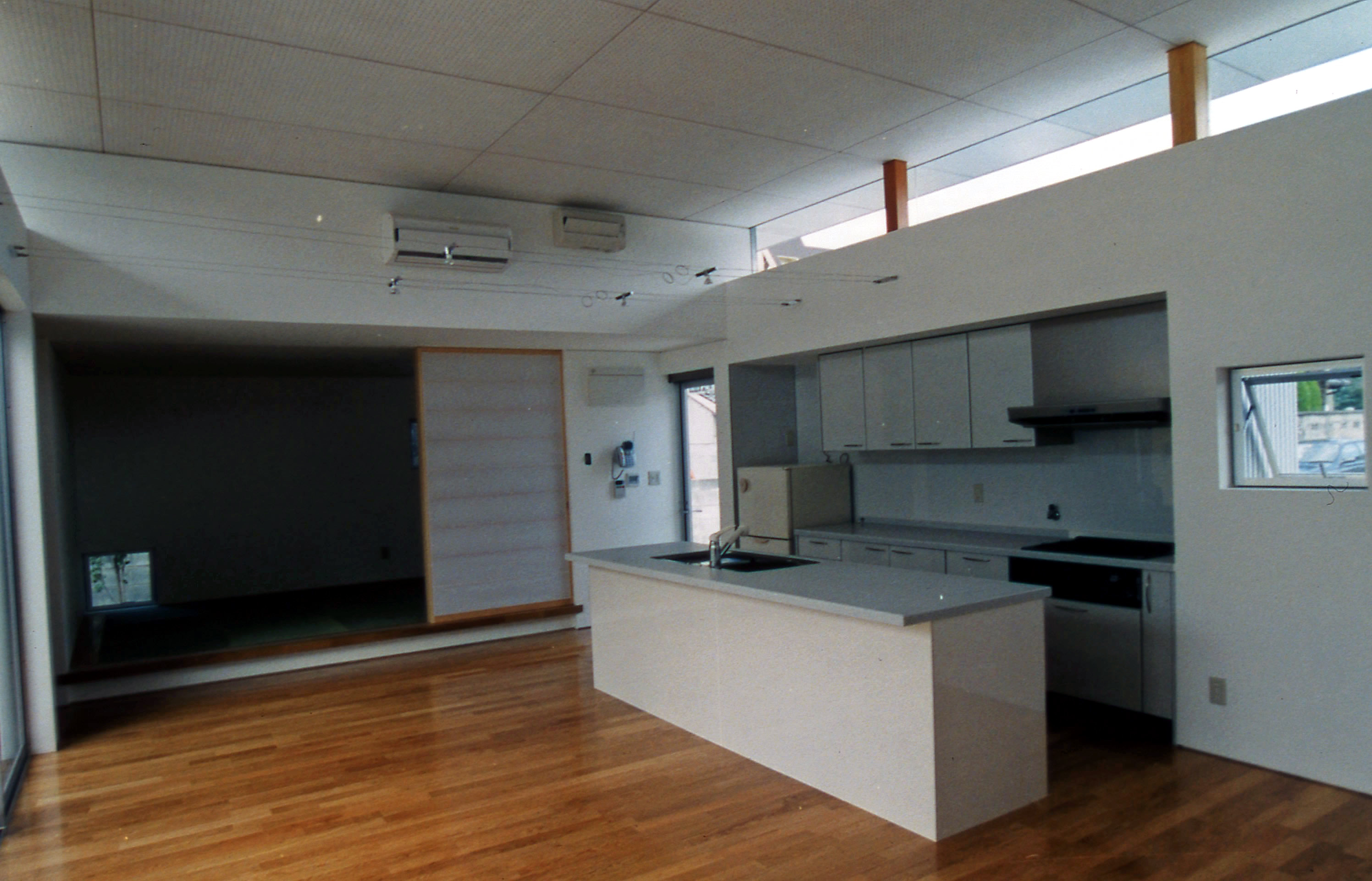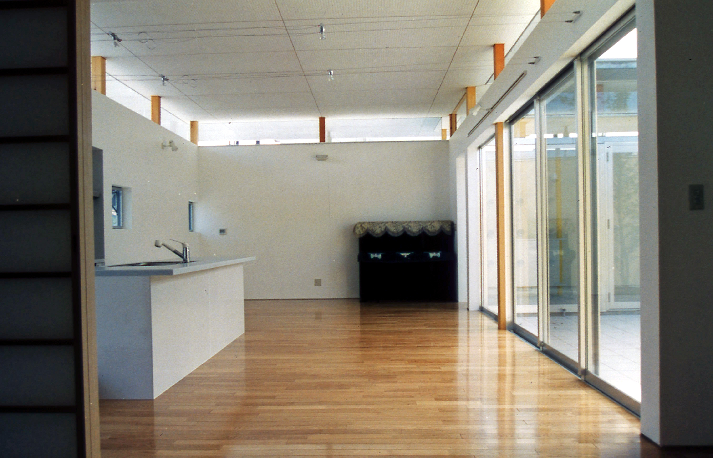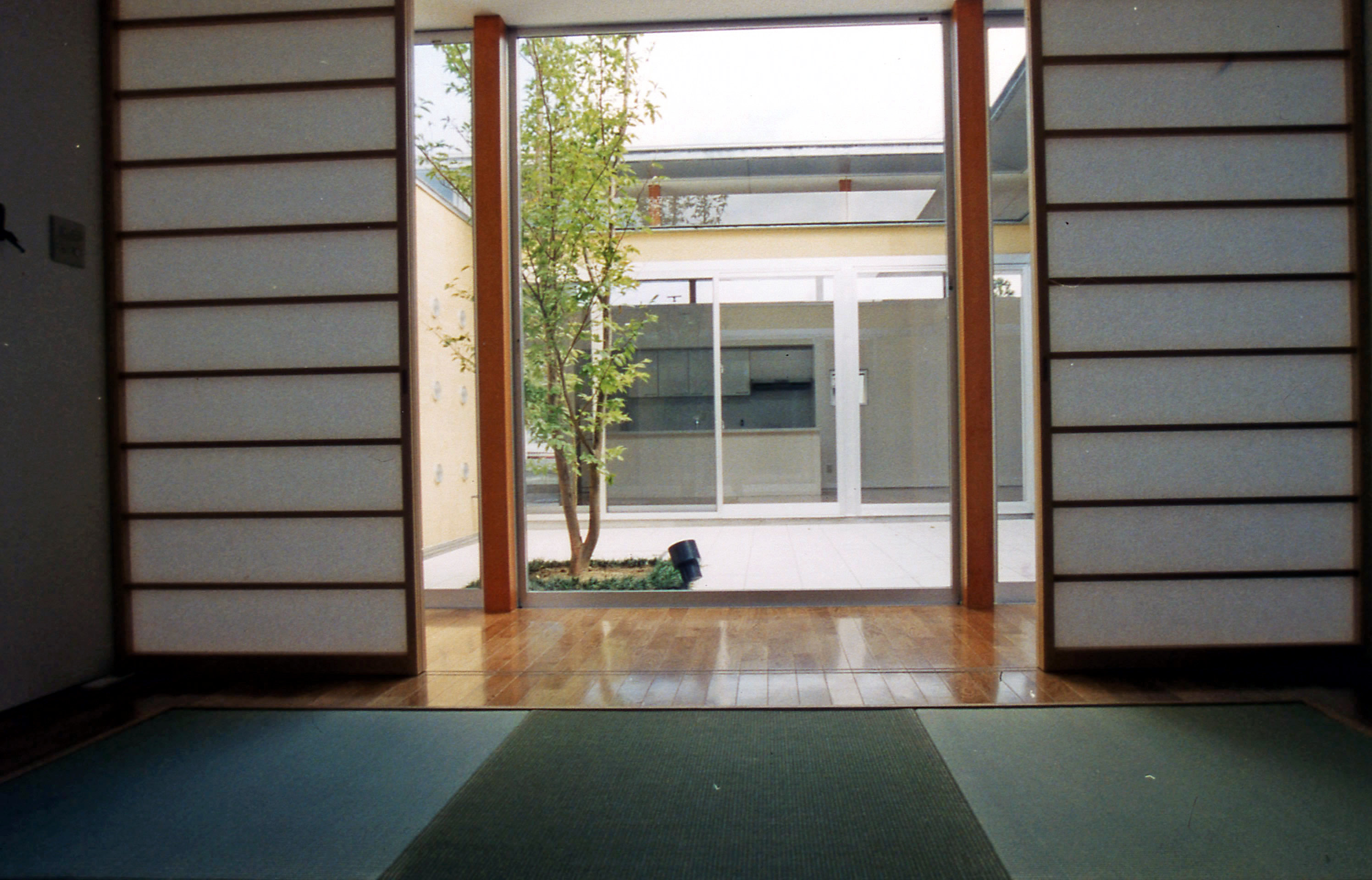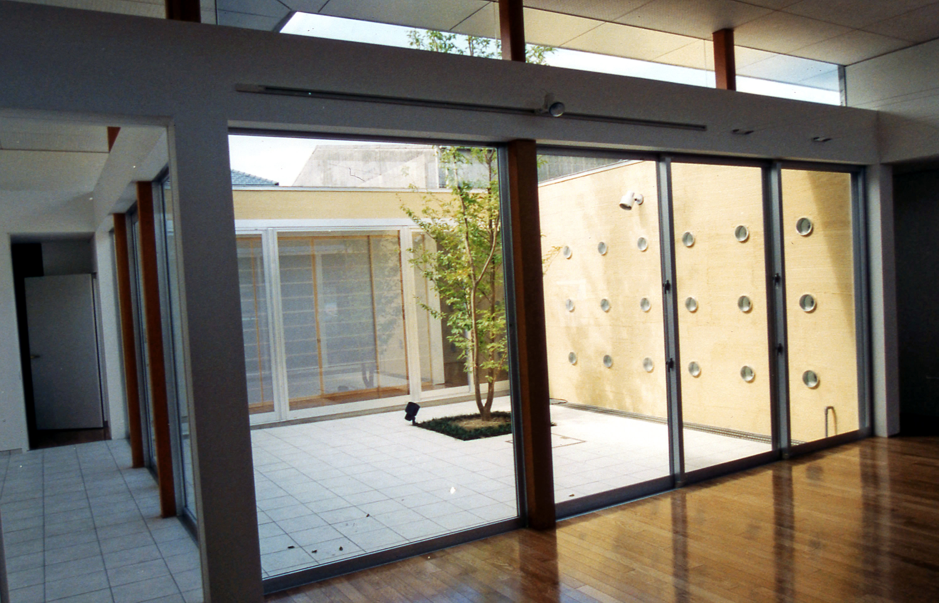 そこで十分な広さの敷地であるが、周りから取り込める借景もなく、隣地に駐車場があることから外部に対して閉じた表情をもつ一方、内部に対して中庭(コート)のあるオープンなスペースをもち、これからの老後を考慮して一つのフロアで生活が送れる平屋建てにしました。
