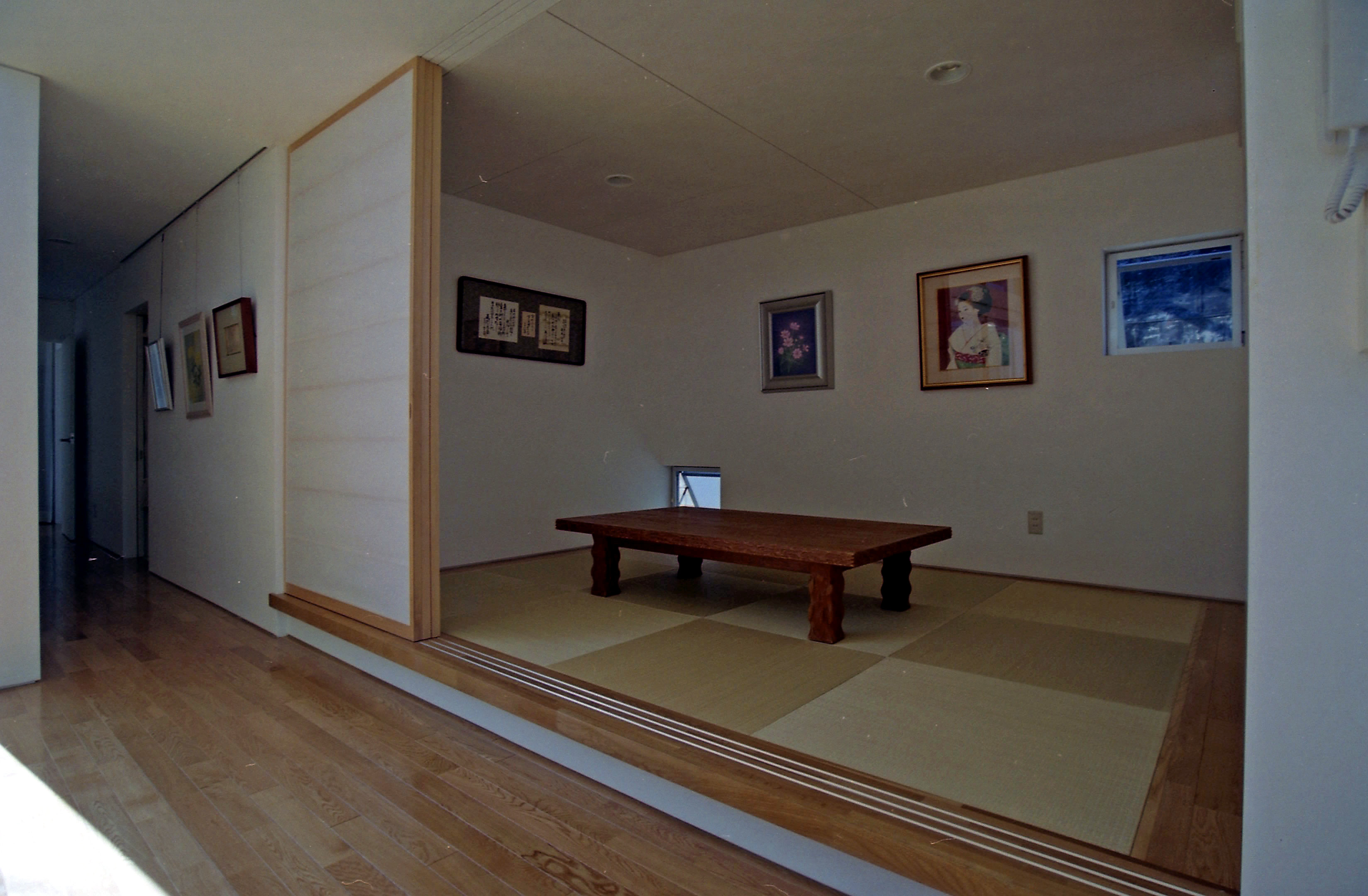 ギャラリーを兼ねた玄関ホールは奥様の趣味であるパッチワークの作品を飾るスペースであると同時に中庭を眺めながらご近所の方などとお茶を楽しむサロンスペースでもあります。
