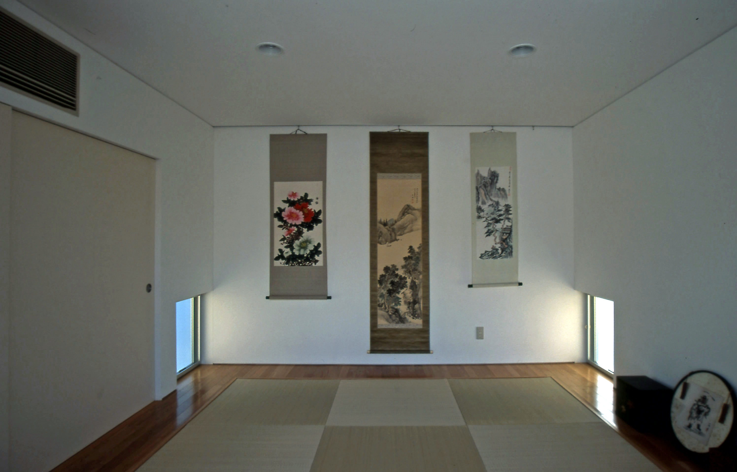 床の白いタイルが玄関ギャラリーホールから中庭へ伸びているため空間に奥行きを感じることができます。