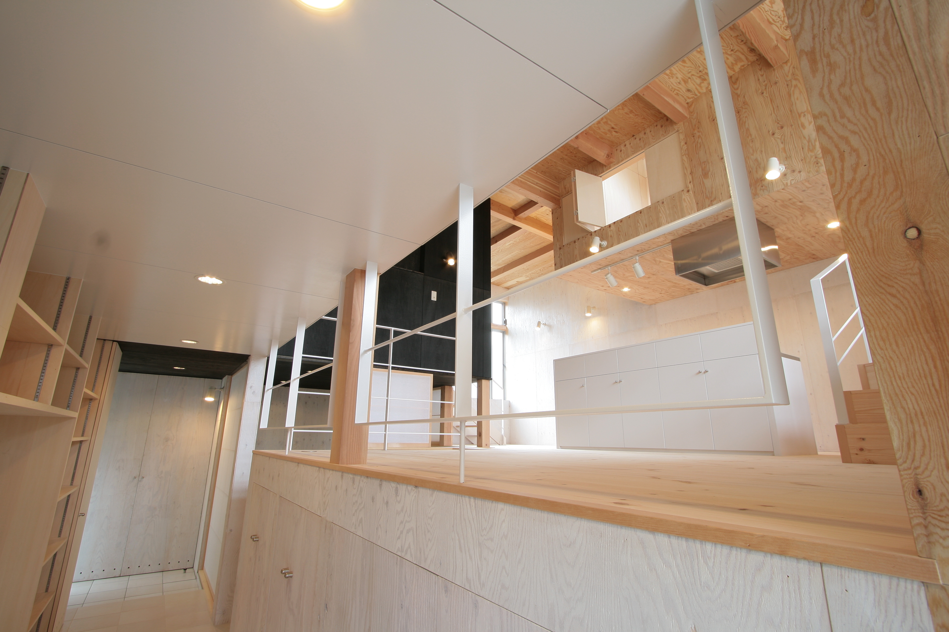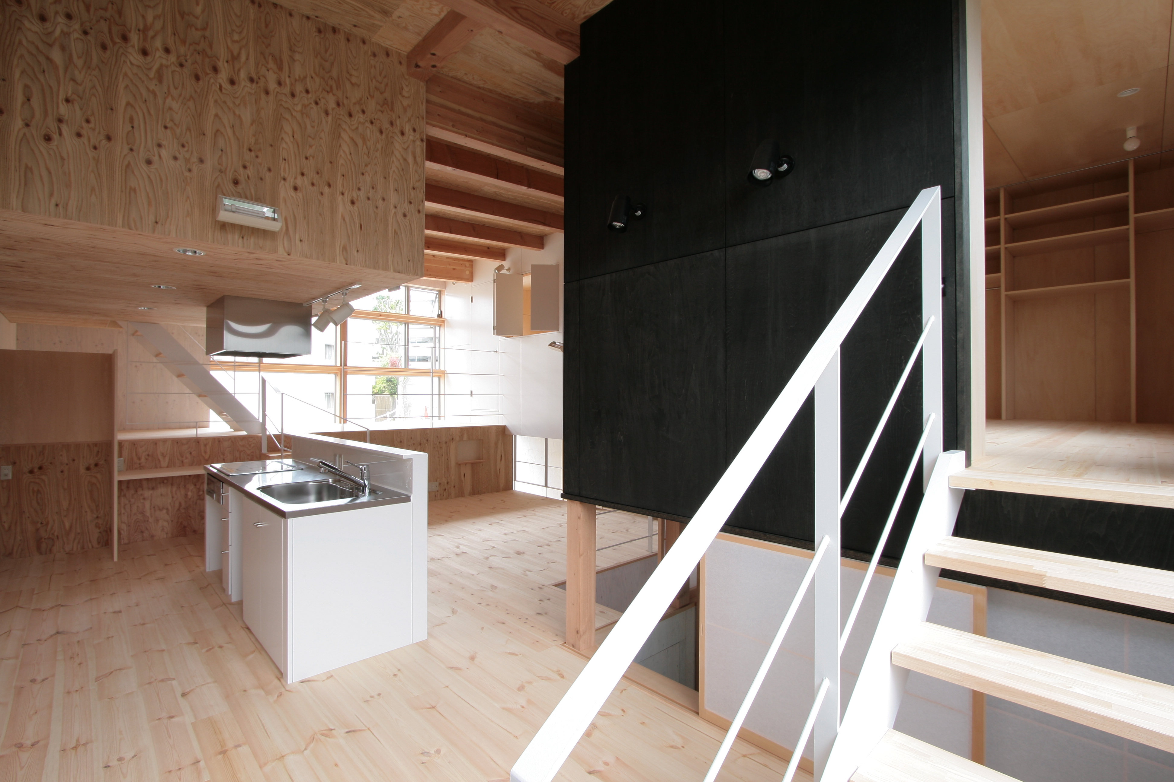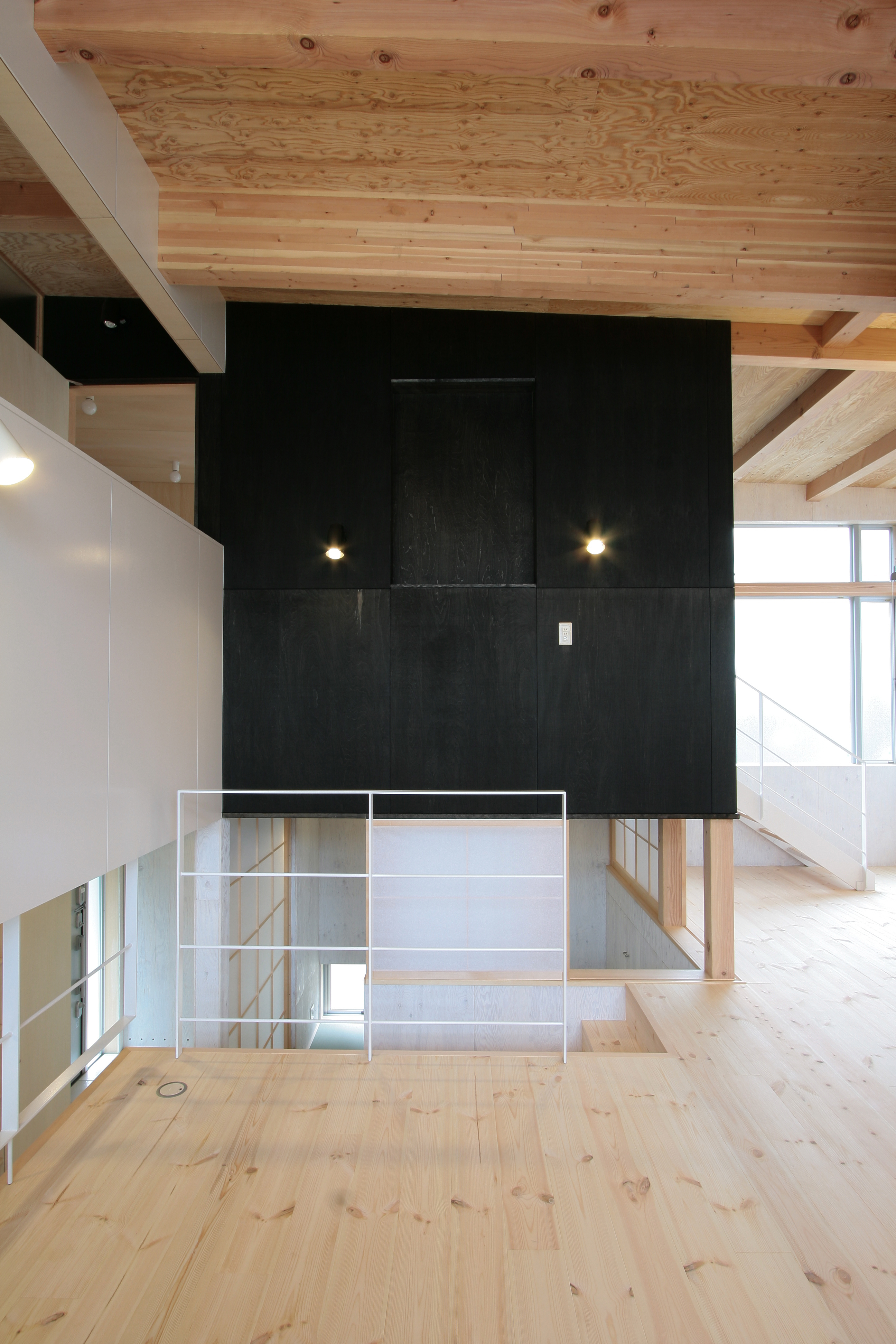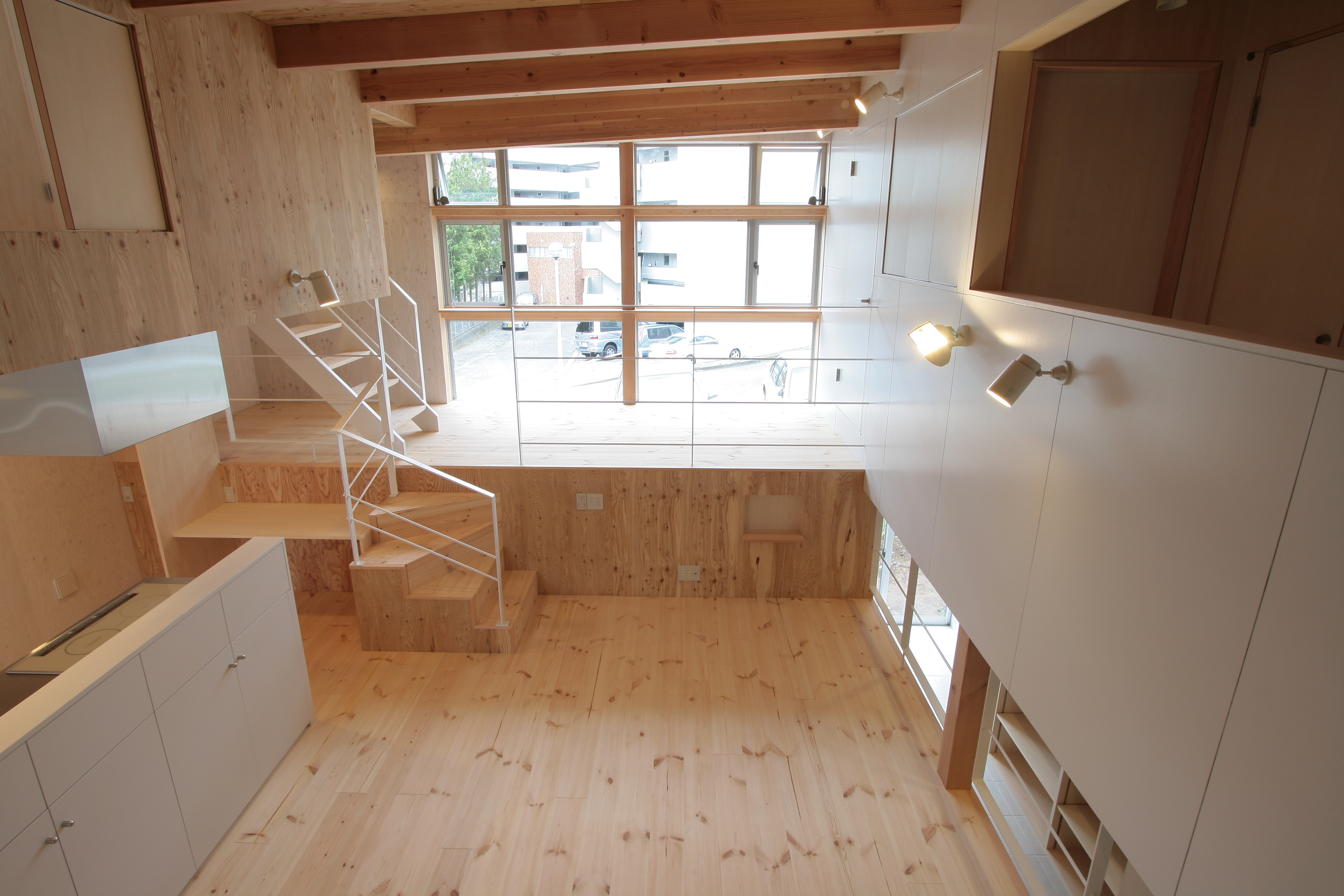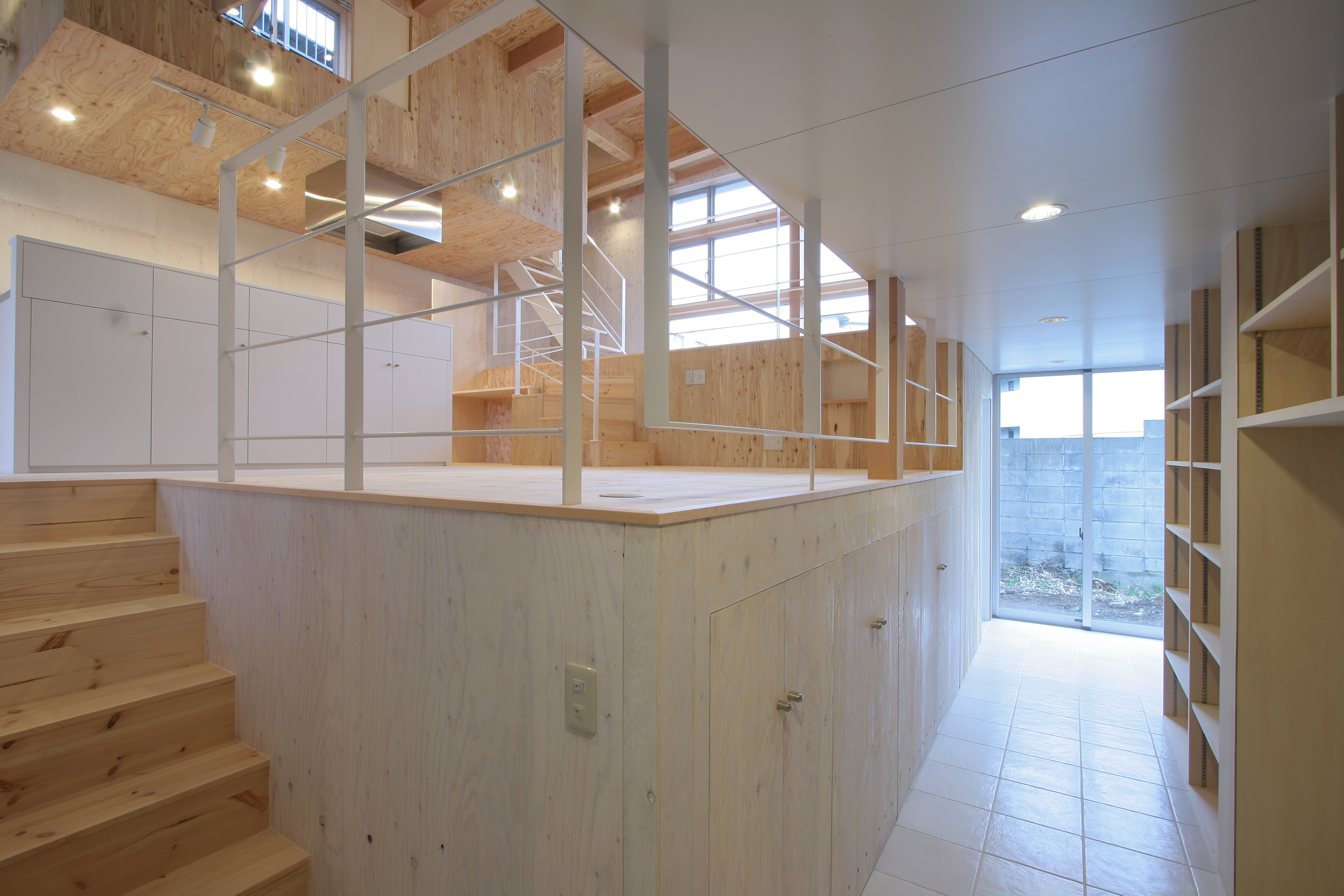 周囲を住宅やマンションに囲まれ、南はマンションの駐車場から見下ろされる敷地条件ではあるものの、ご夫妻の、「開放感があり明るく風の抜ける家」という要望を実現するため、床下収納を大胆に大きく作ってリビングのレベルを半層分持ち上げ、寝室、子供室といったプライバシーを守る個室ボリュームを上部に異なるレベルで立体的に配置し、2層分の高さの中に3層分のスキップフロアを作ることで、隣地より覗かれることなく上に抜ける視線を確保し、南に大きく開くことを可能としたリビングを作っています。