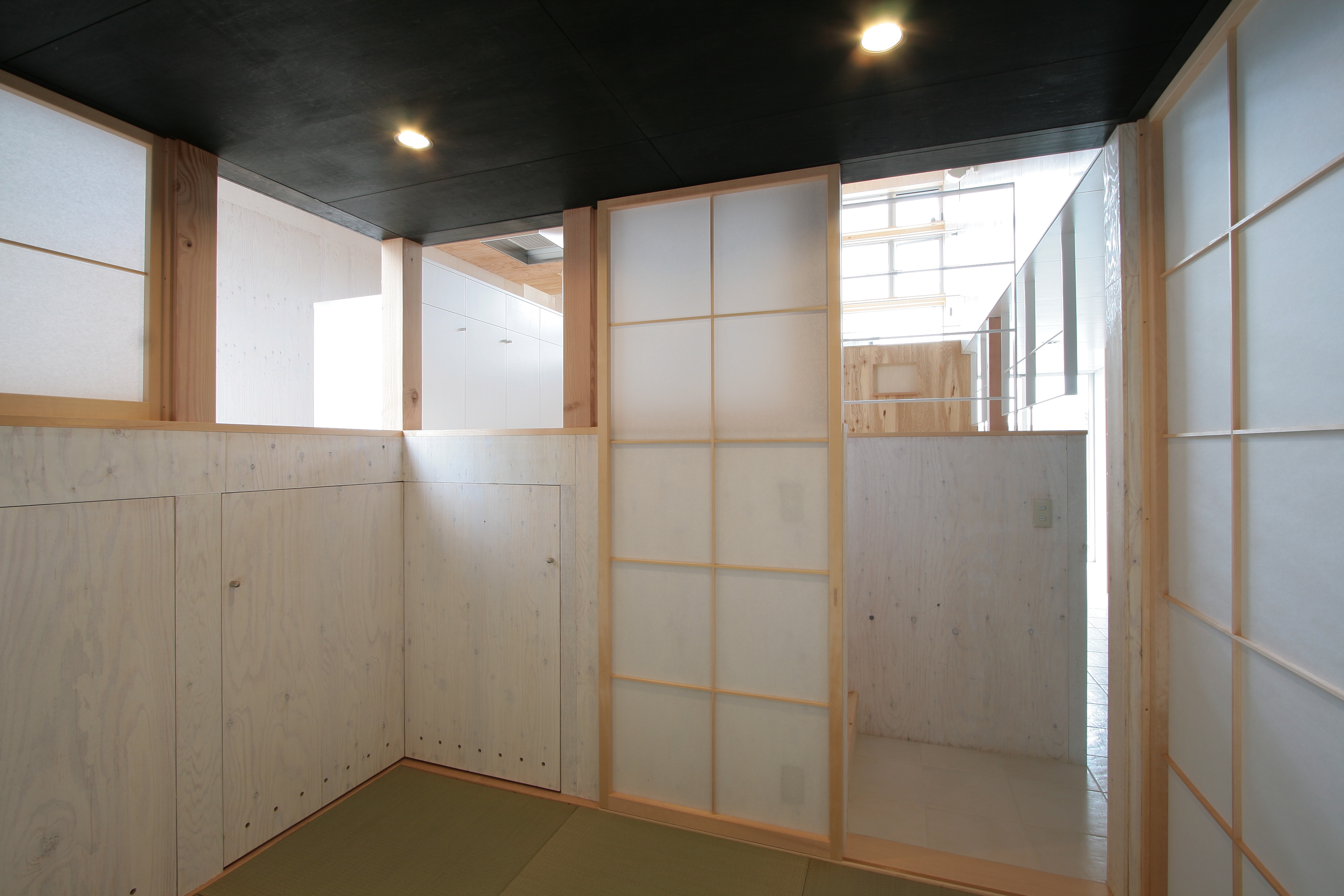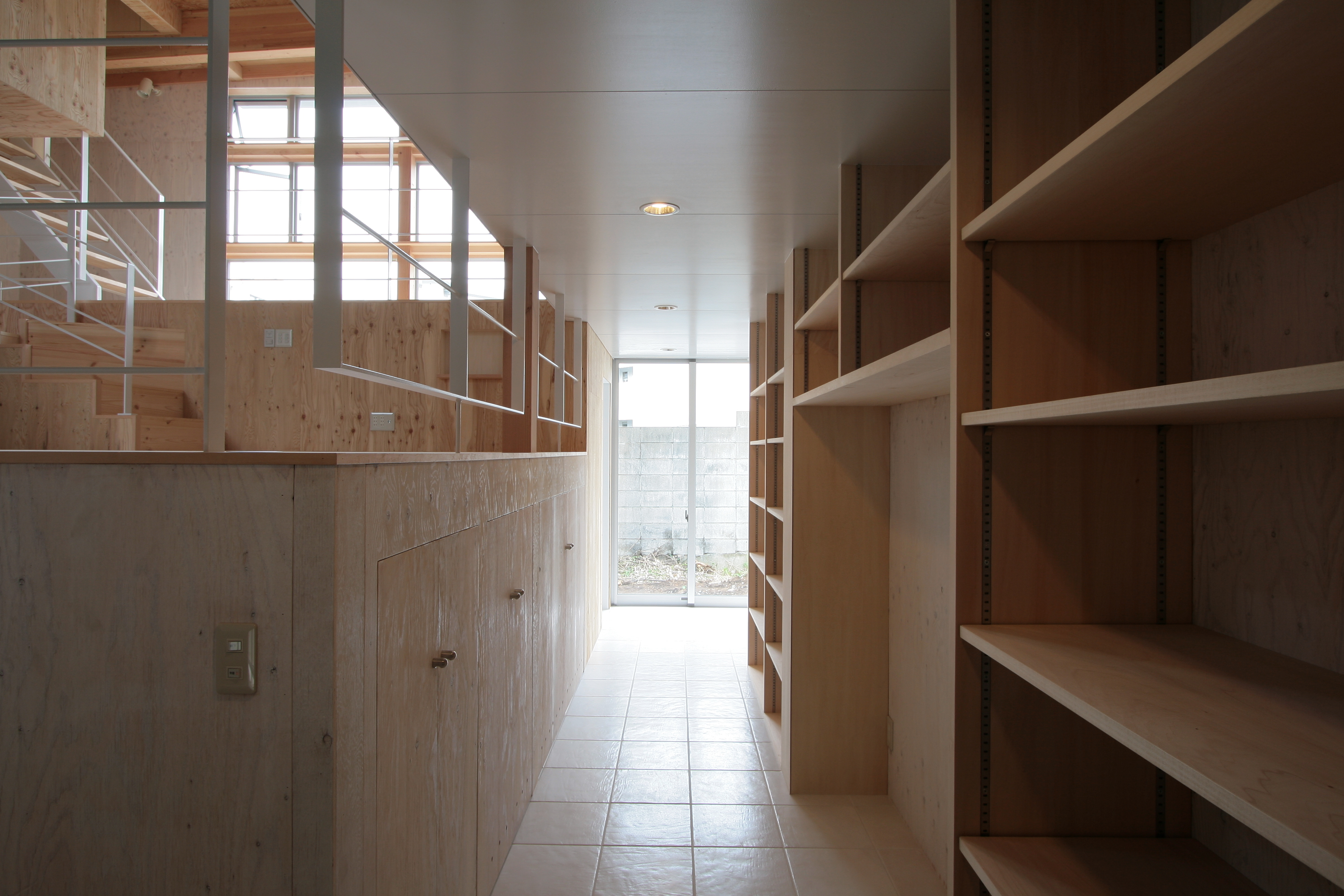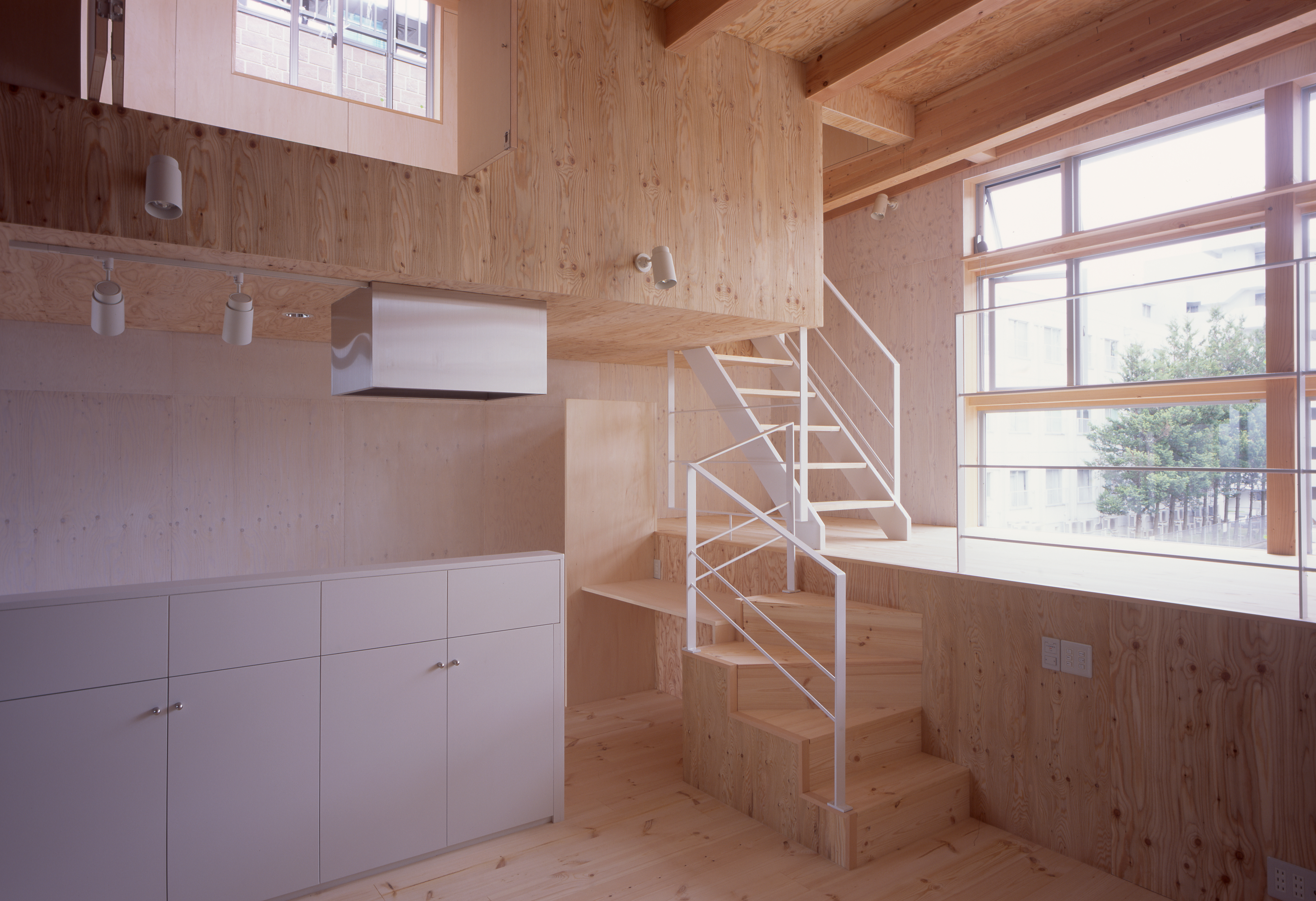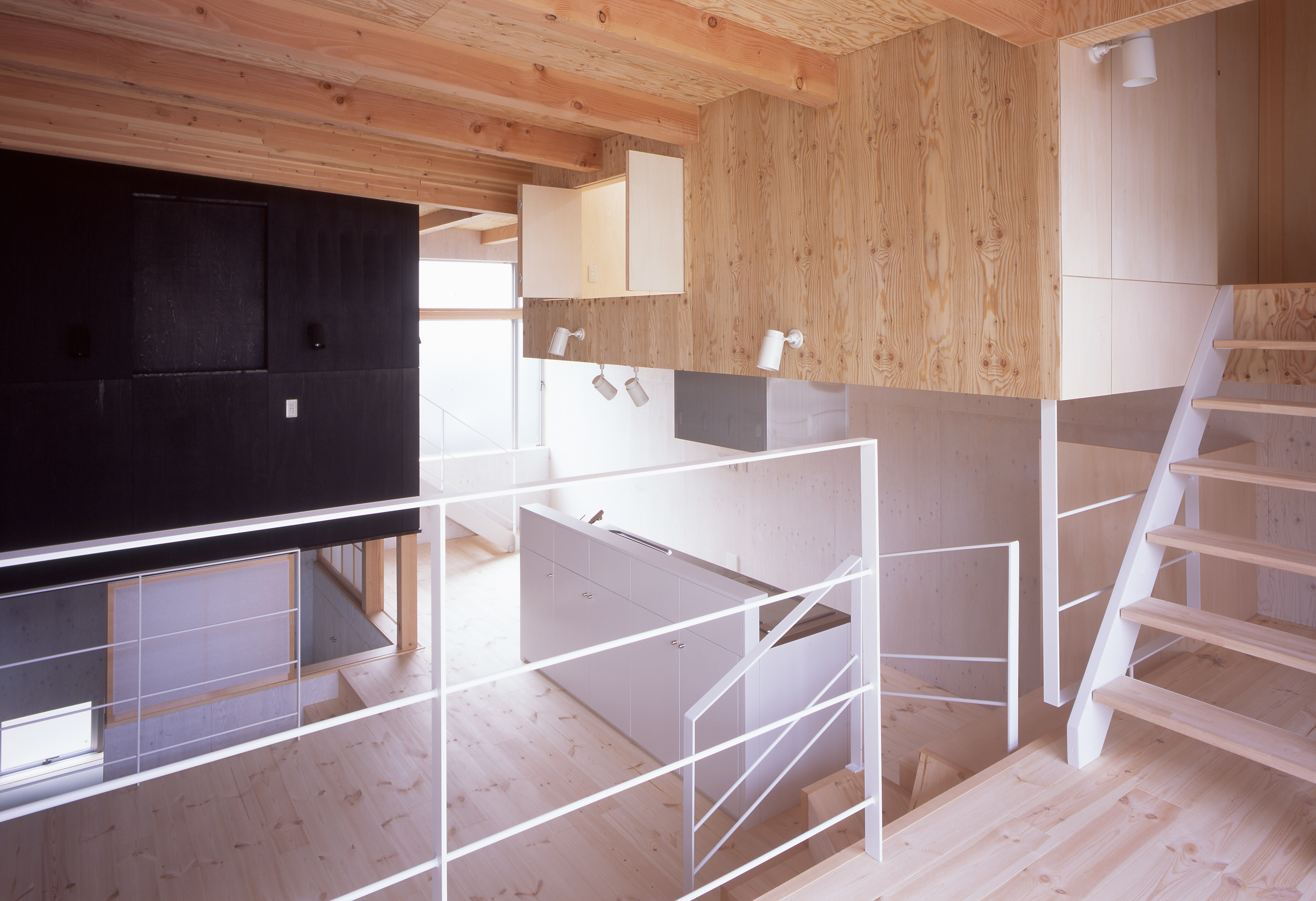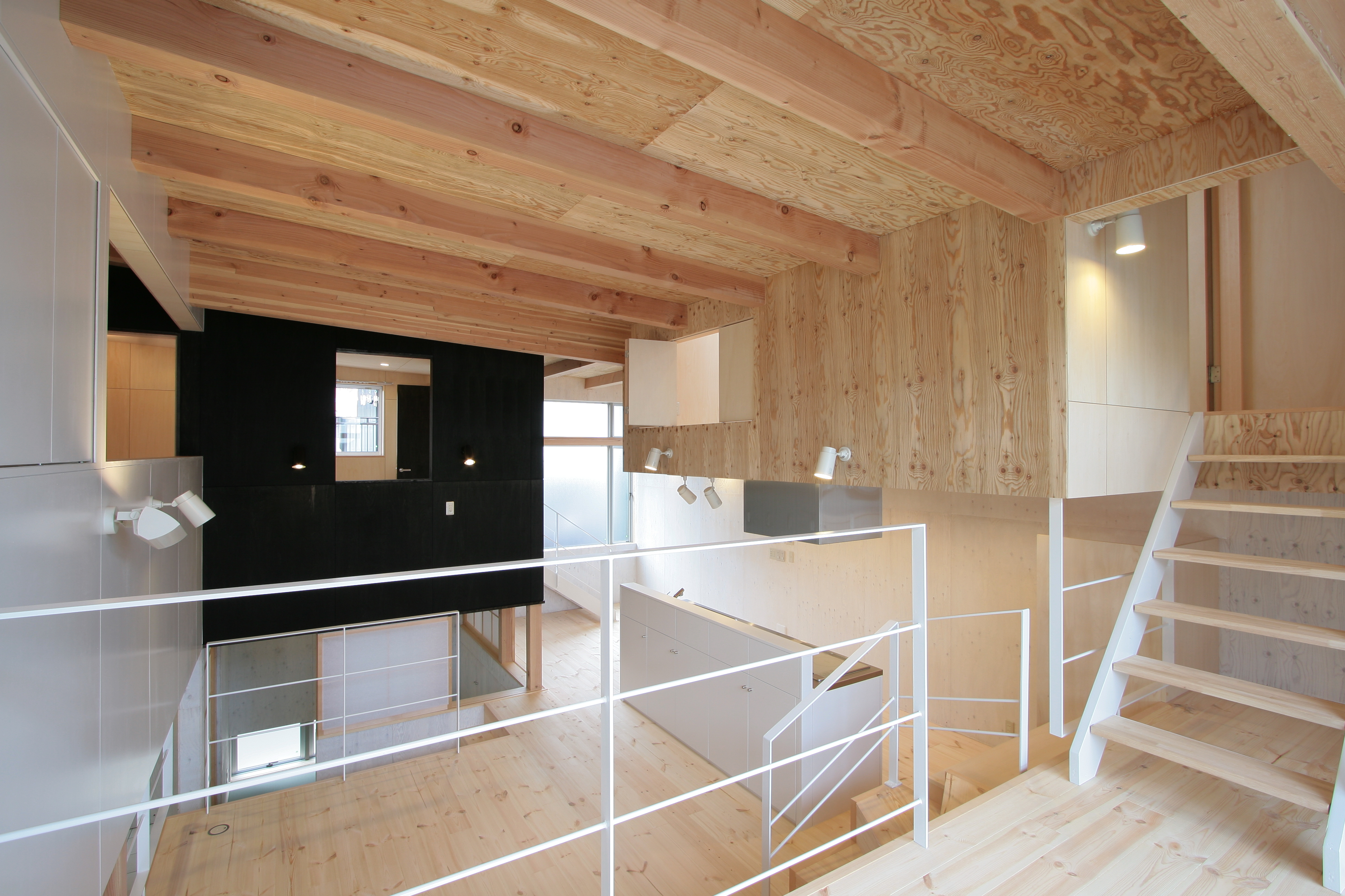 周囲を住宅やマンションに囲まれ、南はマンションの駐車場から見下ろされる敷地条件ではあるものの、ご夫妻の、「開放感があり明るく風の抜ける家」という要望を実現するため、床下収納を大胆に大きく作ってリビングのレベルを半層分持ち上げ、寝室、子供室といったプライバシーを守る個室ボリュームを上部に異なるレベルで立体的に配置し、2層分の高さの中に3層分のスキップフロアを作ることで、隣地より覗かれることなく上に抜ける視線を確保し、南に大きく開くことを可能としたリビングを作っています。
