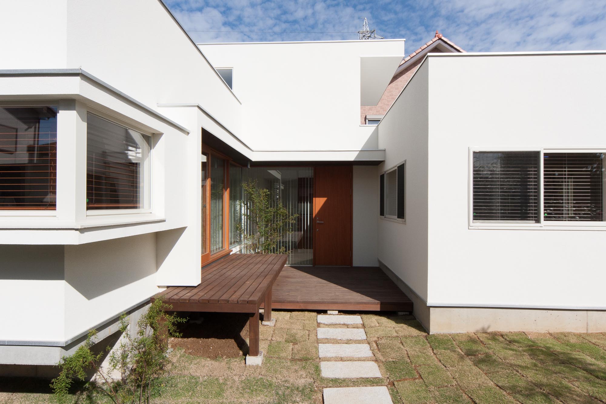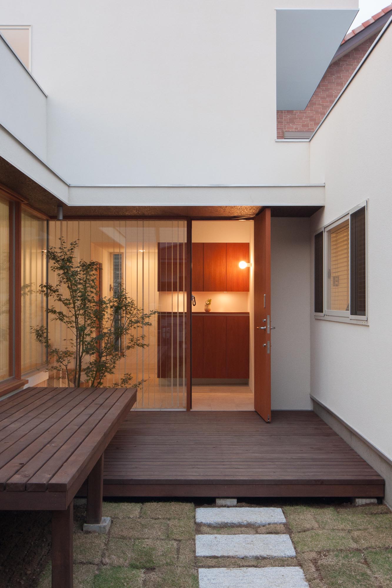 機能的には、ほぼ平屋と言ってよい構成のこの住宅は、各部屋が中庭を中心に玄関ホールでつながっている。