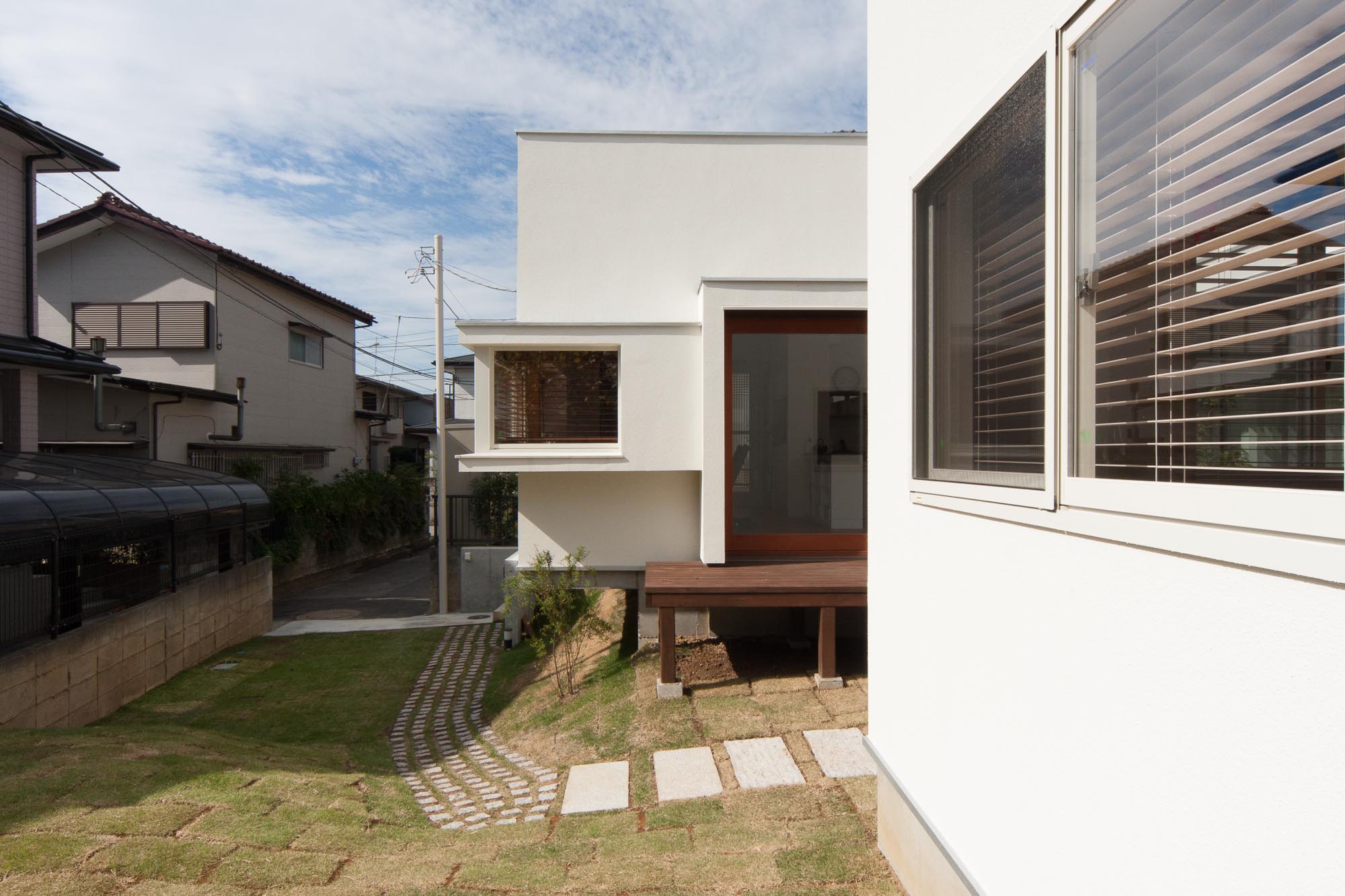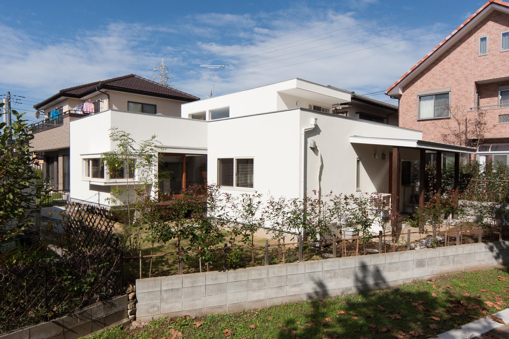 住宅街の路地を入った突き当たりに立地し、敷地の東側は学校の裏庭で敷地外からの視線を気にせず外部空間を室内に取り込むことが可能な敷地。