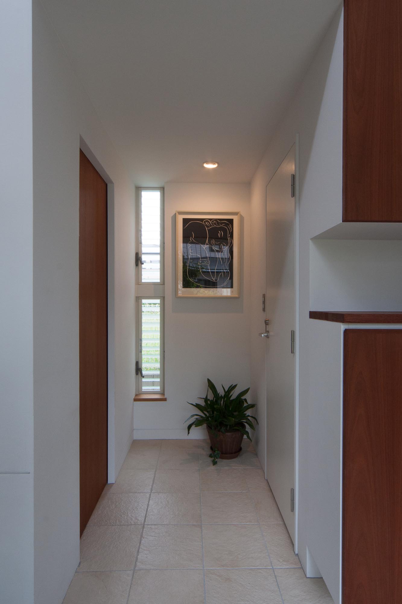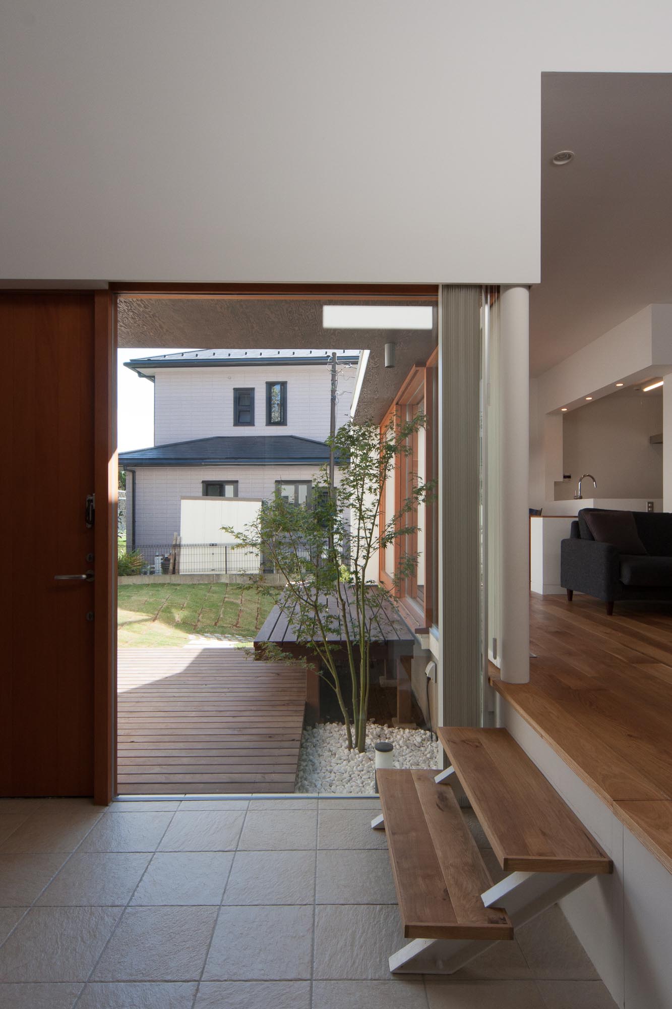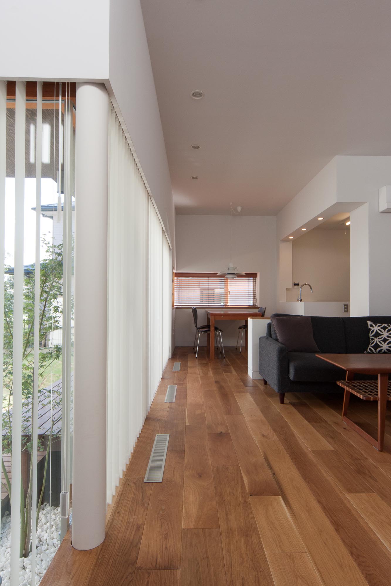 玄関からリビングにかけての玄関ドア・コーナーFIX・引込み戸は全て木製の造り付けで仕上げ、既製品のサッシでは出来ないシンプルな納まりになっている。