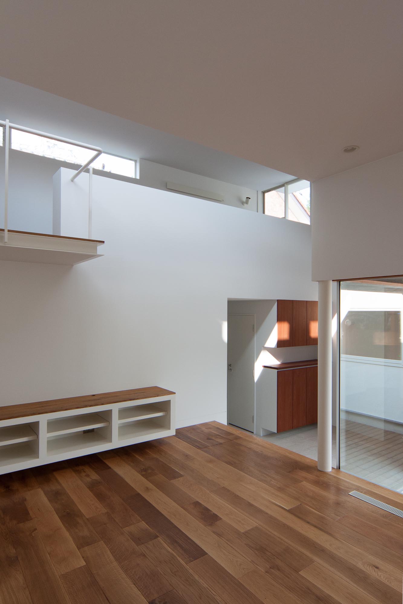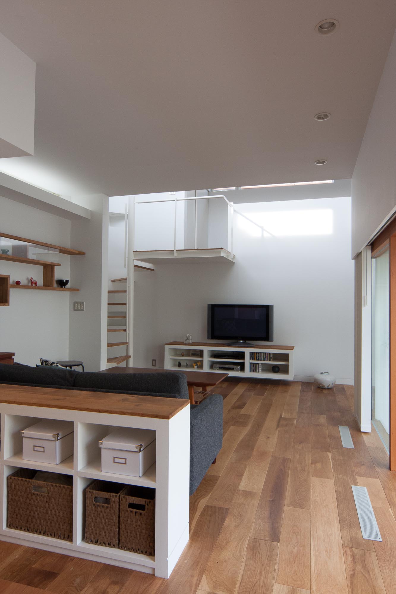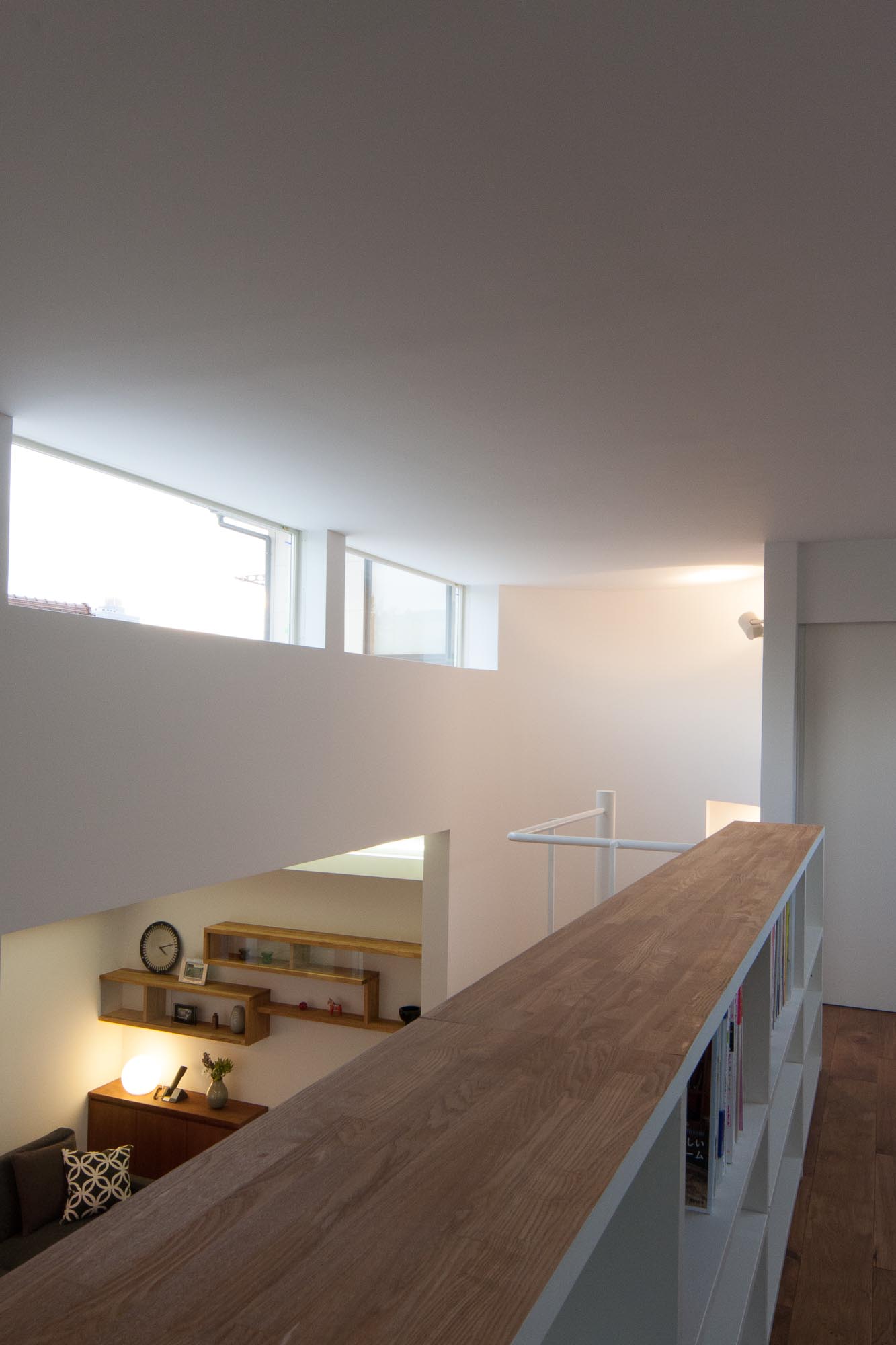 ロフト空間は、LDKとのレベル差を2m最小に抑え一体感をだしつつも手摺はあえて壁としプライベート性も確保している。