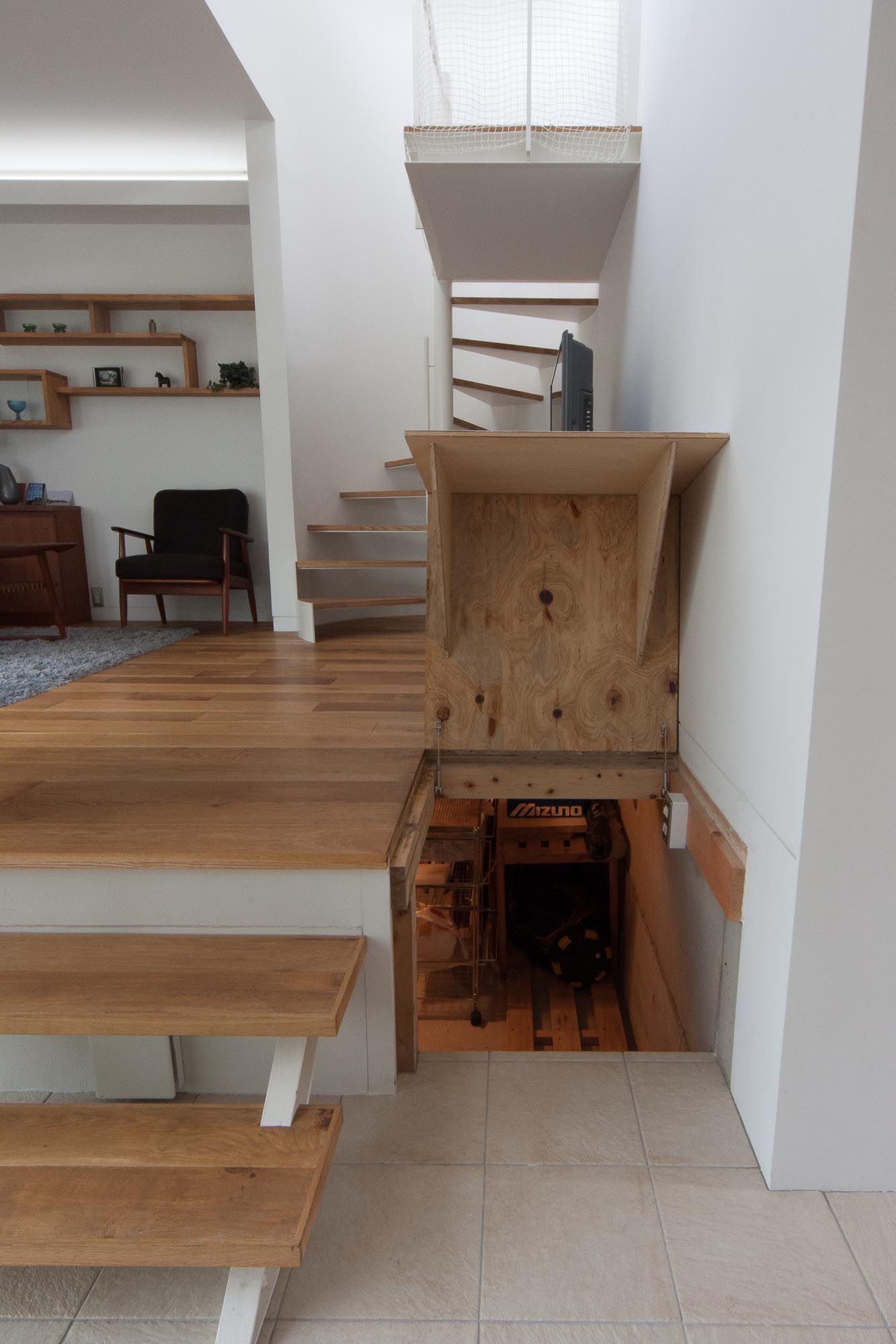 玄関ホールとリビングの段差より半地下の床下収納へアプローチ出来る。