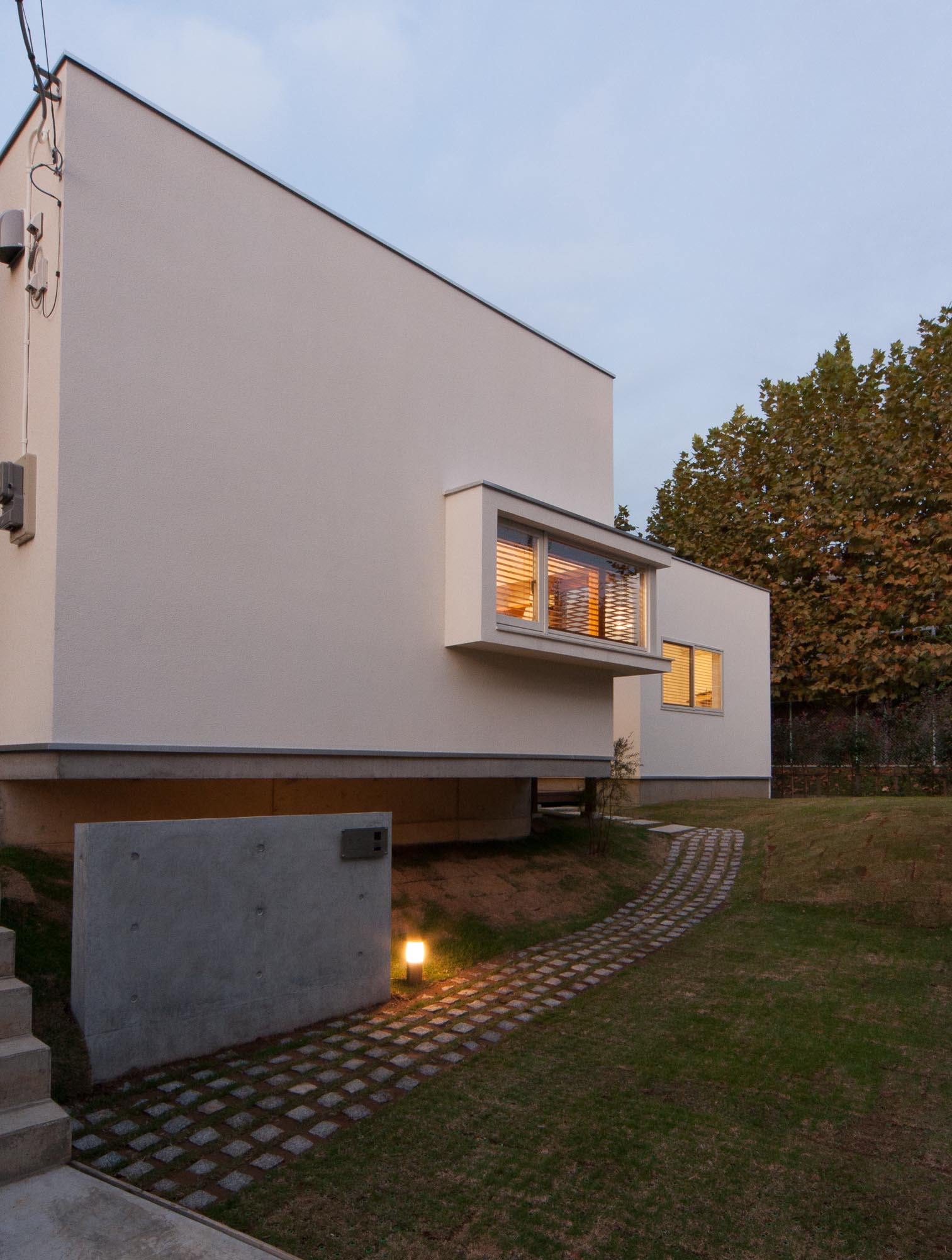 緩やかな傾斜がある芝の庭からアプローチする住宅。
