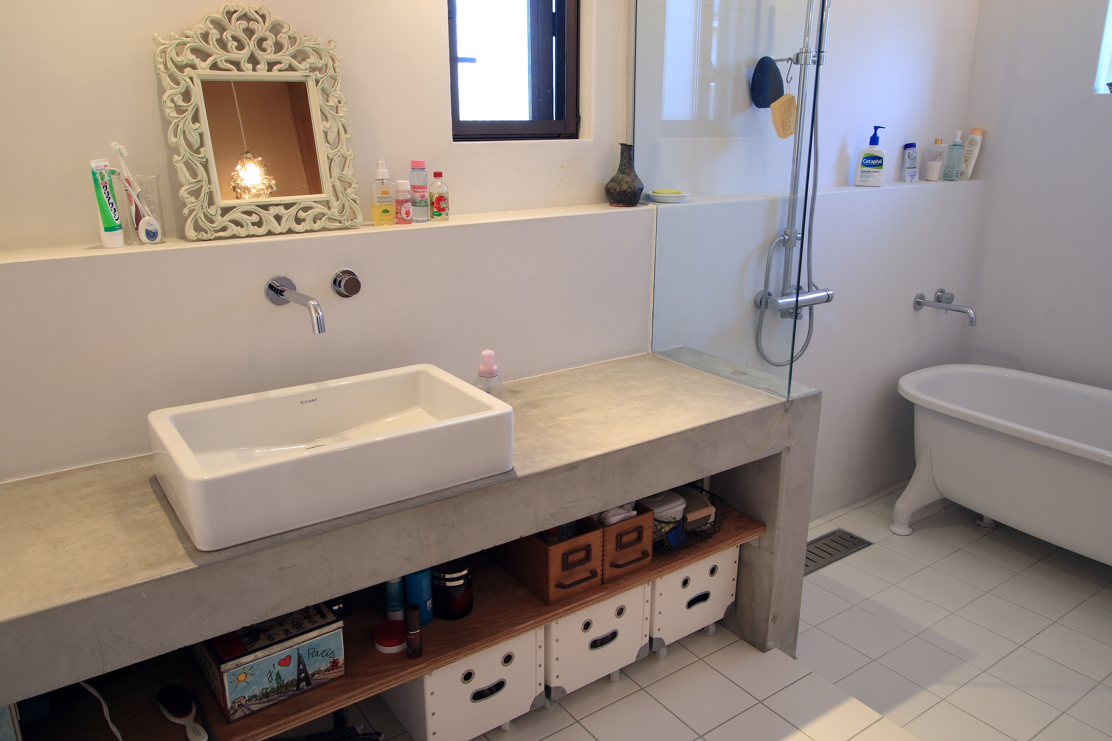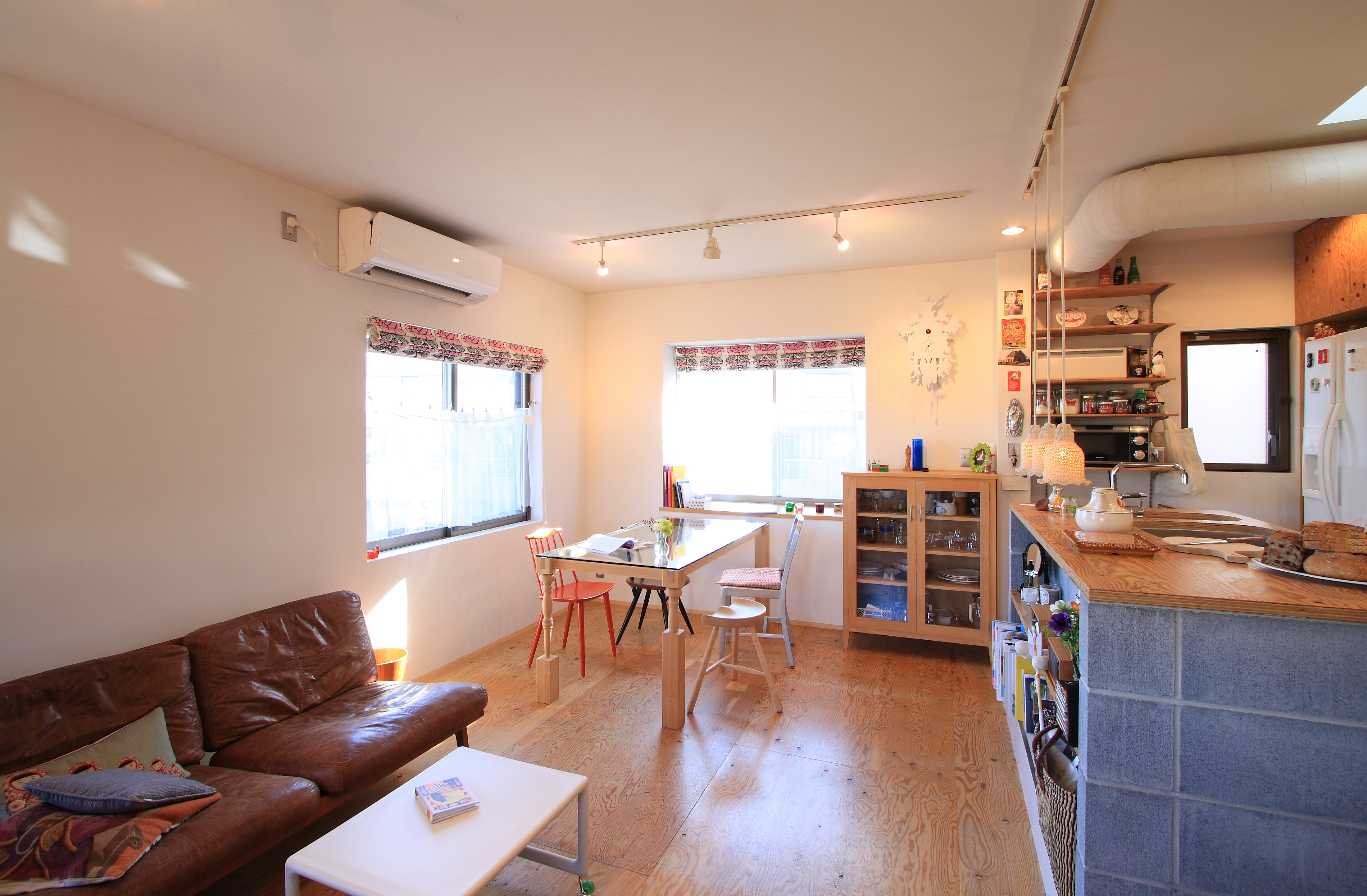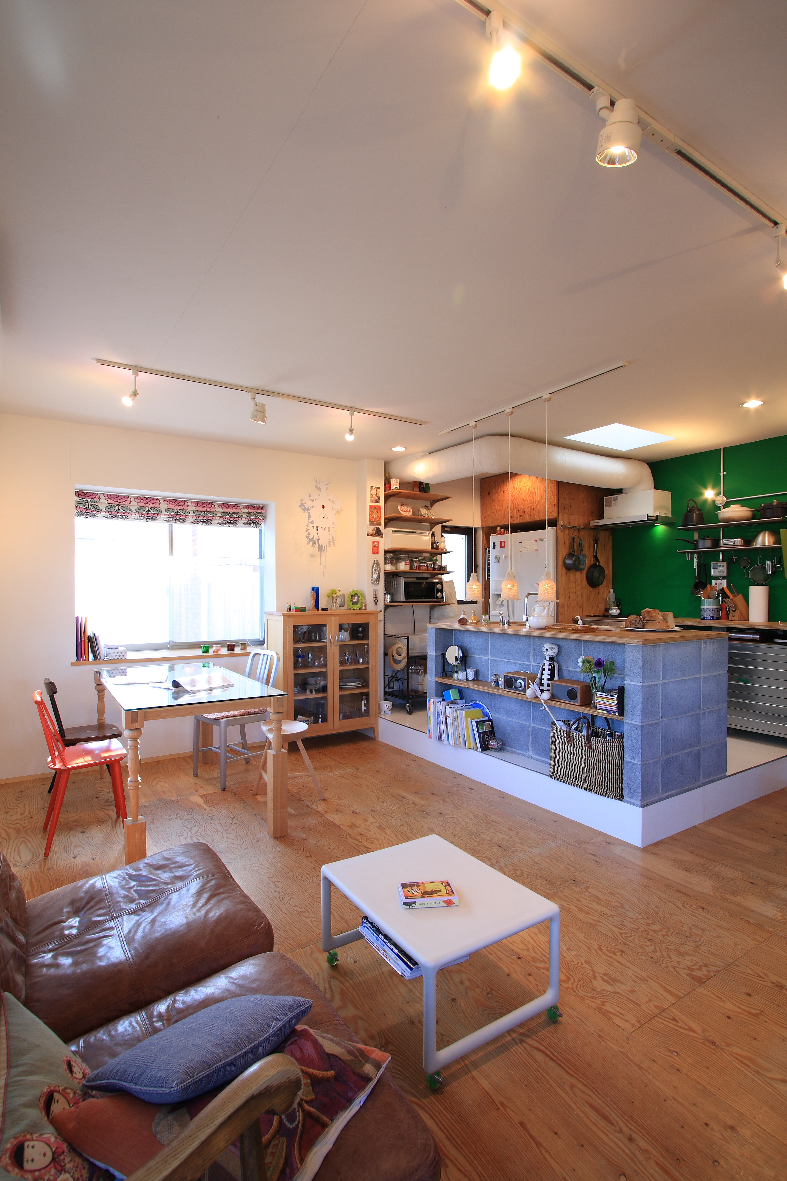 3層に分かれた住まいを階ごとに用途を決め、地下1階はプライベートな寝室とクローゼット、1階は水廻りと犬のためのフロア、2階はLDKとして、各階ともモルタルと合板を組み合わせた作りに必要な設備だけをシンプルに制作し、ご夫妻のこだわりのモノや色を加えることで、外からは想像できない、パリのアパートメントの空気感を実現した住まいとなっています。