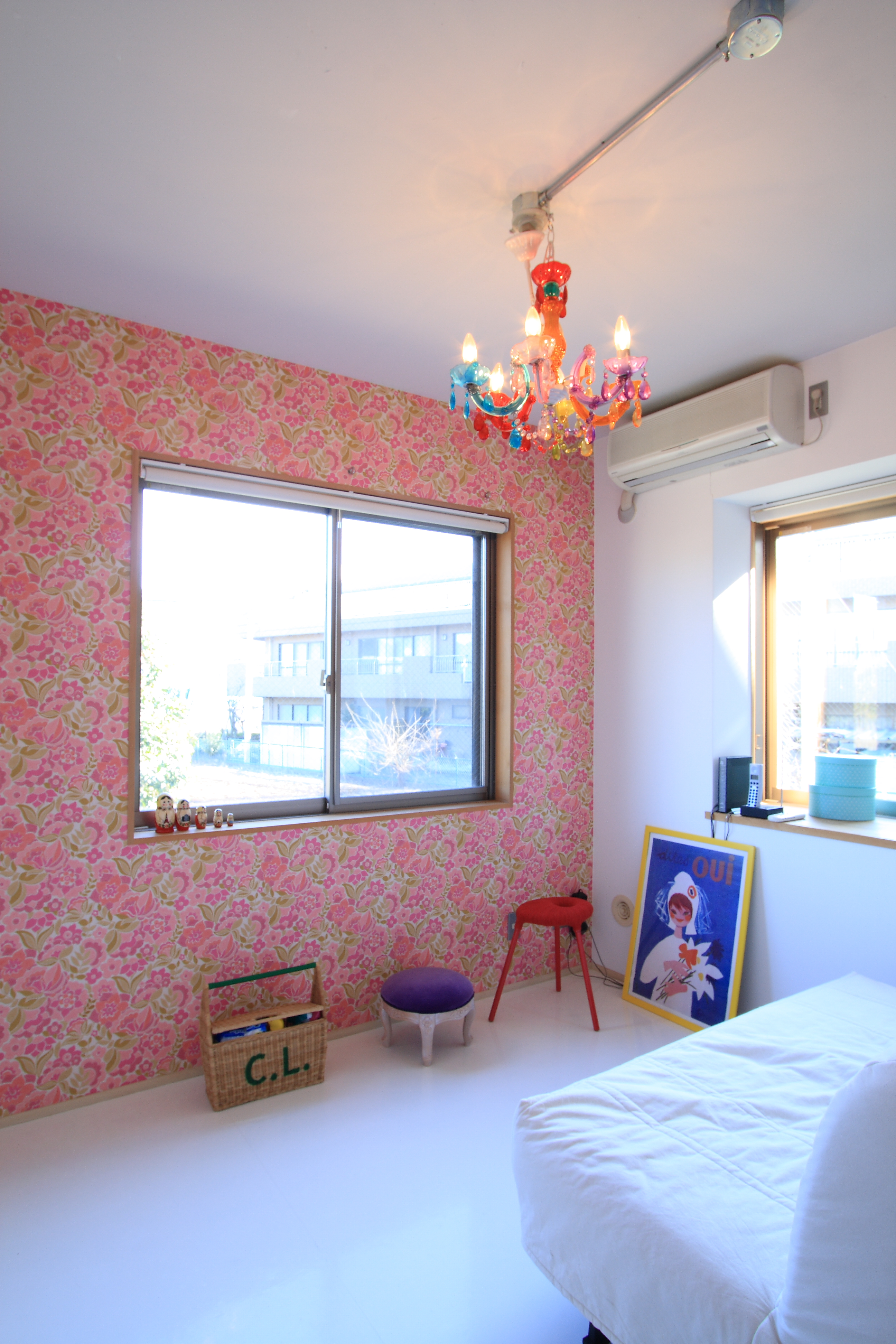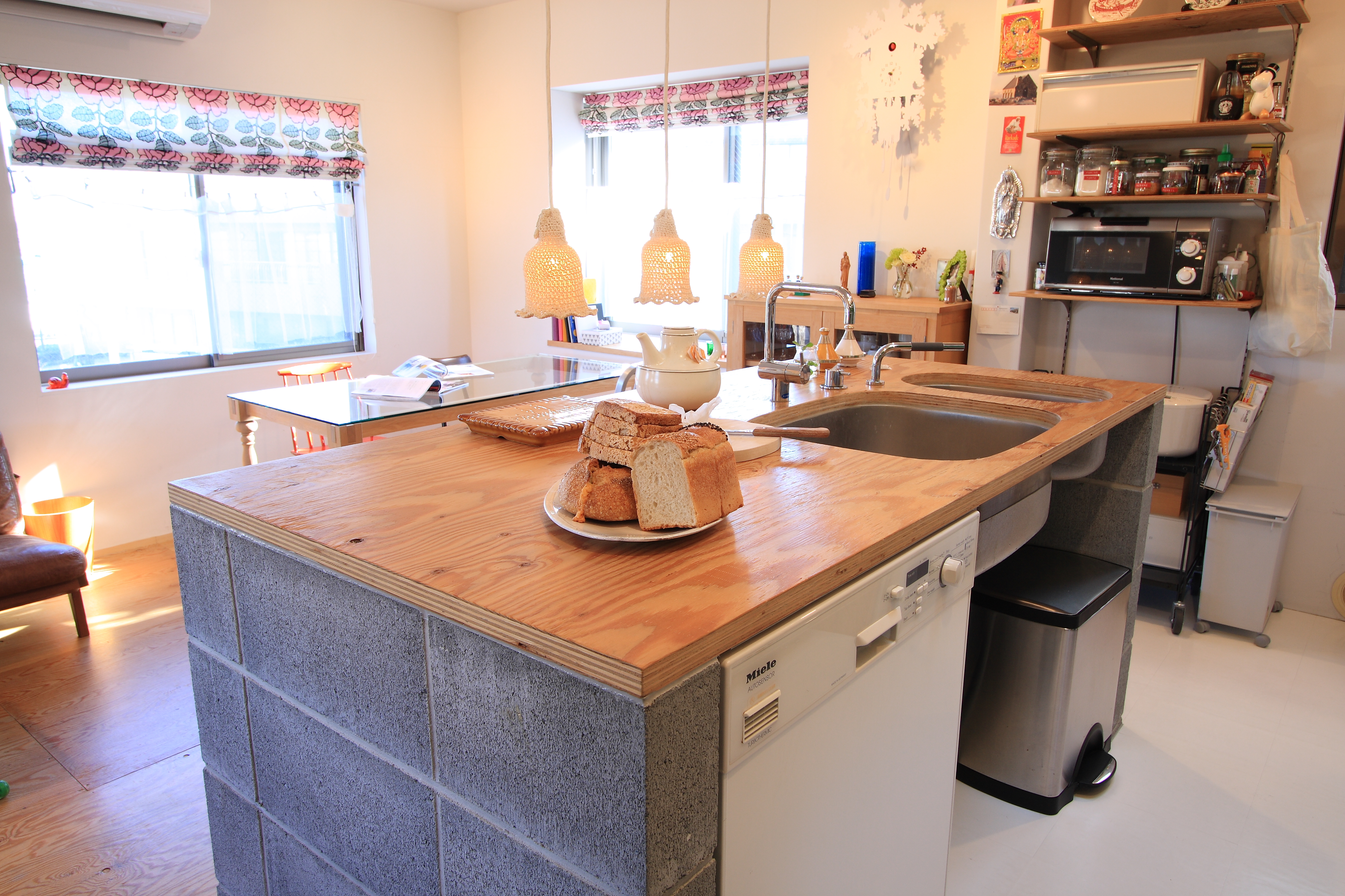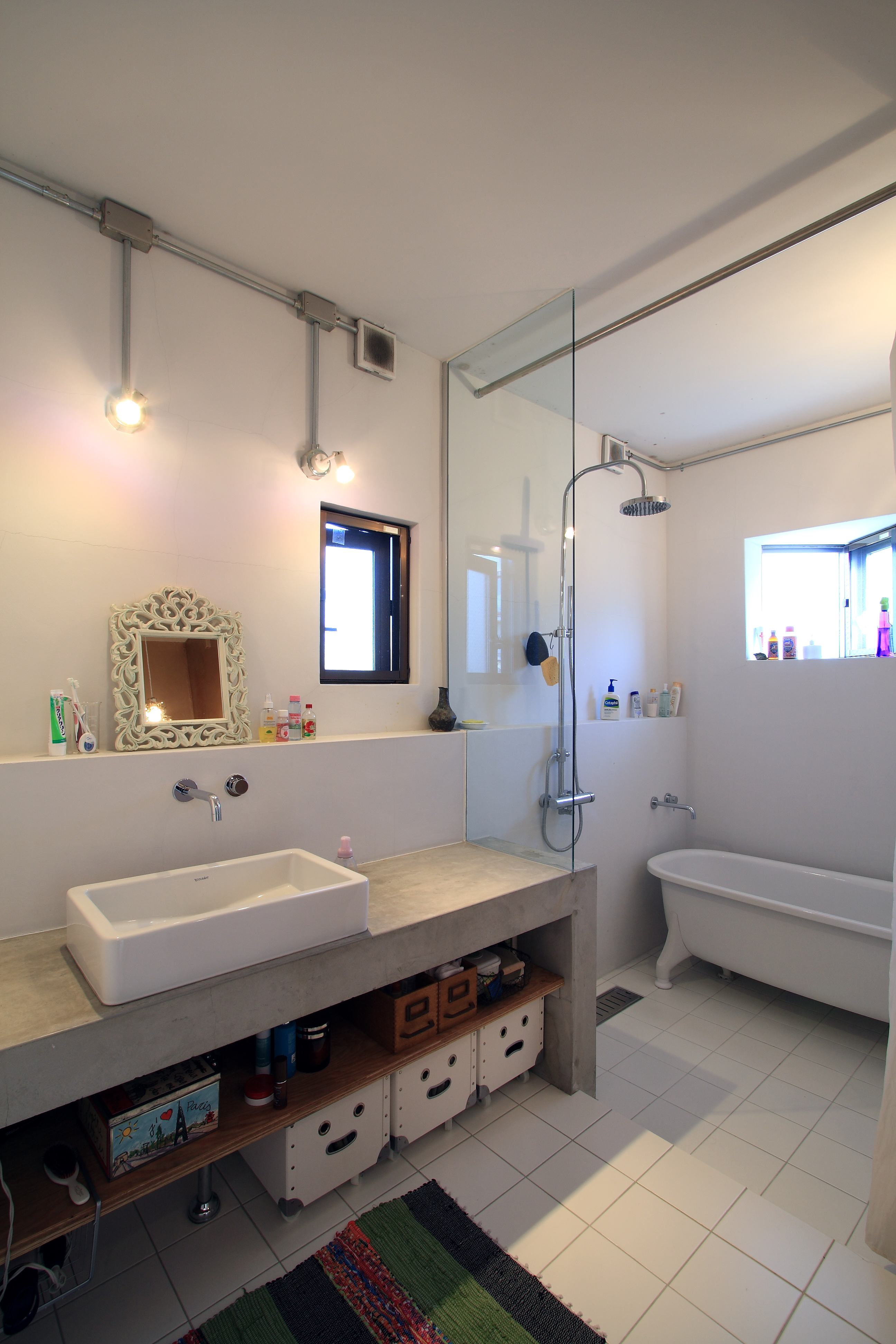 3層に分かれた住まいを階ごとに用途を決め、地下1階はプライベートな寝室とクローゼット、1階は水廻りと犬のためのフロア、2階はLDKとして、各階ともモルタルと合板を組み合わせた作りに必要な設備だけをシンプルに制作し、ご夫妻のこだわりのモノや色を加えることで、外からは想像できない、パリのアパートメントの空気感を実現した住まいとなっています。