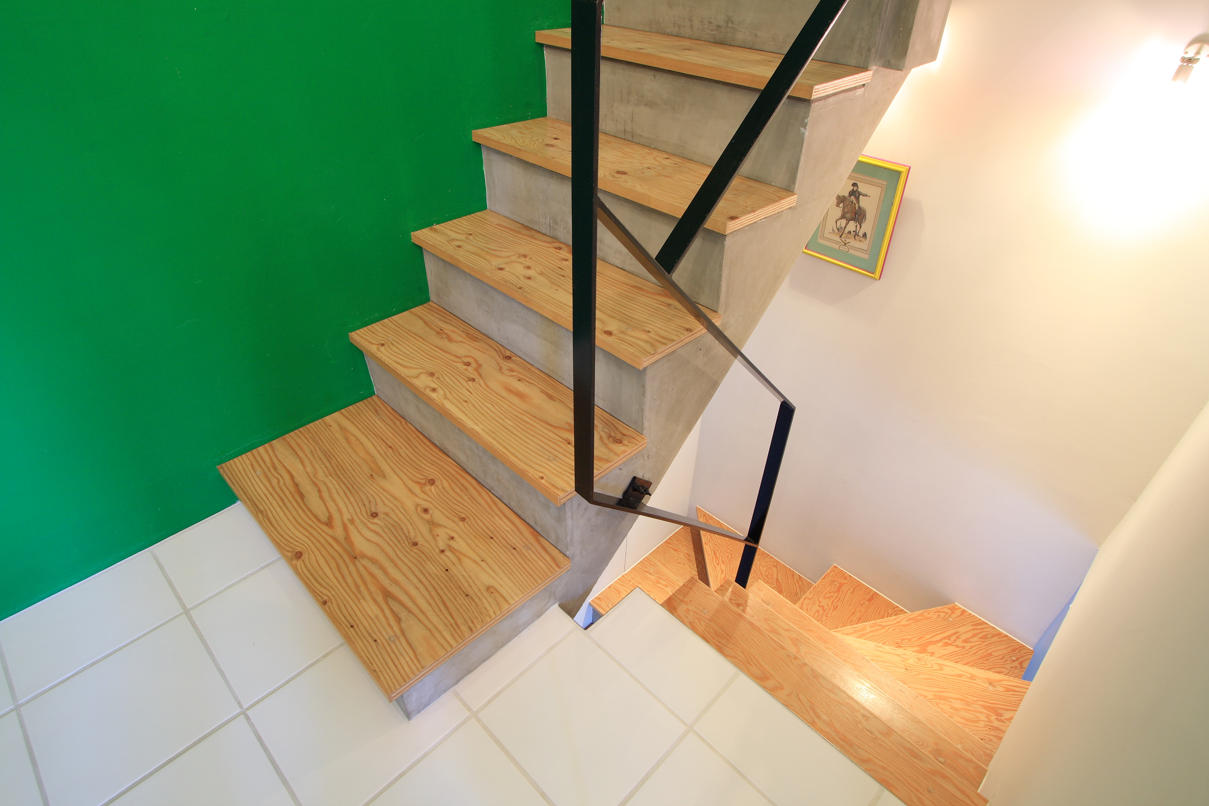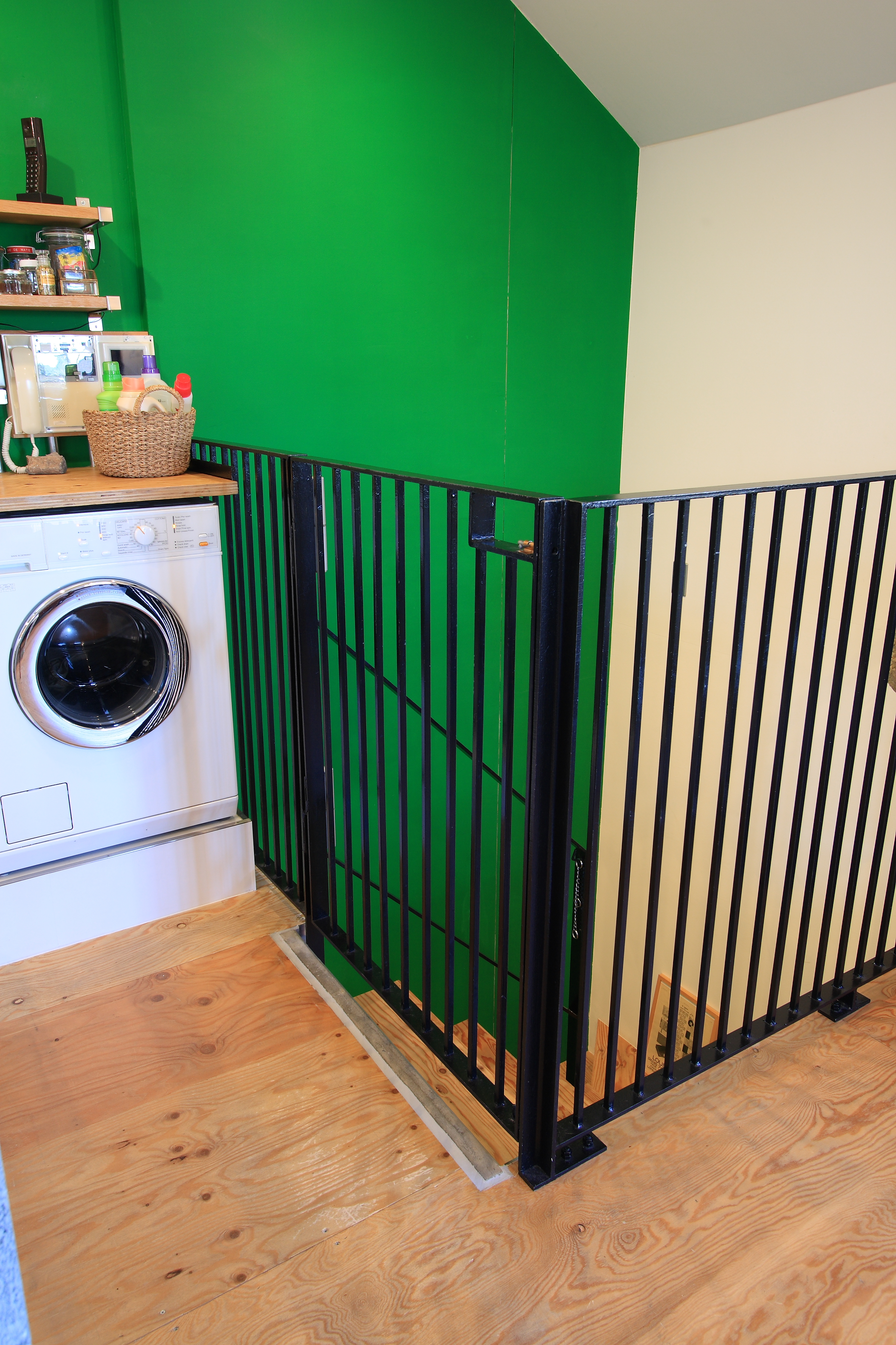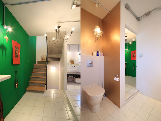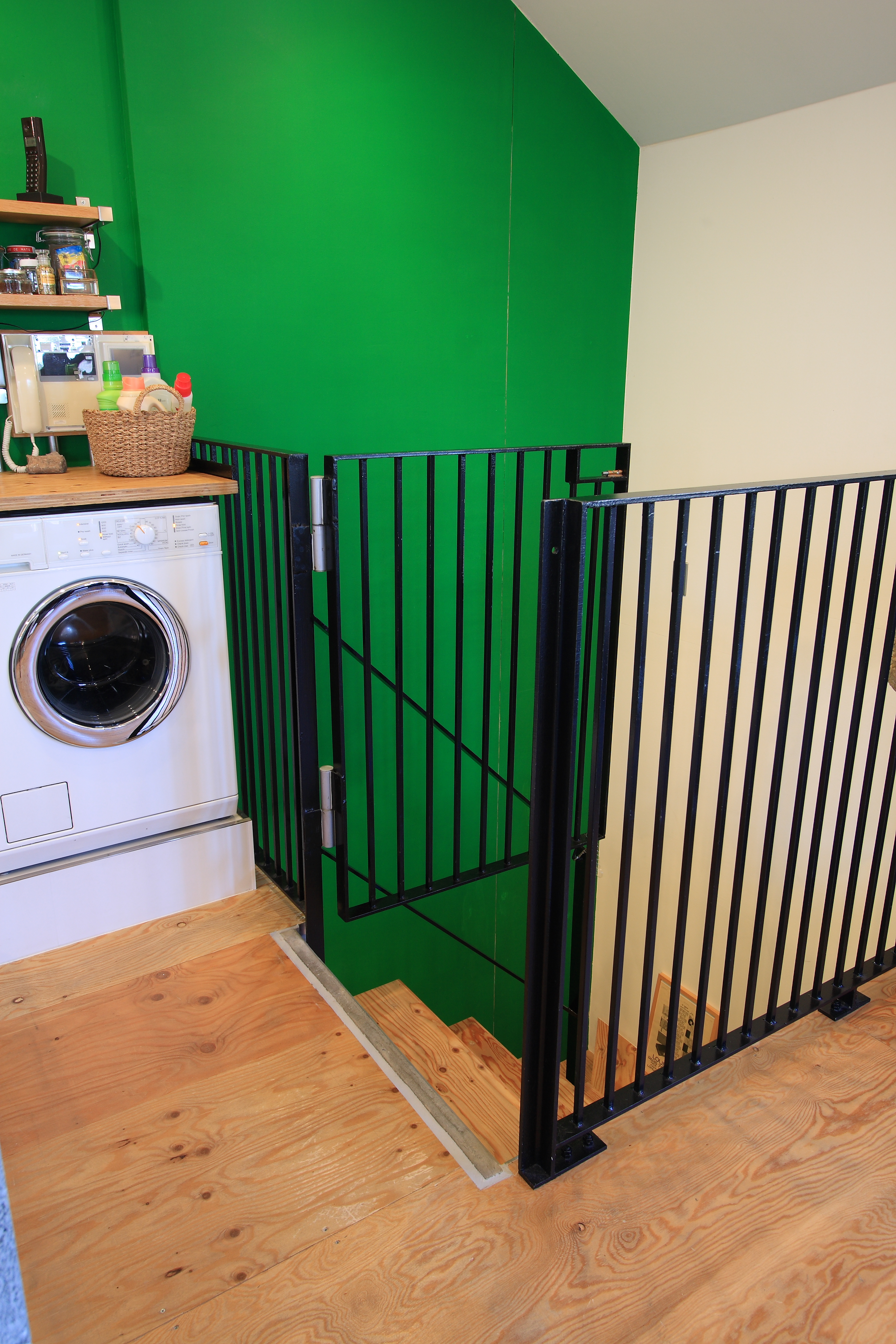 各階に繋がるグリーンの壁と水廻りのアクセントとなっているゴールドの壁は、施主こだわりの色を自ら塗装し、犬の留守番のためのエリアや落下防止を兼ねて閉じることもできる手すりなど、いろんなところに犬も人も安心して暮らせる工夫を盛り込んでいます。