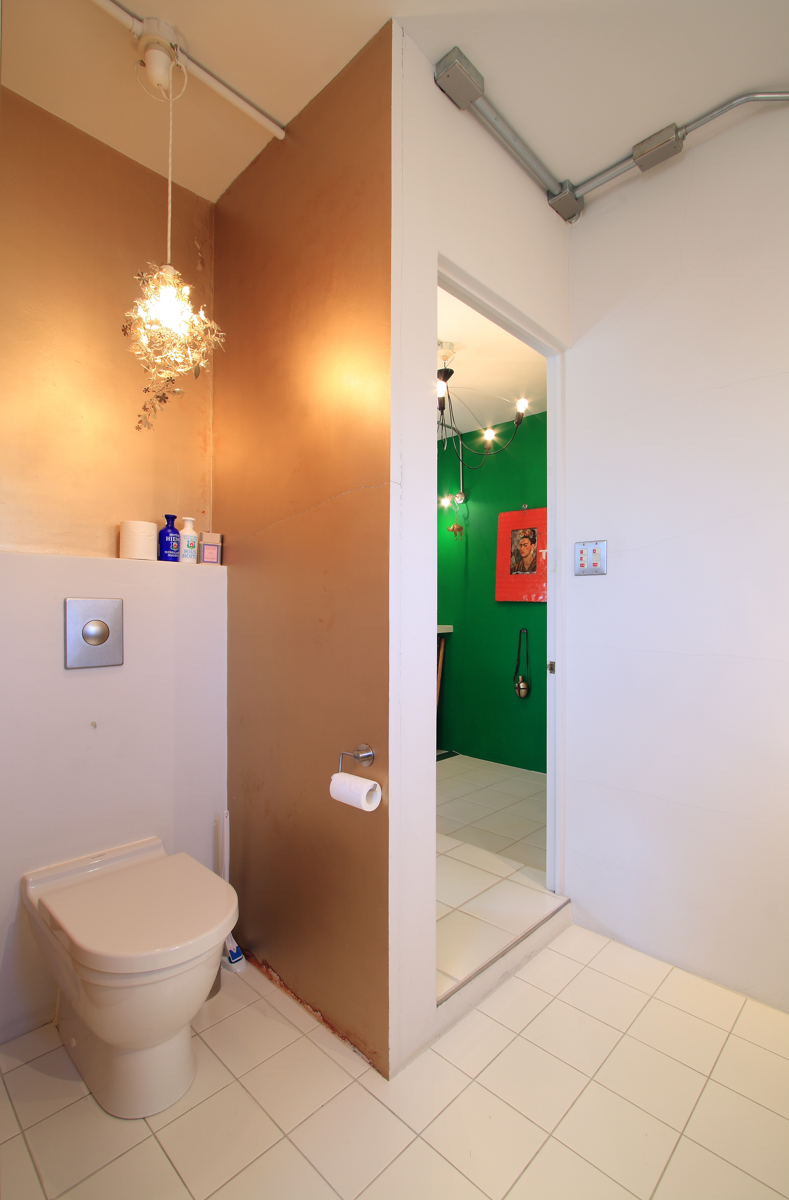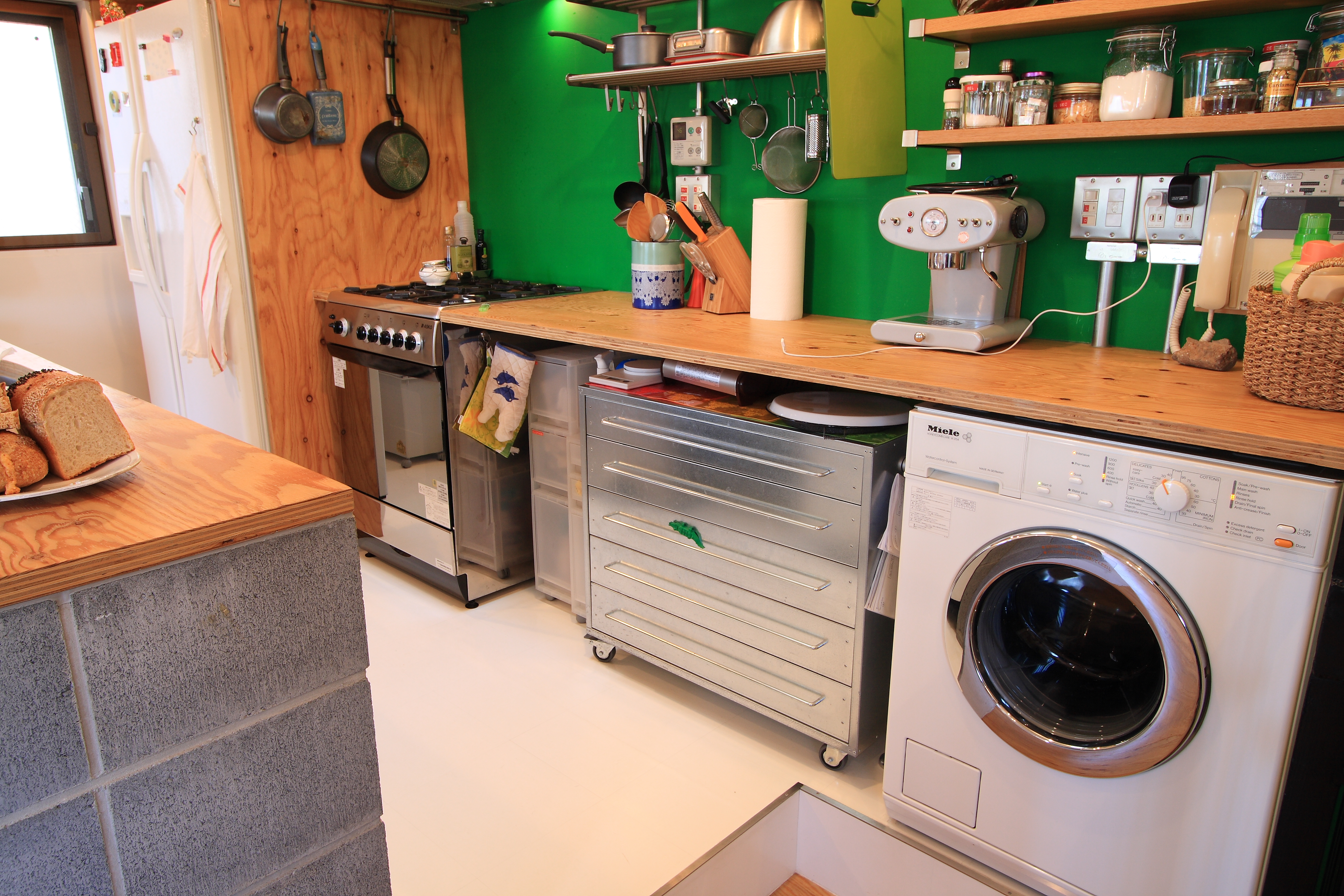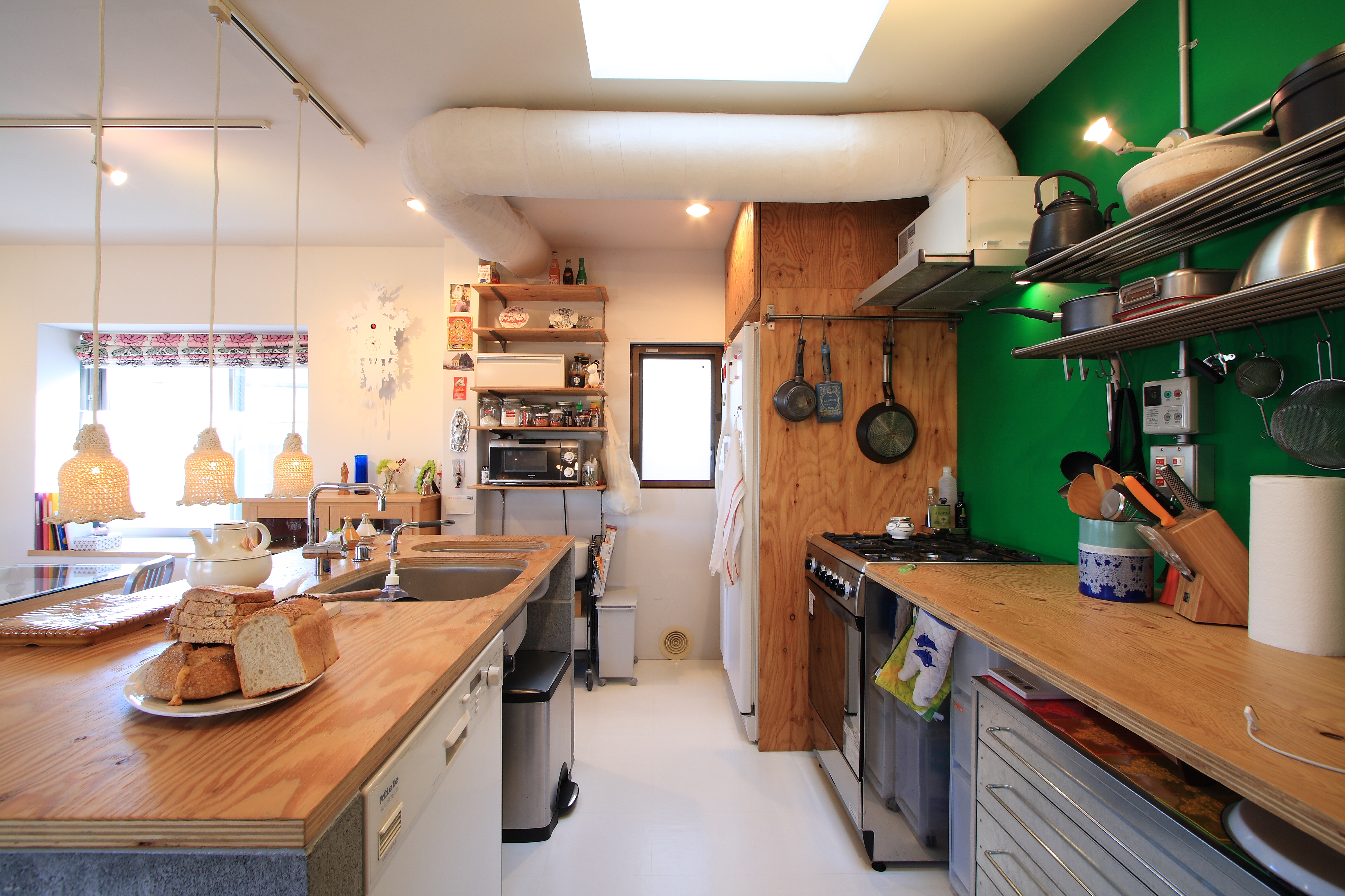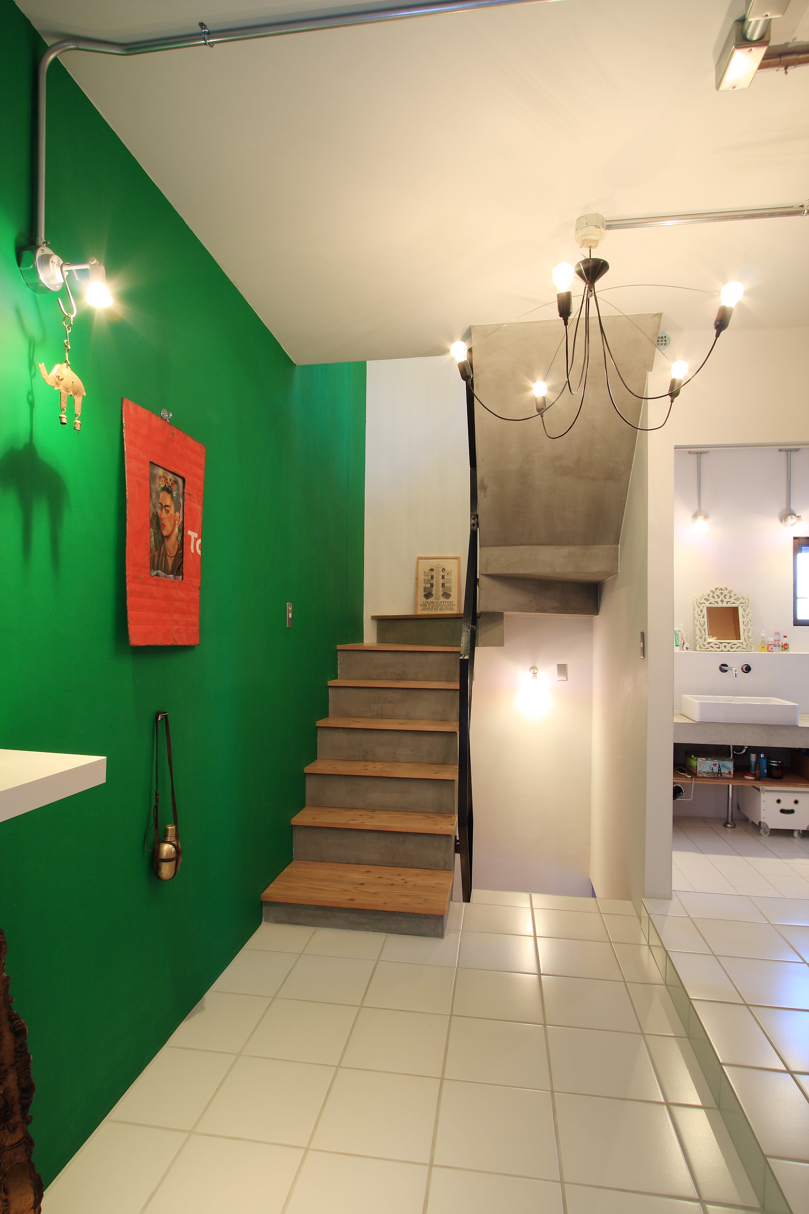 各階に繋がるグリーンの壁と水廻りのアクセントとなっているゴールドの壁は、施主こだわりの色を自ら塗装し、犬の留守番のためのエリアや落下防止を兼ねて閉じることもできる手すりなど、いろんなところに犬も人も安心して暮らせる工夫を盛り込んでいます。