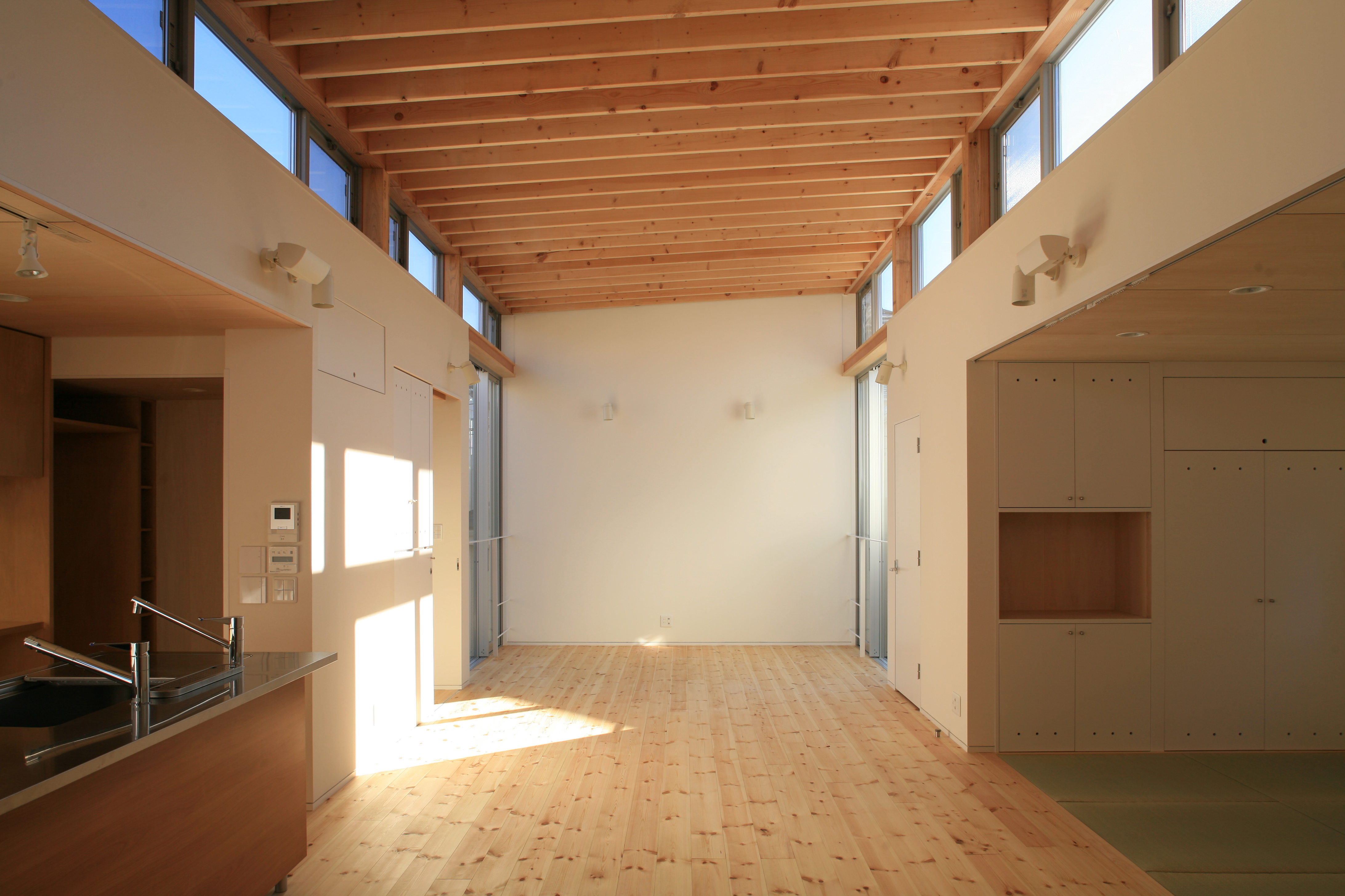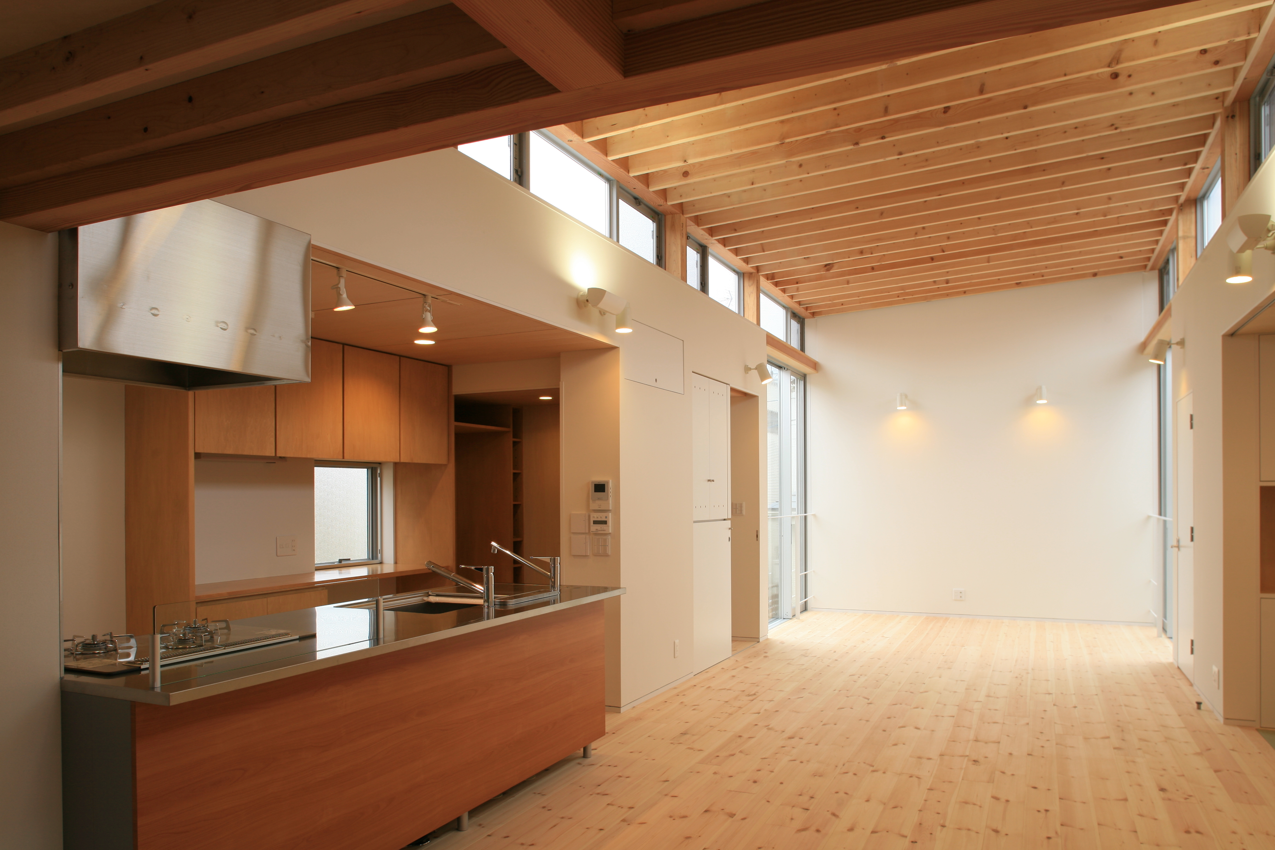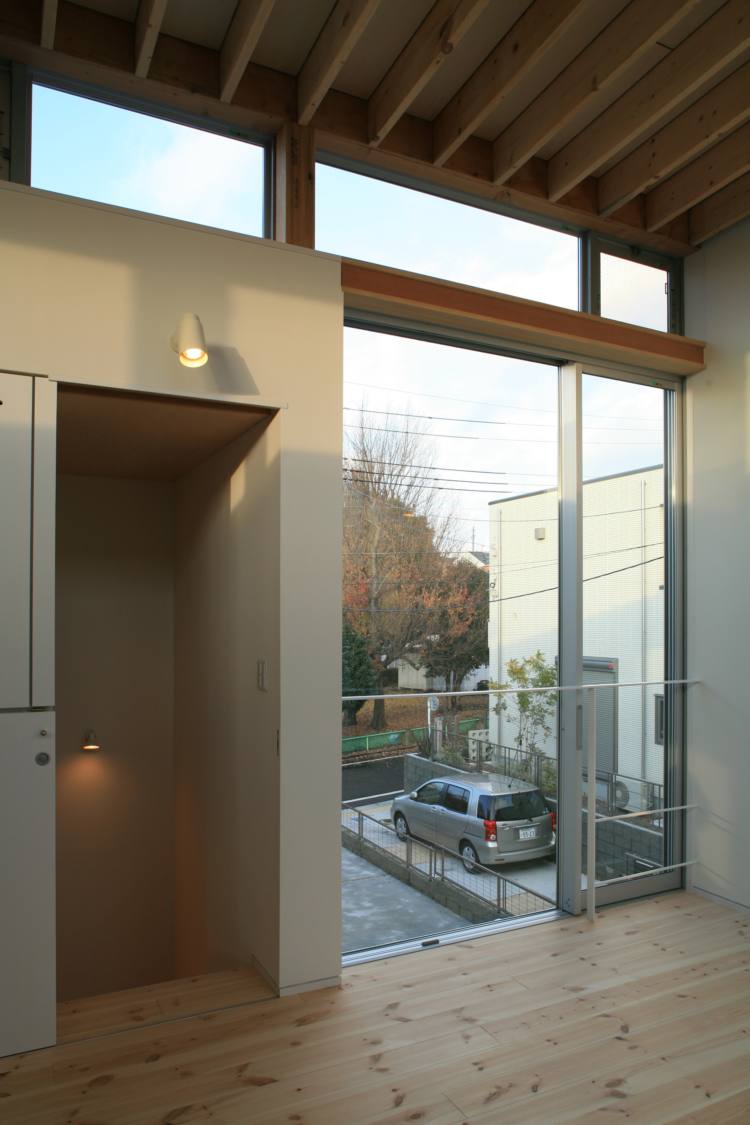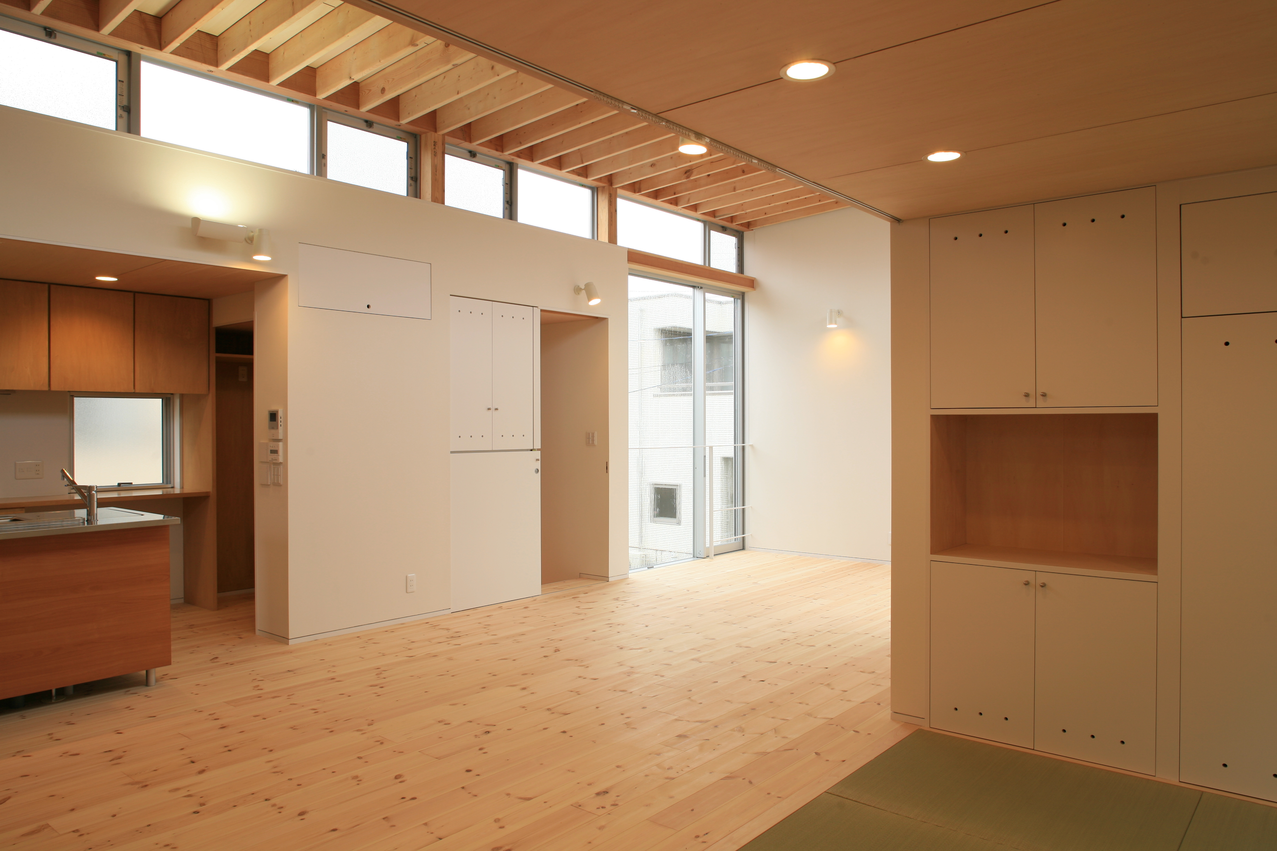 2階のLDKはハイサイドサッシを採用して周囲に影響されない明るさと風を取り込む生活を作り、リビングの東には旗竿入口の竿敷地から通り対面の緑の公園を臨むインナーテラスを作り、そこの大開口を開放することで、リビングにいながらも外部のテラスのような開放感を楽しめるようになっています。