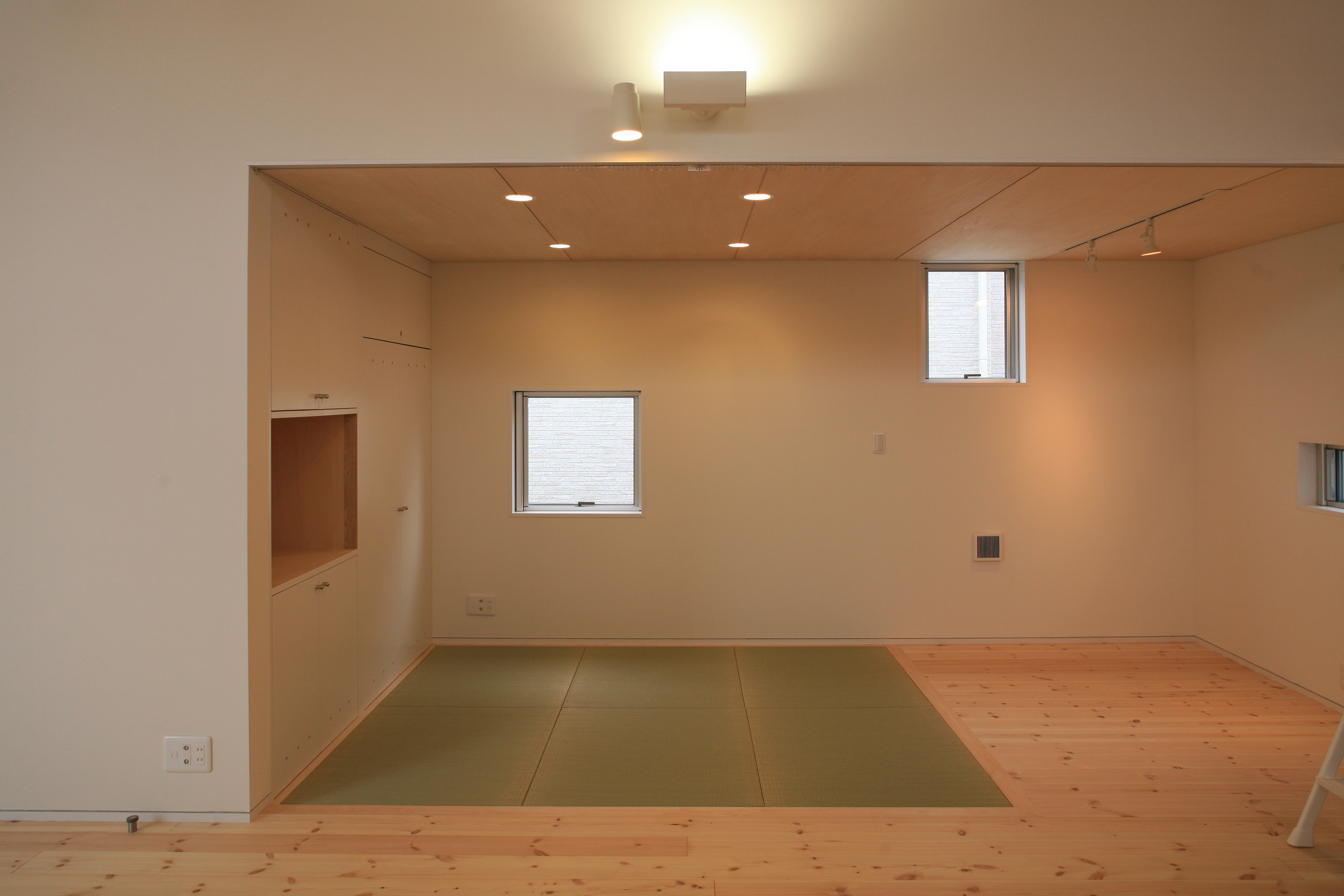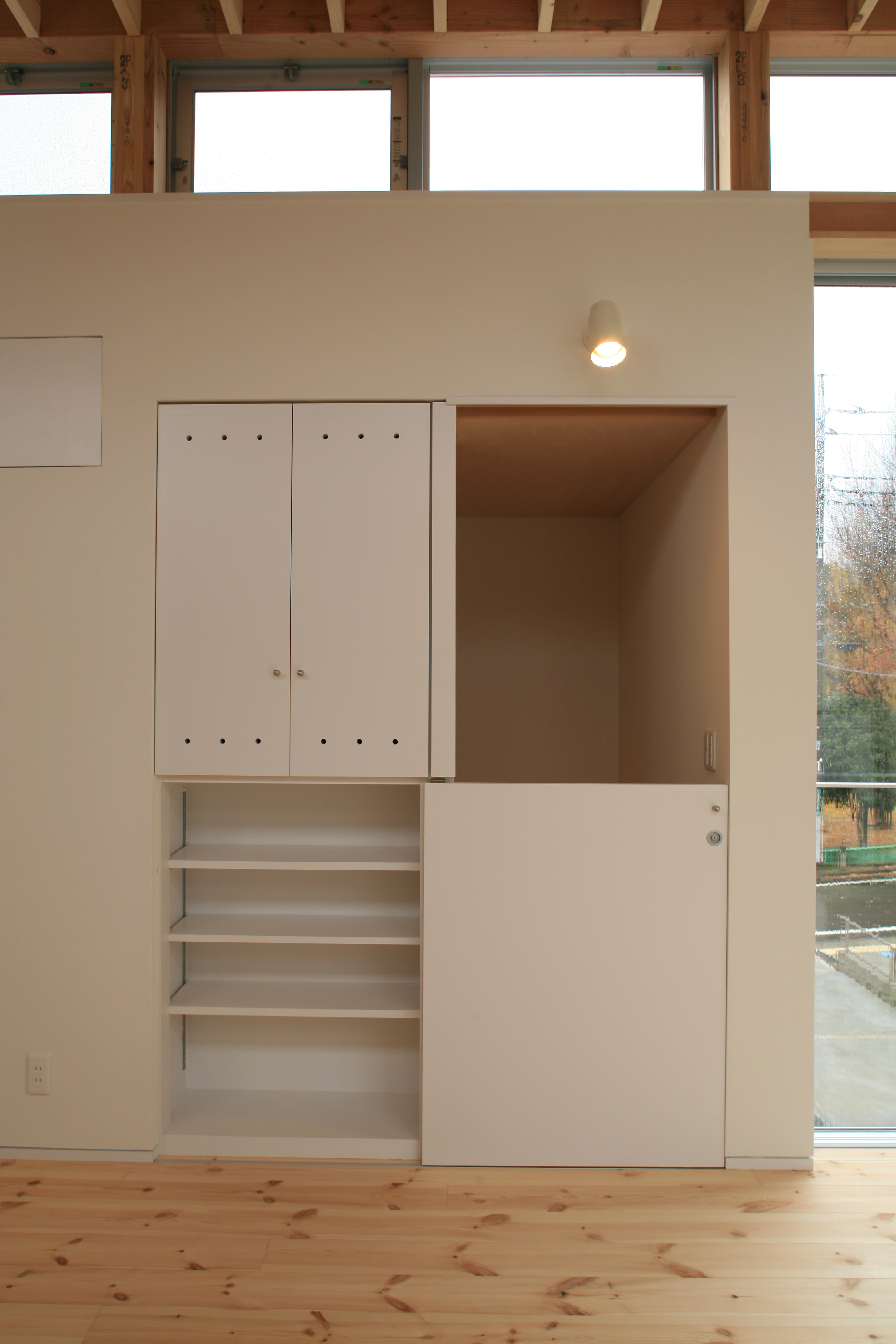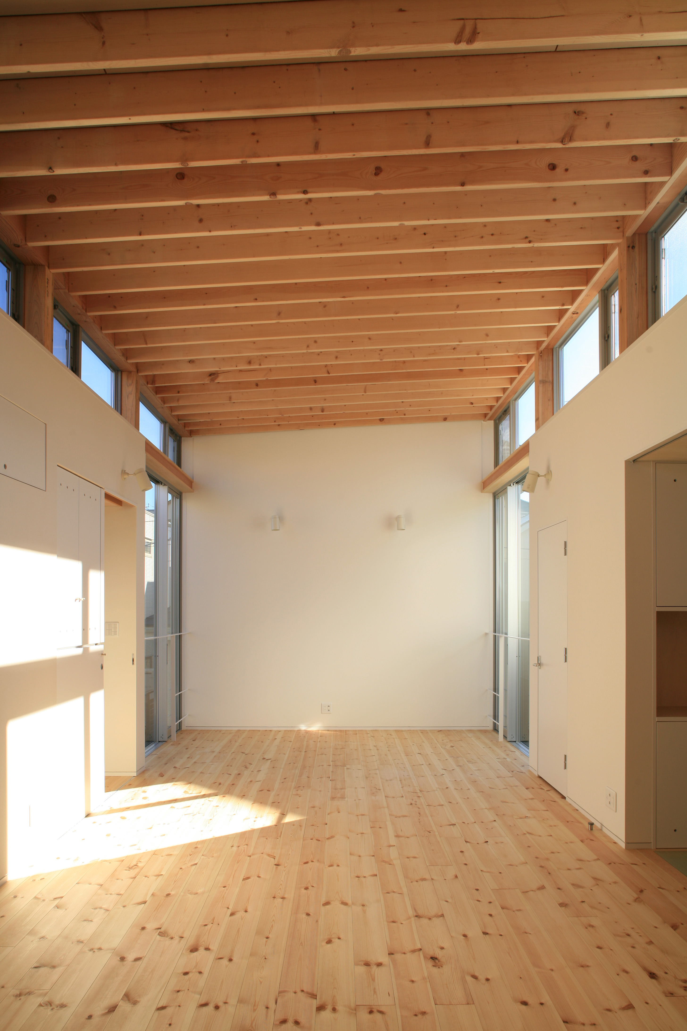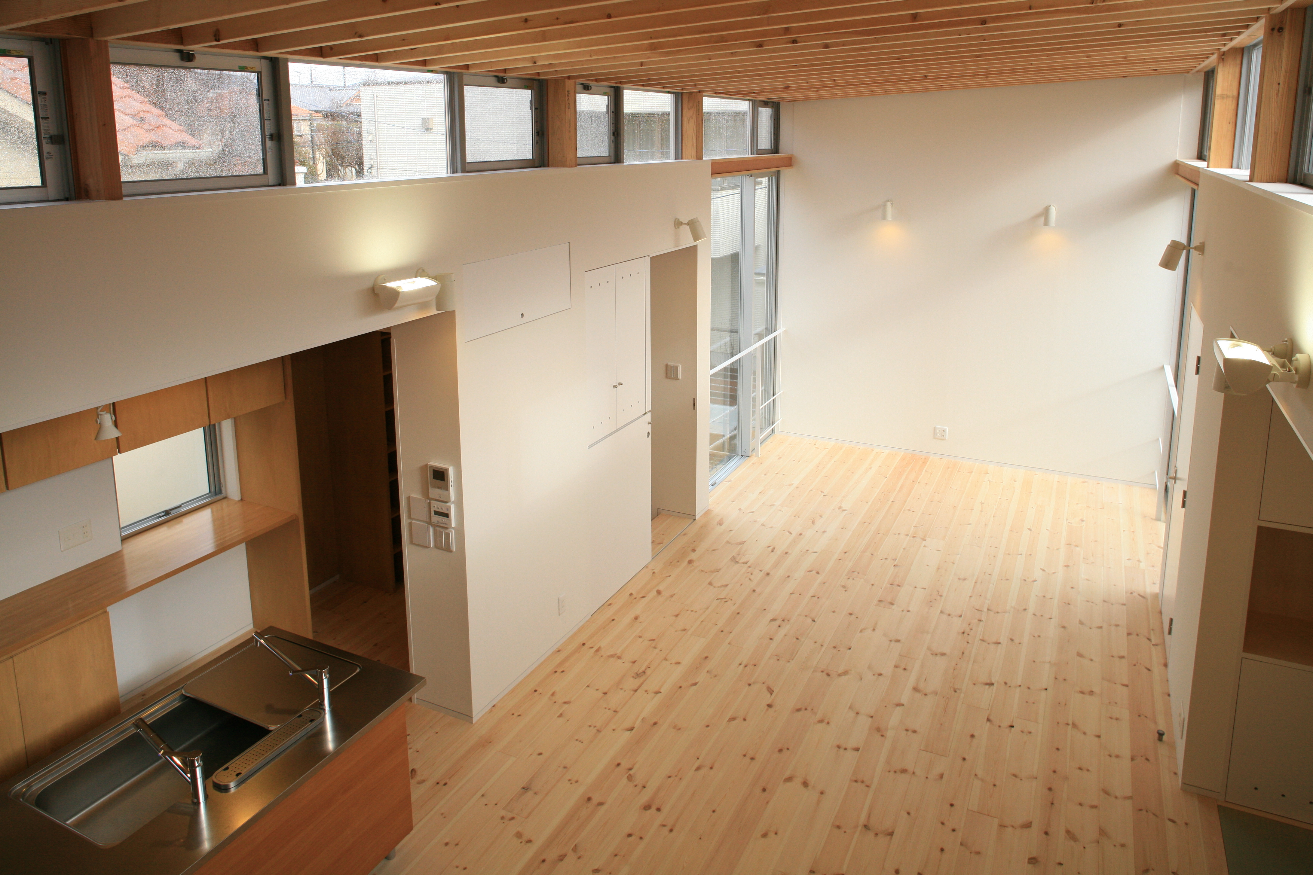 2階のLDKはハイサイドサッシを採用して周囲に影響されない明るさと風を取り込む生活を作り、リビングの東には旗竿入口の竿敷地から通り対面の緑の公園を臨むインナーテラスを作り、そこの大開口を開放することで、リビングにいながらも外部のテラスのような開放感を楽しめるようになっています。